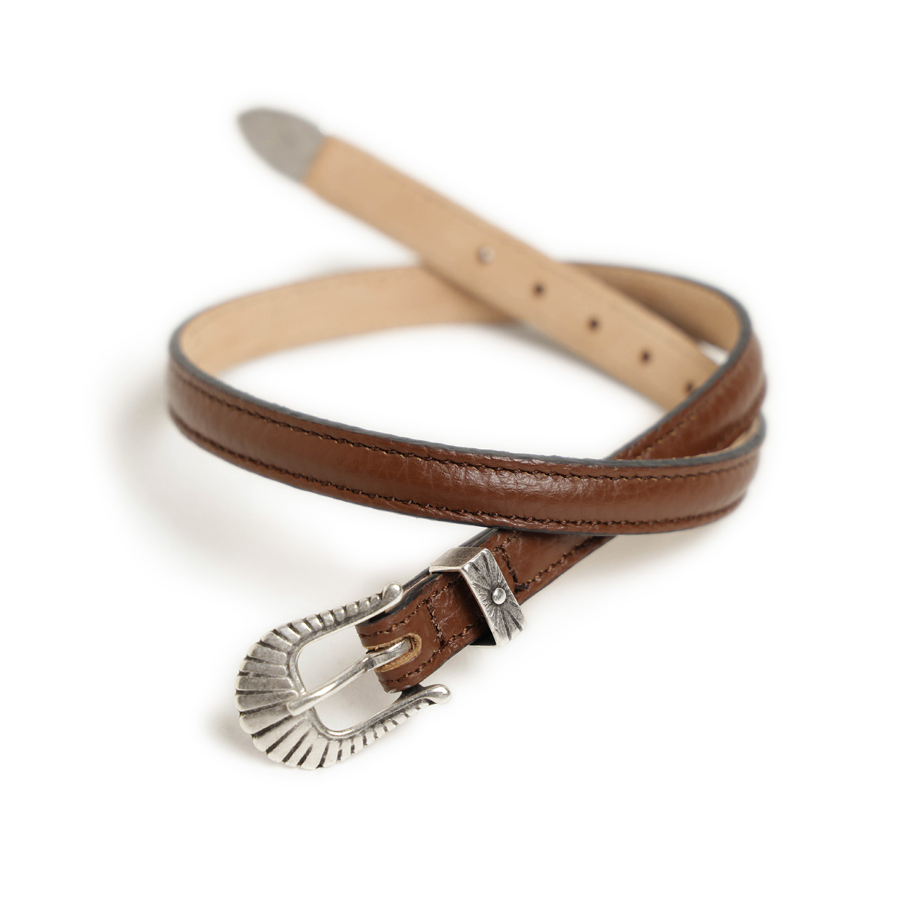 ハンドメイドならではのクラフト感を程よく香らせながらも、どこかモダンで洗練されたオーラが漂う“ADRIANO MENEGHETTI”。ネイティブなデザインが施されたバックルとチップが、カジュアルはもちろん、ドレススタイルのハズしには持ってこいのこなれた一本です。