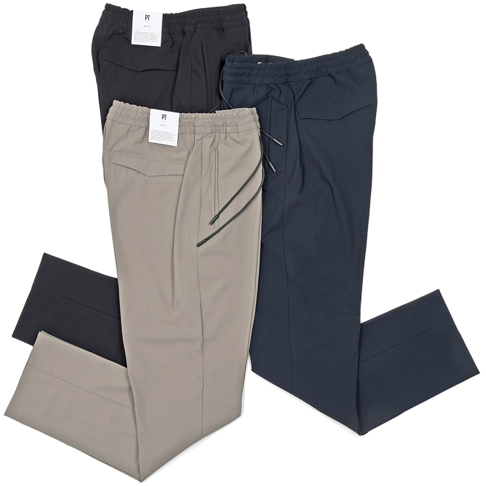 モデル“OMEGA”はドローコードが付いたシャーリングパンツ。Activeシリーズの中ではワタリや裾幅に少しゆとりを持たせたフィッティングは、カジュアルなスタイリングには打って付けなリラックス感が漂います。PT TORINOらしい美しいシルエットが上品さを維持しつつ、実用的なシャーリングパンツに仕上がっています。