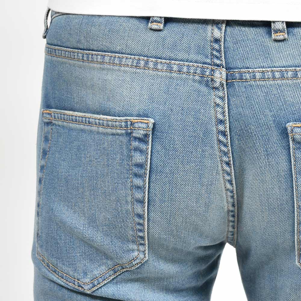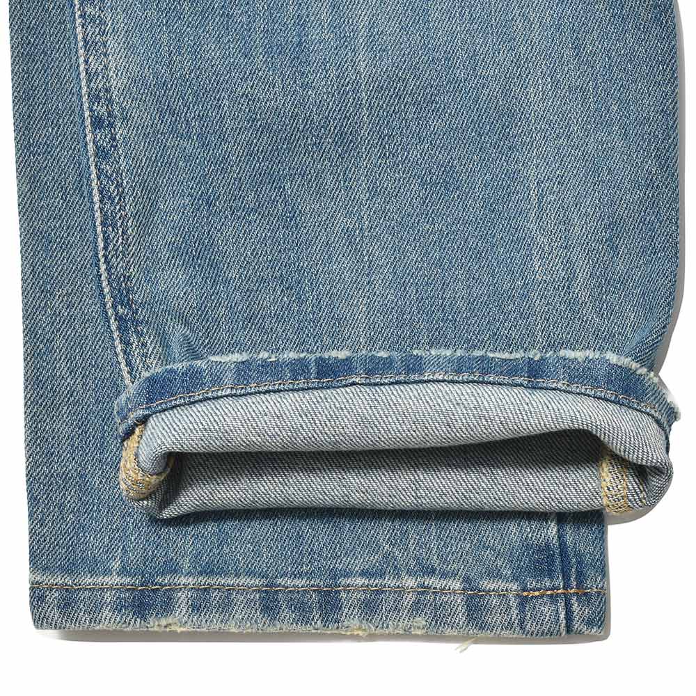 しっかりとストレッチの効いたコットン主体のファブリック。ライトなトーンまでウォッシュド加工を施したインディゴデニムは、ヴィンテージ加工によって少し黄味がかったブルーが雰囲気のある仕上がり。また、燻んだゴールドのヴィンテージ風なボタン&リベットに、ブラウンのステッチが本格的な風格を漂わせます。さらにサスティナブルな紙素材の白いパッチが、上品でシックな大人の佇まいになります。