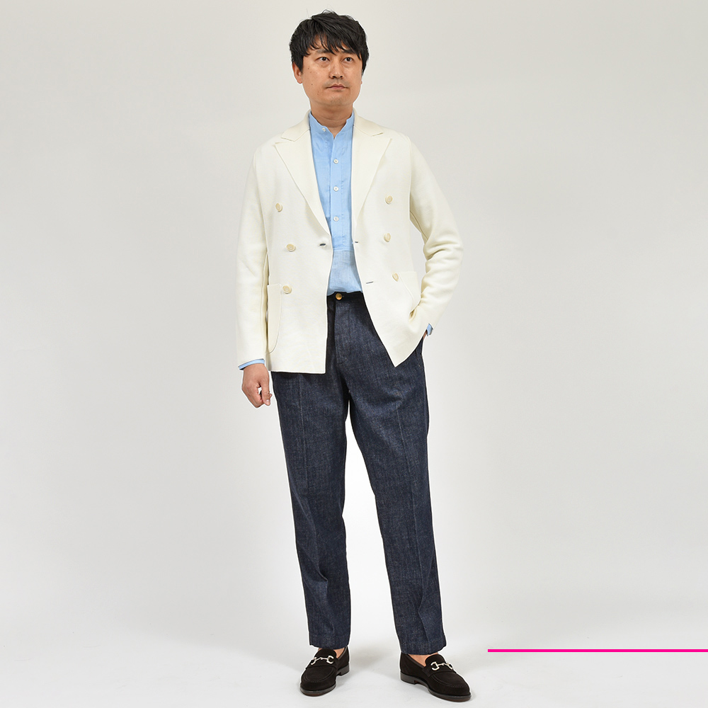 PREPPY FITはワタリから膝にかけて少しゆとりを持たせることで程よくリラックス感があり、膝から下はテーパードを効かせたシルエットが抜け感がありつつも大人の表情を作り上げてくれます。