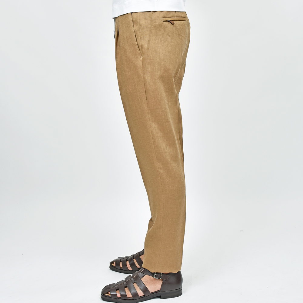 目付け270gのライトウエイトなリネン素材を使用したこちらは、季節感を演出してくれる清涼感を持ちます。リゾートのイメージがあるリネンのシャーリングパンツですが、リラックス感がありつつも美しいフィットに、飴色のようなブラウンカラーが色気のある雰囲気に。また、大人のためのリラックスパンツを謳う“SOFT FIT”ですので、リラックスした雰囲気を高めてくれ
