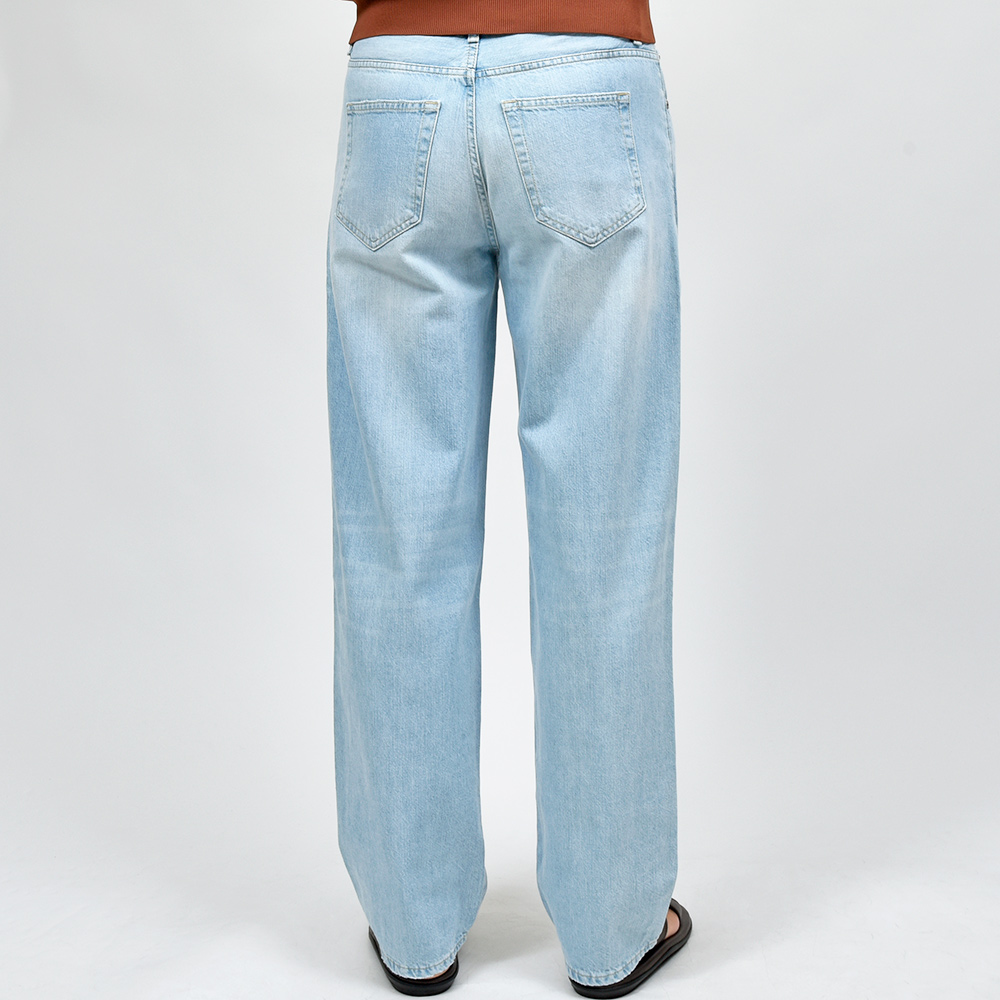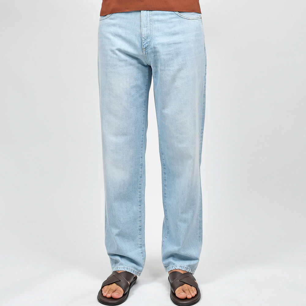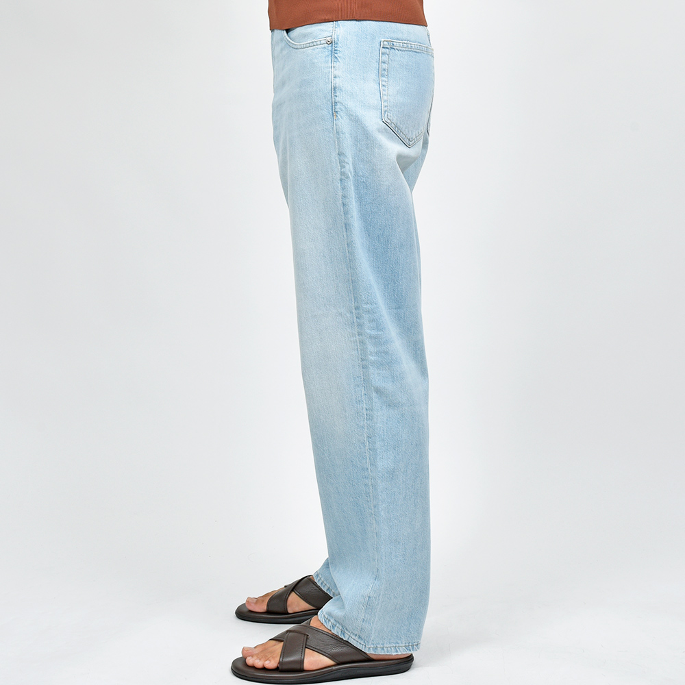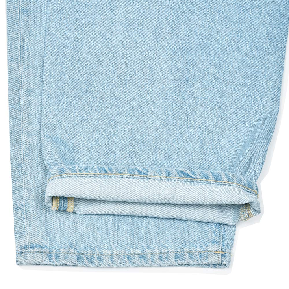 サイズ32でジャストサイズです。股上が深く、ヒップやワタリはゆとりのあるフィッティング。裾にかけて気持ちテーパードしていますがワイドなシルエットです。ライトインディゴブルーにワイドシルエットが爽やかなデニムです!