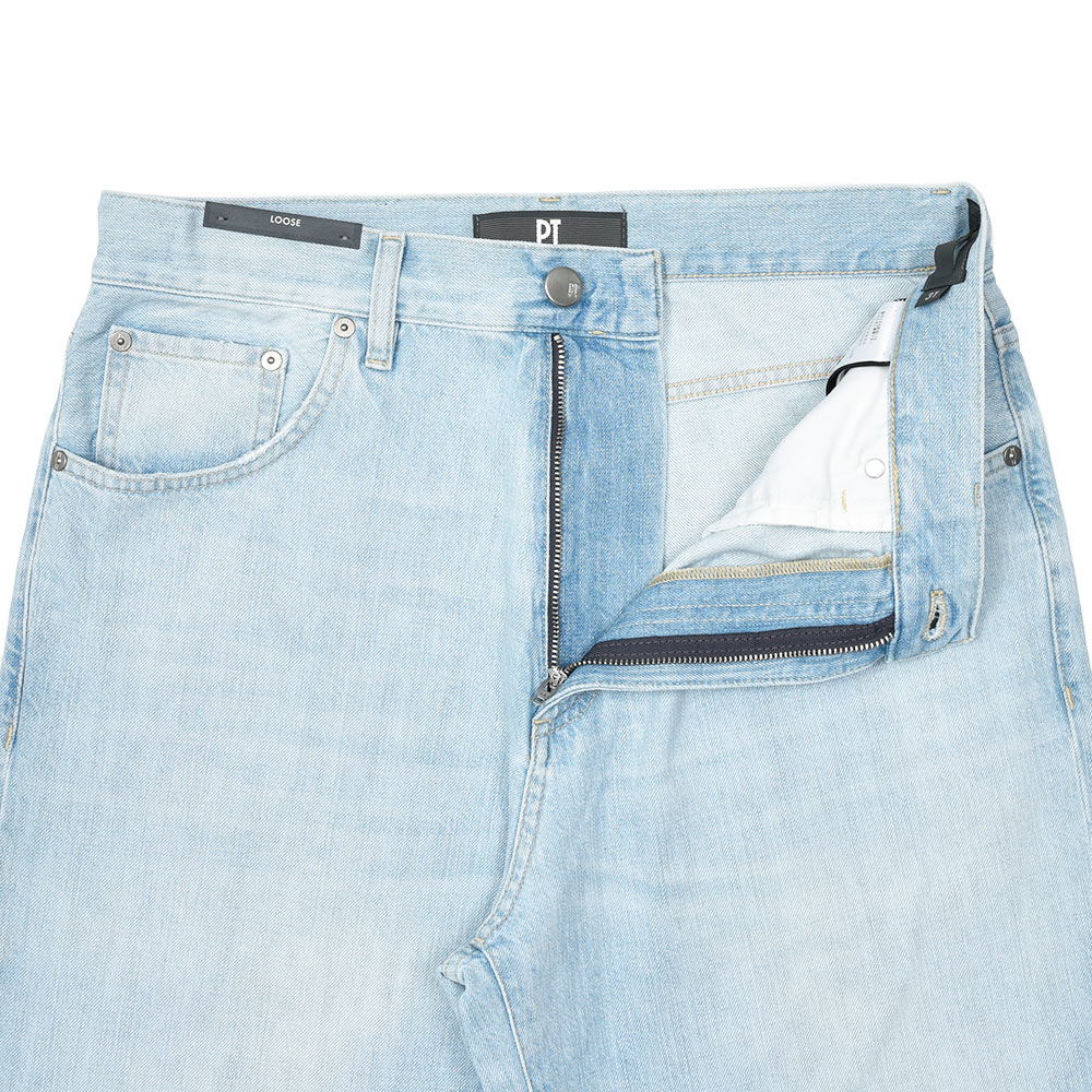 PT TORINO DENIMでは非常に稀なストレッチなしのコットン100%ファブリックを使用したこちらは、今シーズン新登場したワイドめなシルエットのモデル“RAP”。ブリーチ加工を施したライトなトーンのブルーデニムは、抜け感のあるカジュアルな雰囲気を作り上げます。シルバーのボタン&リベットに、ベージュ色のステッチ使いは上品な佇まい。さらに高級感のあるスエードの革パッチが大人の色気を演出してくれます。