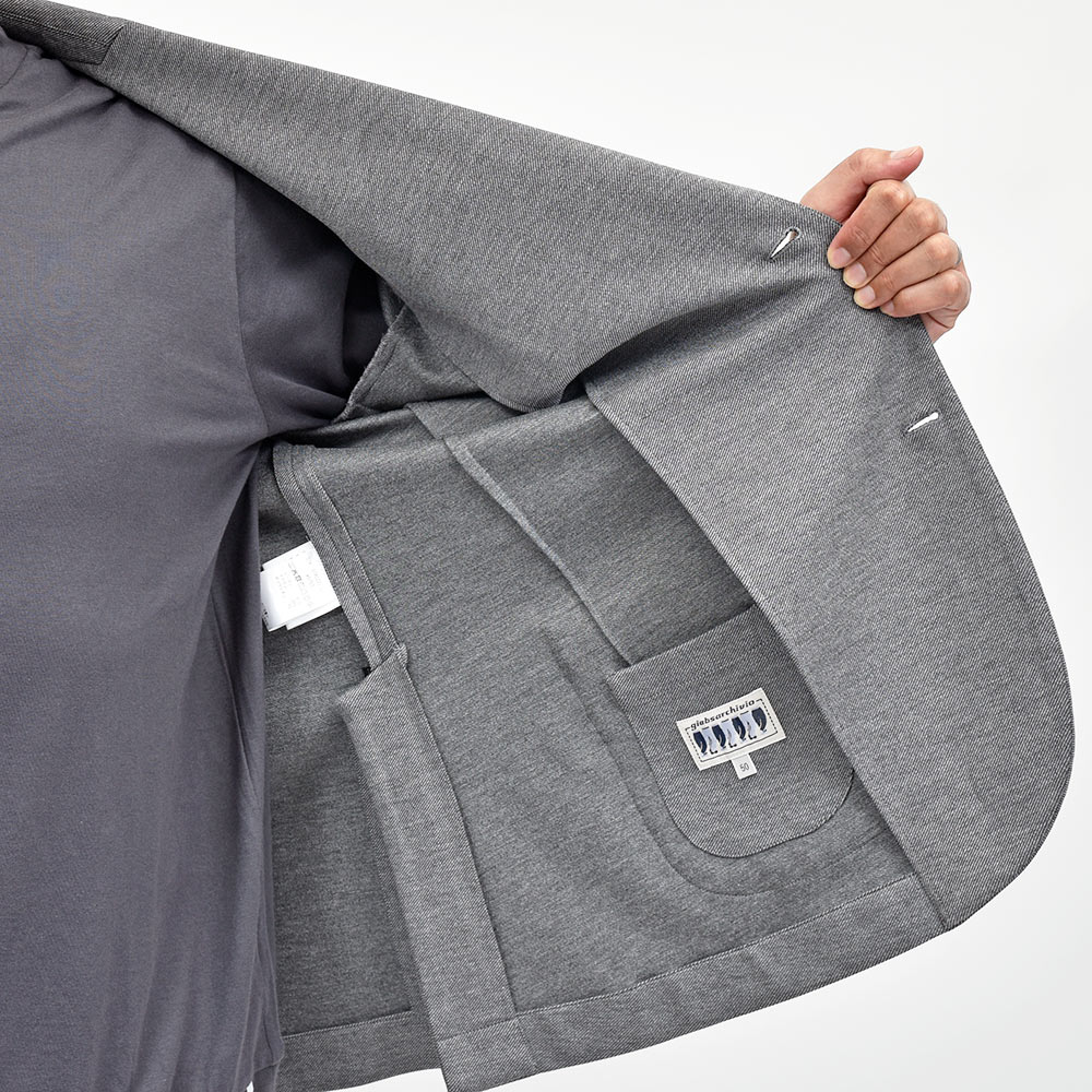 giabsarchivioのジャケットラインのモデル“STROZZI(ストロッツィ)”。イージーなパンツを得意とするブランドですので、ドレスライクなジャケットではなく、アンコンで裏地もない筒袖仕上げで、あくまでも気軽に羽織れる仕上がりとなっています。しかしながら、現代の実情を見ているとこのくらいのジャケットで十分というシーンはよくある事ですので、デザイナーの中新井氏らしい痒い所に手が届く一品です。
