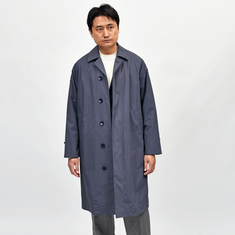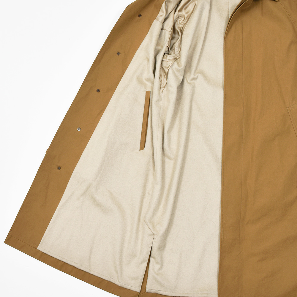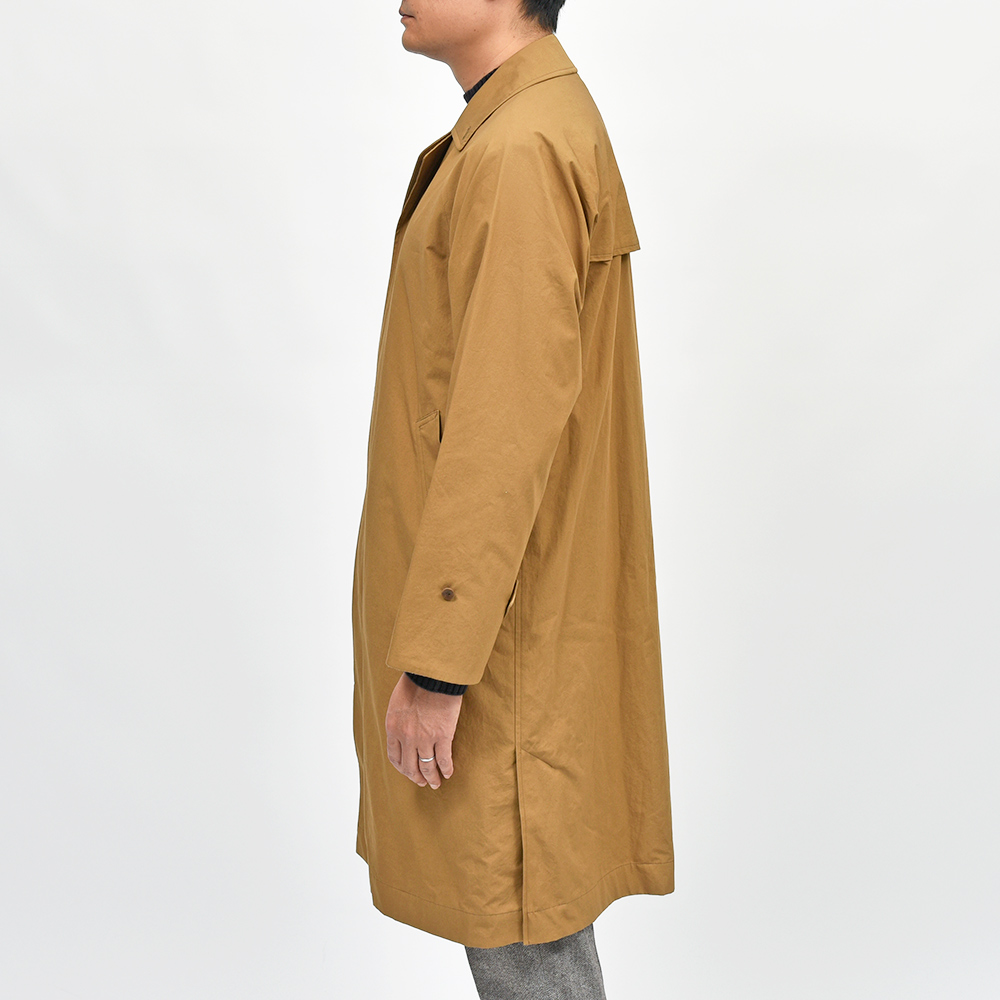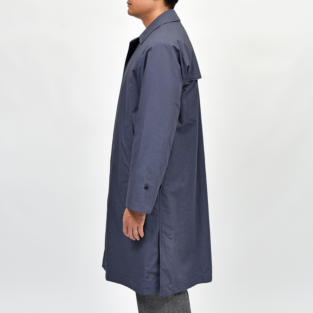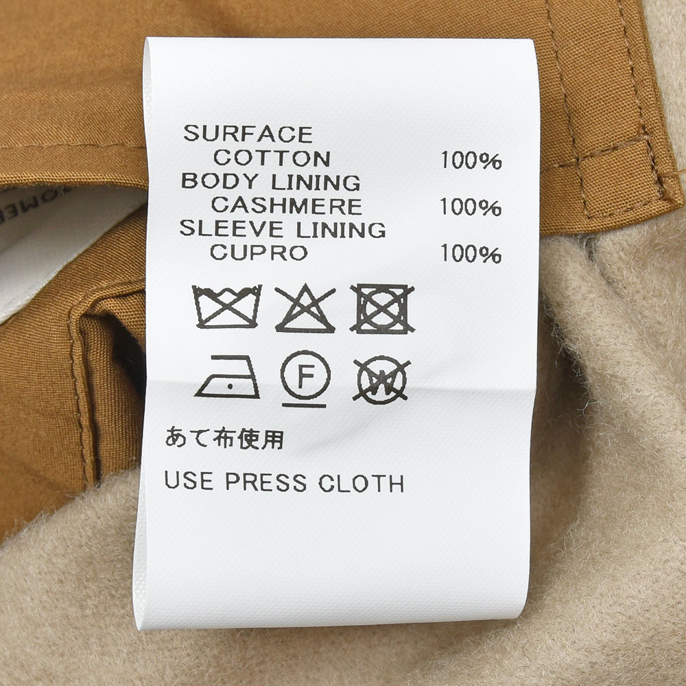 デザイナーである中込憲太郎氏自ら開発に携わる、オリジナルファブリックを使用するCOHERENCE。“COHERENCE Weather Resistant Cotton Light”と名付けられたこちらは、細番手の糸を使用し超高密度に織り上げることで、撥水性能を持つ軽量のコットンポプリン素材となっています。また、表面の凹凸感がサラリとした風合いをもたらしつつも、身頃の裏地にはカシミヤ素材のライニングが取り付けられていることで防寒性を持たせています。軽量で保温性の高いディティールに、ゆったりとしたサイズ感であることで、インナーの調節がし易くインナー次第で秋口から春先までの長い期間で着用できる一着です。