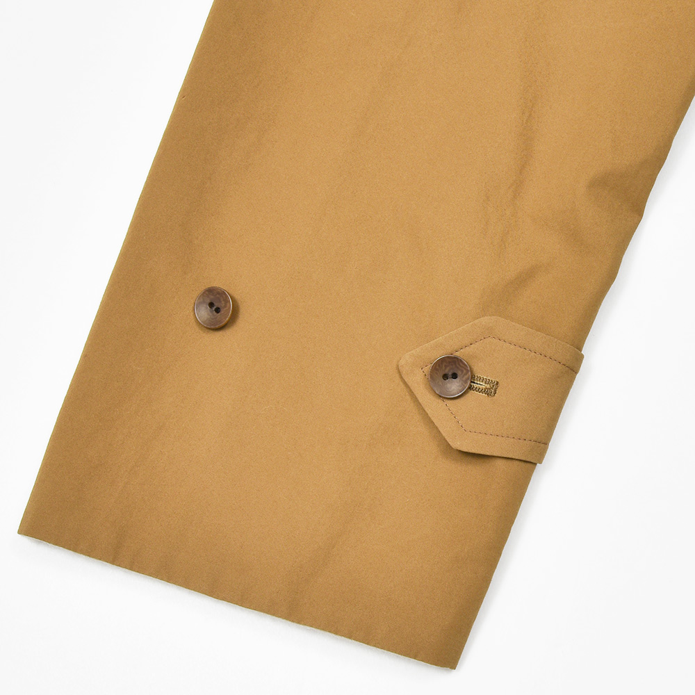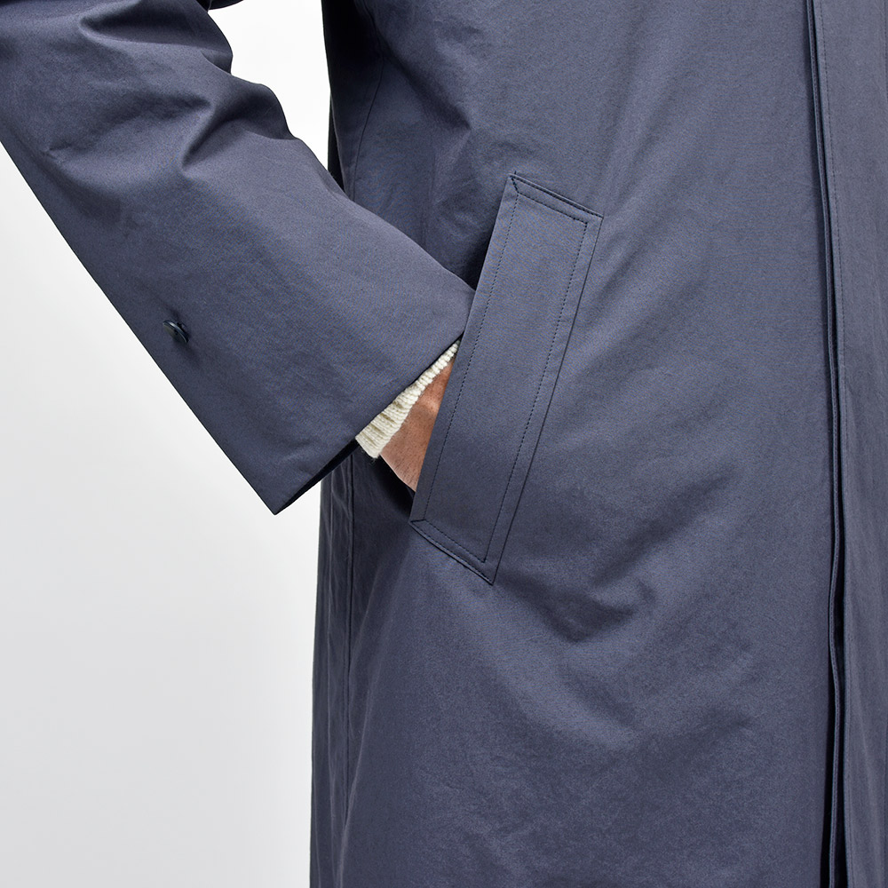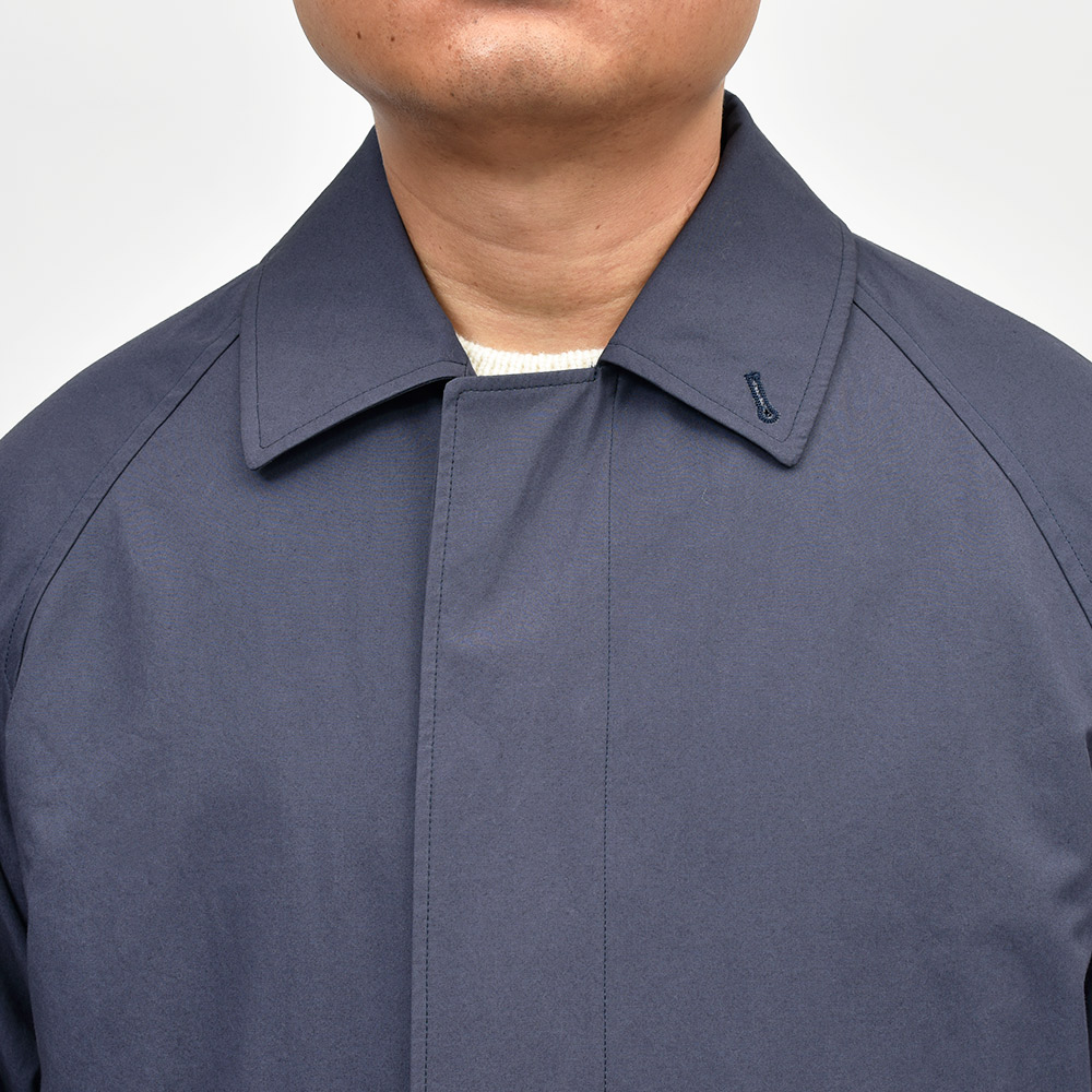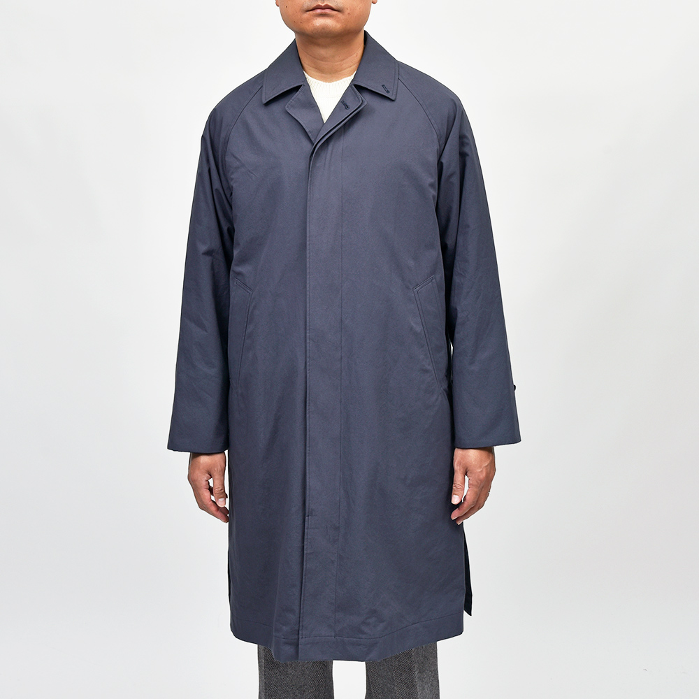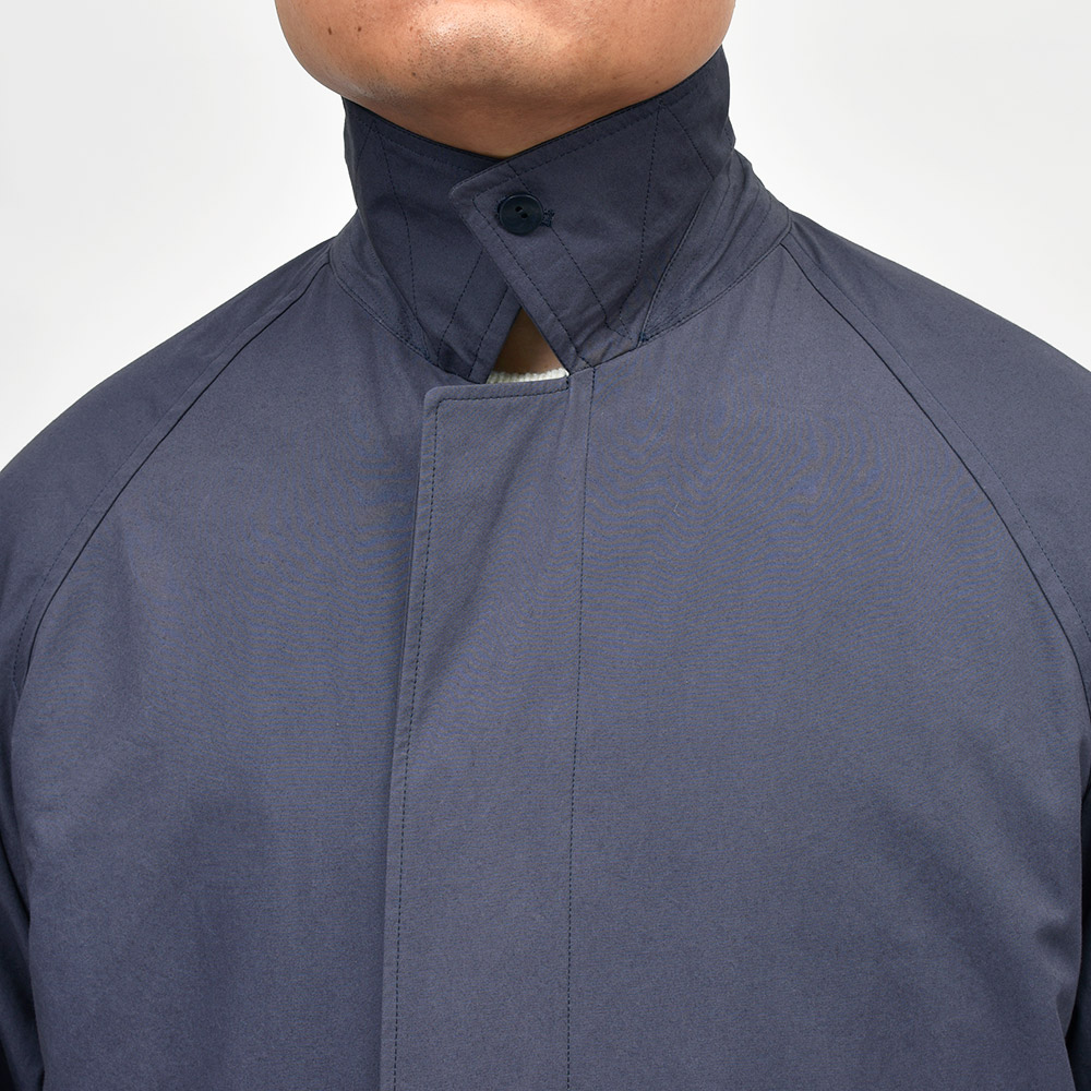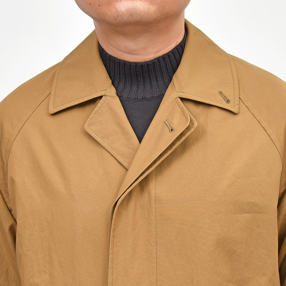 デザイナーである中込憲太郎氏自ら開発に携わる、オリジナルファブリックを使用するCOHERENCE。“COHERENCE Weather Resistant Cotton Light”と名付けられたこちらは、細番手の糸を使用し超高密度に織り上げることで、撥水性能を持つ軽量のコットンポプリン素材となっています。また、表面の凹凸感がサラリとした風合いをもたらしつつも、身頃の裏地にはカシミヤ素材のライニングが取り付けられていることで防寒性を持たせています。軽量で保温性の高いディティールに、ゆったりとしたサイズ感であることで、インナーの調節がし易くインナー次第で秋口から春先までの長い期間で着用できる一着です。