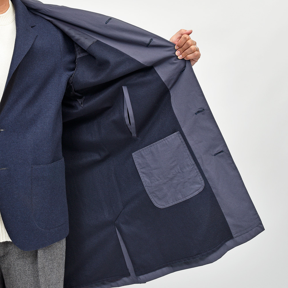 モデル“RUIZ(ルッツ)”はスペイン・マラガ生まれの芸術家、パブロ・ピカソが来ていたコートからインスピレーションを受けたモデルになります。彼の1948年のポートレートを中心に、彼が着用していたその他いくつかのオーバーコートのディテールと、同時代のミリタリーレインコートに見られる、背のケープと袖が一体となった“ヨークスリーブ”を組み合わせて再構築しました。RUIZ-FLCでは、身頃裏に柔らかいタッチのカシミヤライニングが取り付けられています。