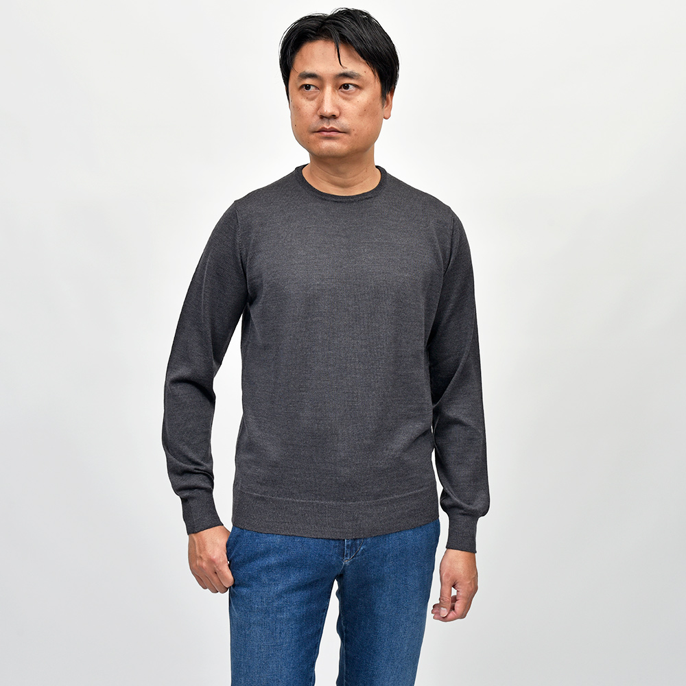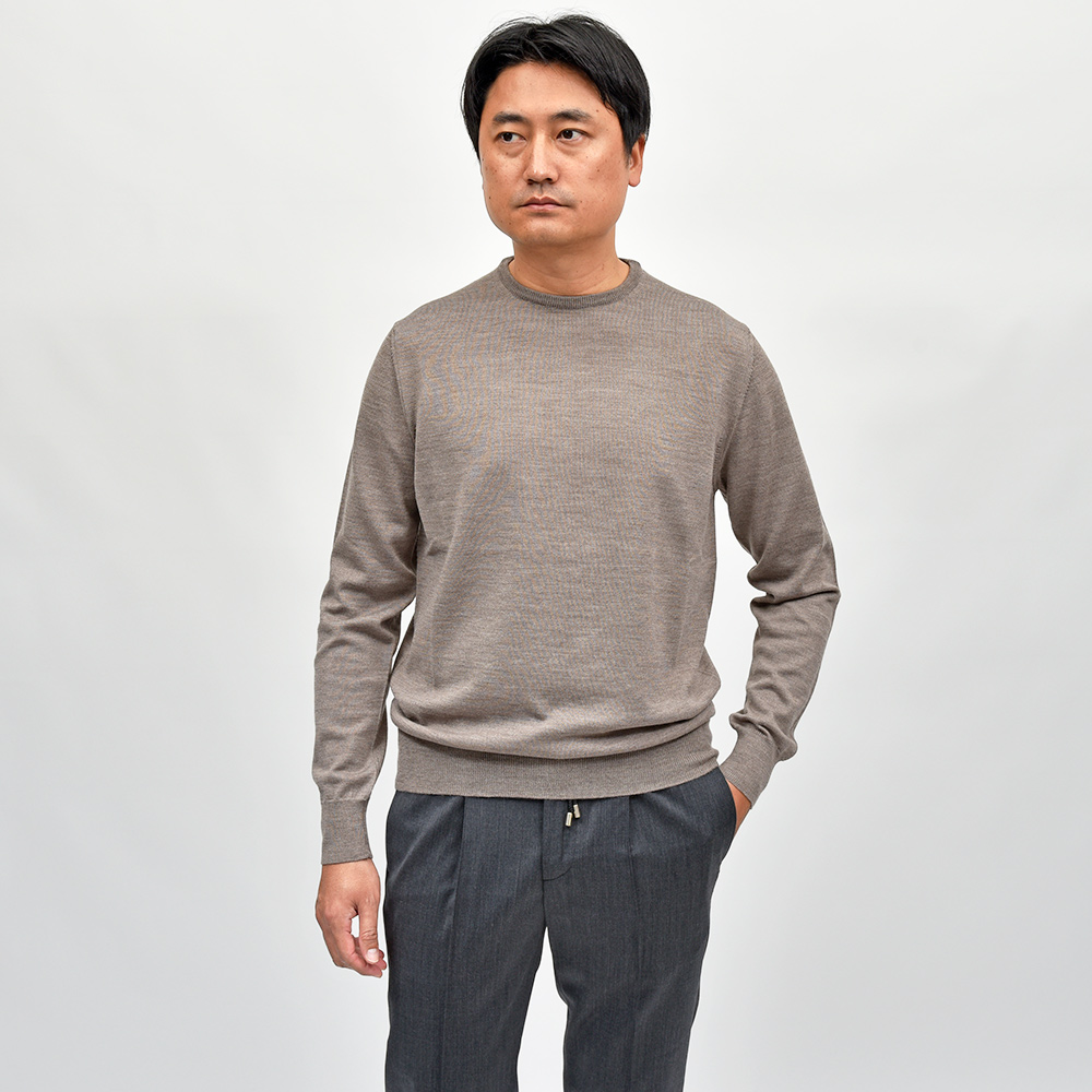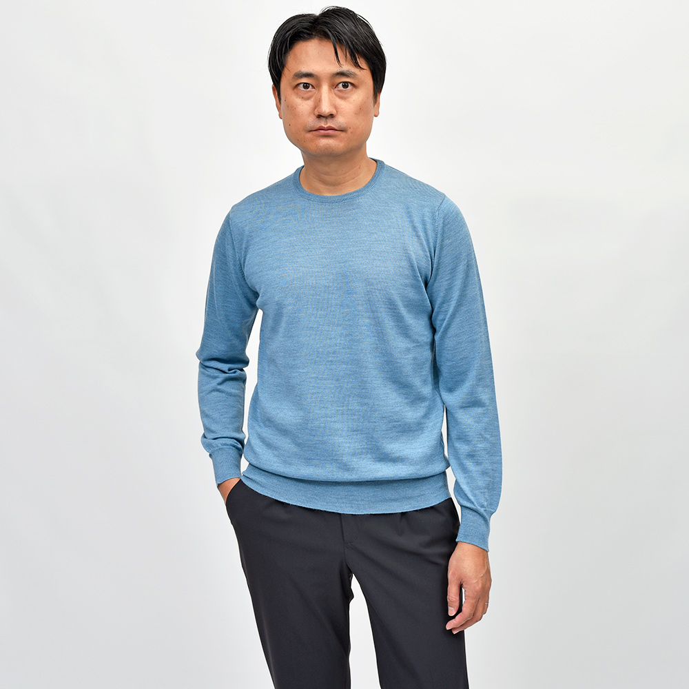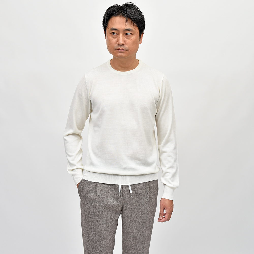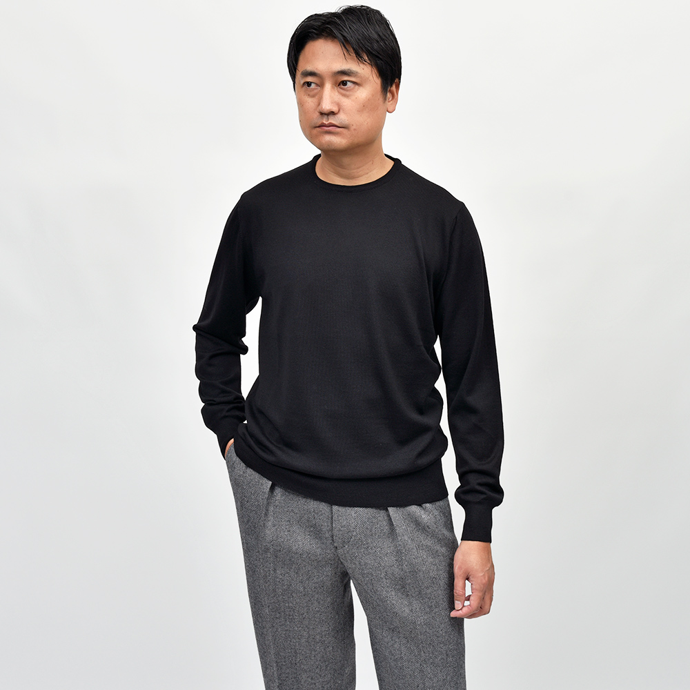カジュアルな印象のあるクルーネックですが、この質感であれば品のあるスタイルが完成します。