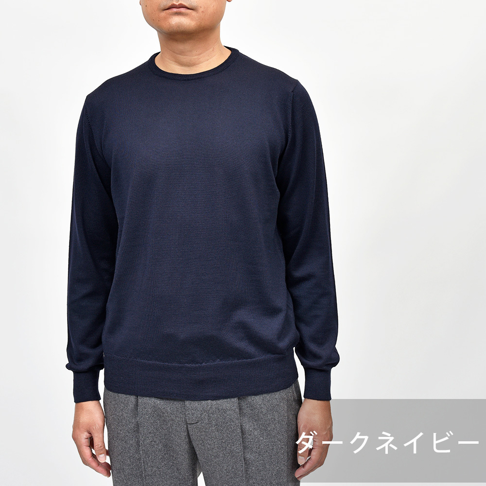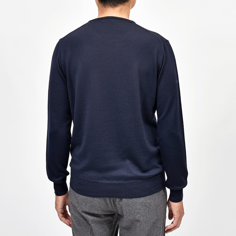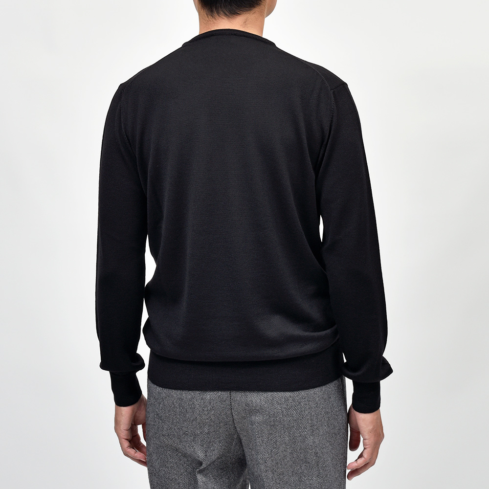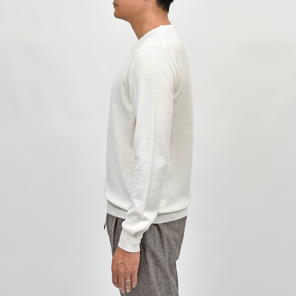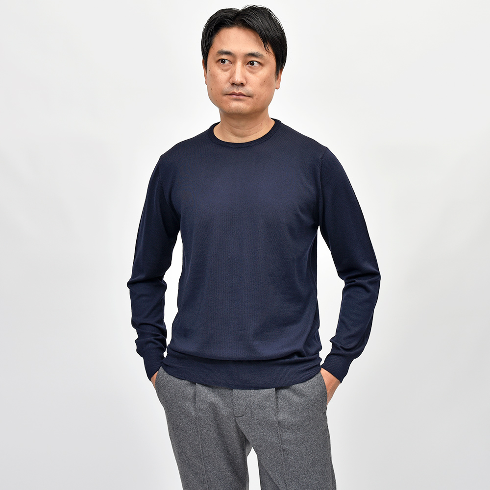 美しい艶感と非常に滑らかなタッチが特徴のエクストラファインメリノウールを使用したハイゲージニット。やや肉感のあるハイゲージですので、インナーは勿論サイズアップして少しゆとりを持って一枚で着ても映える一着となっています。
