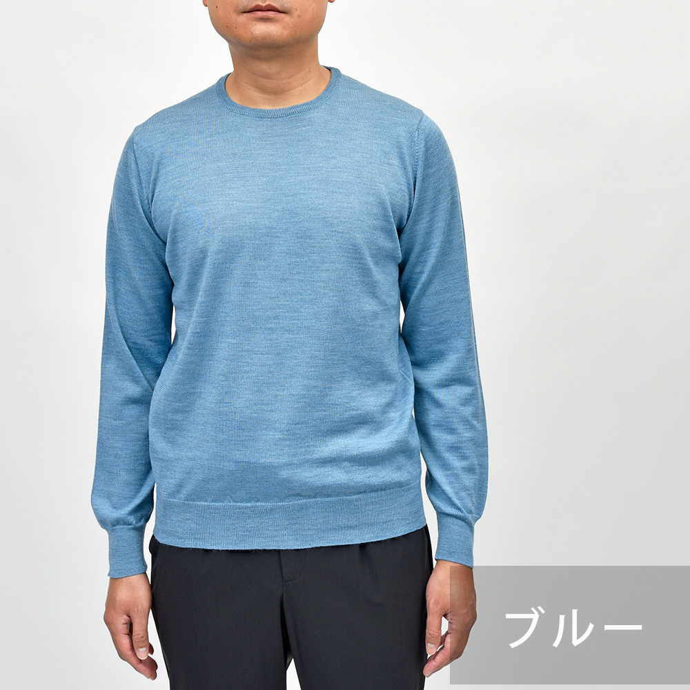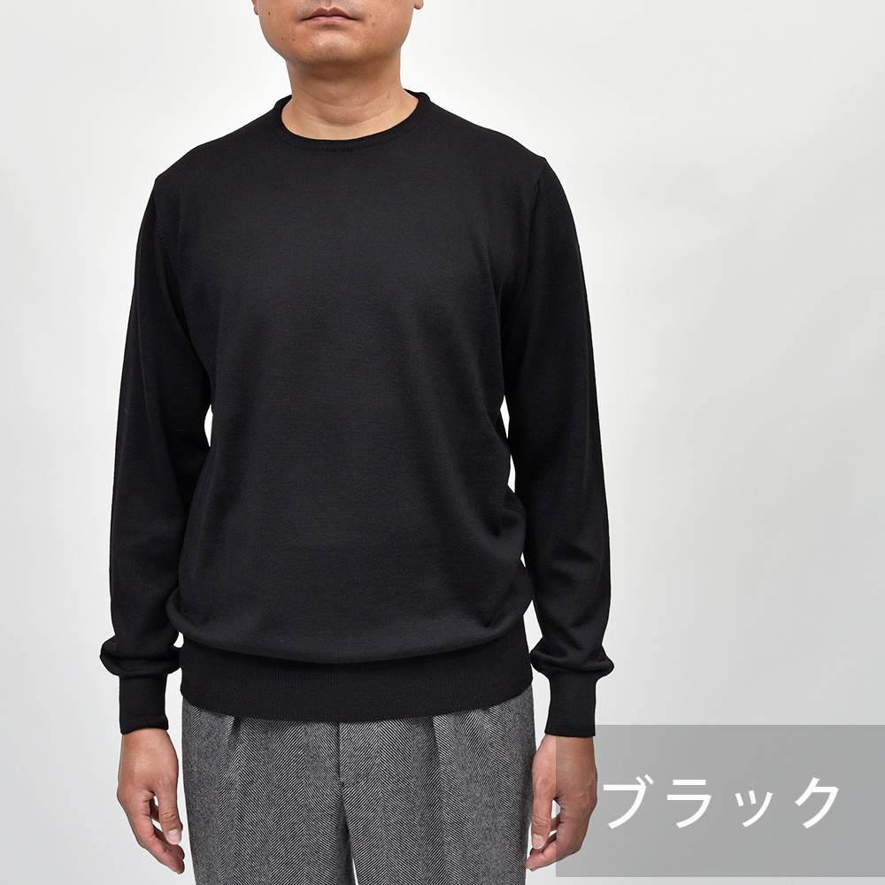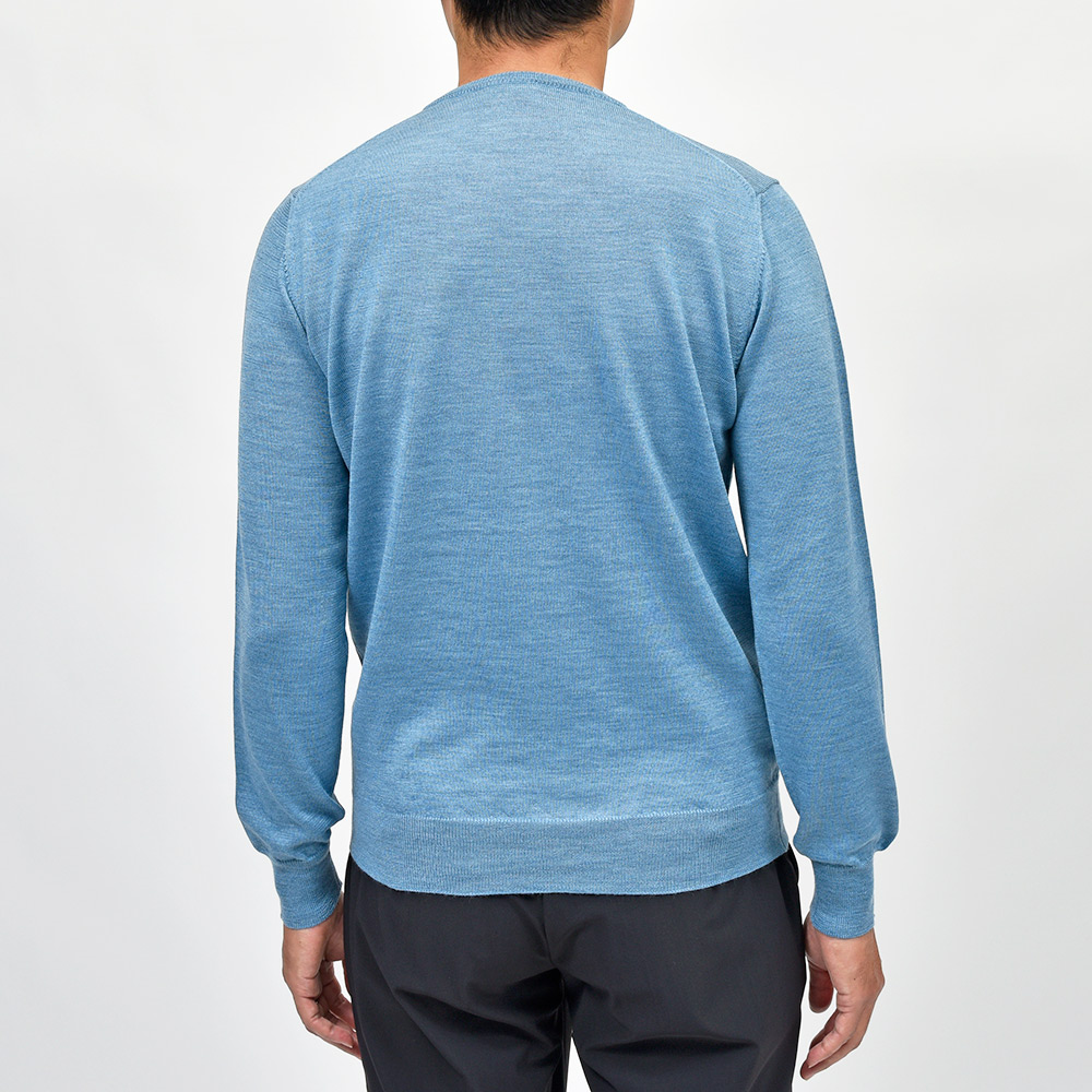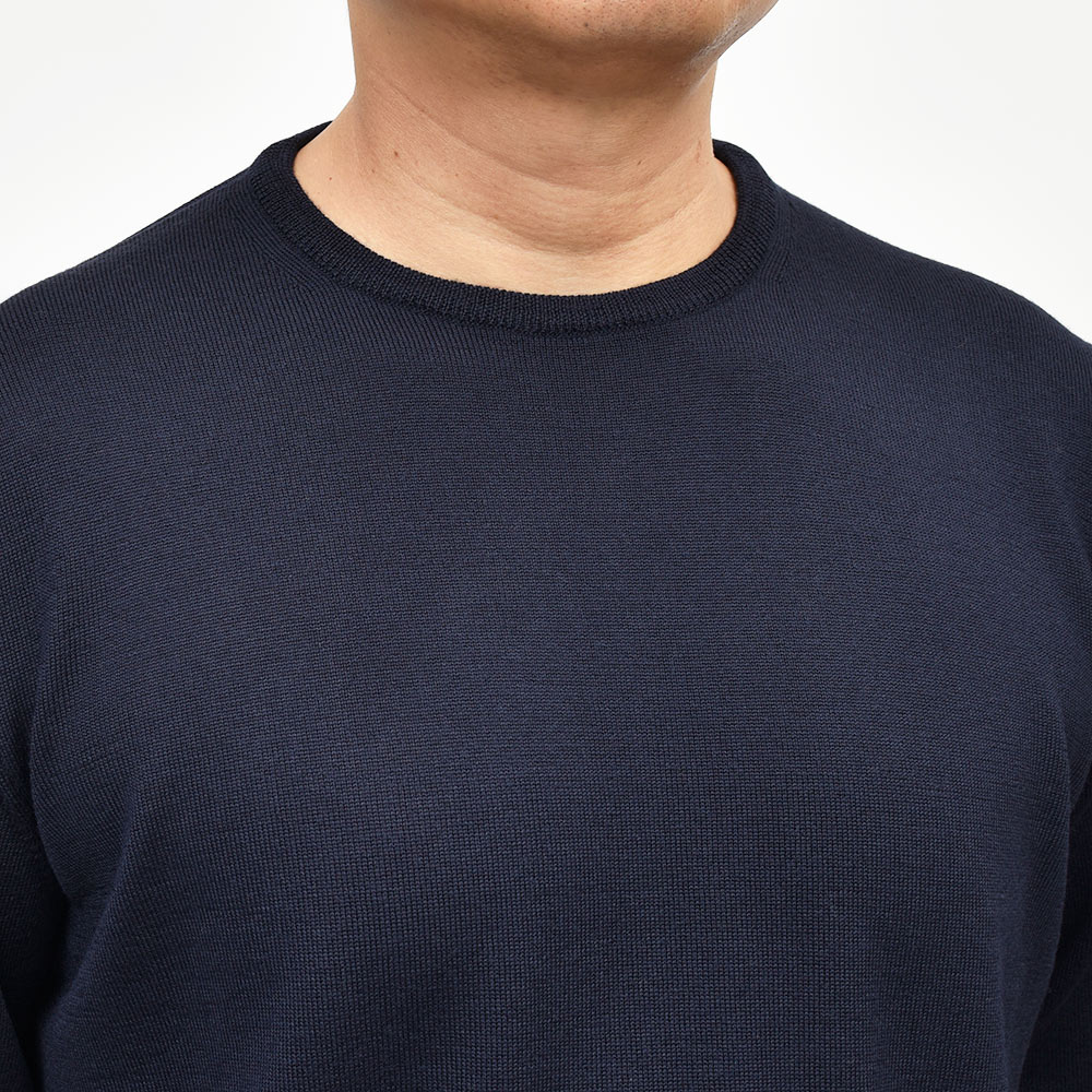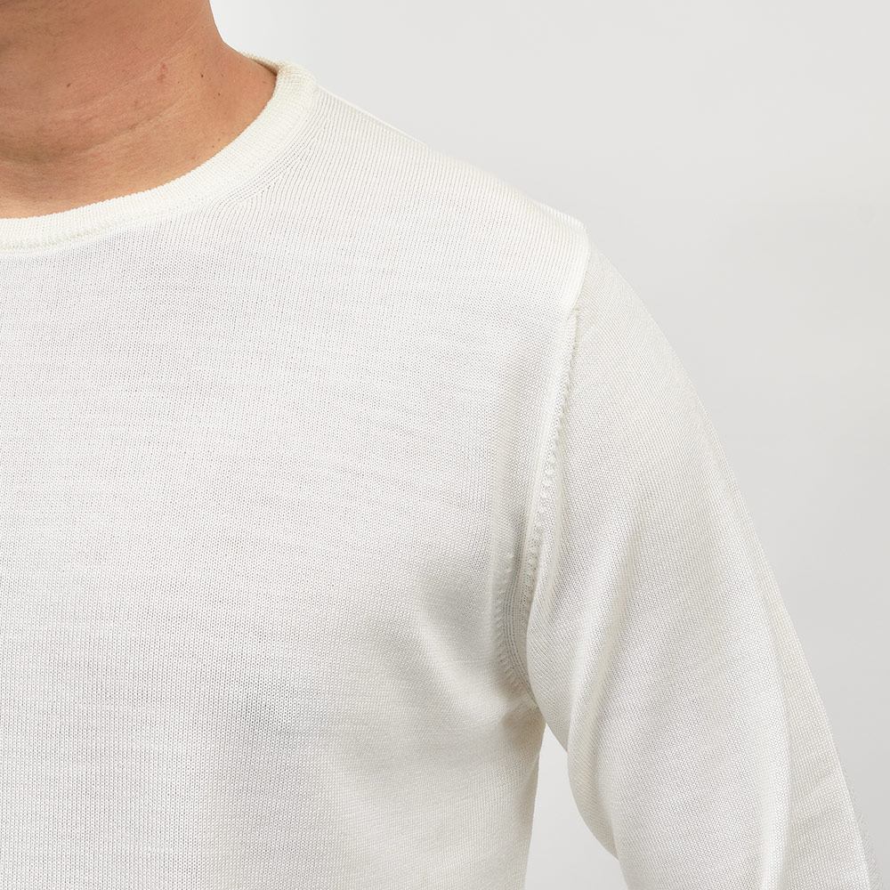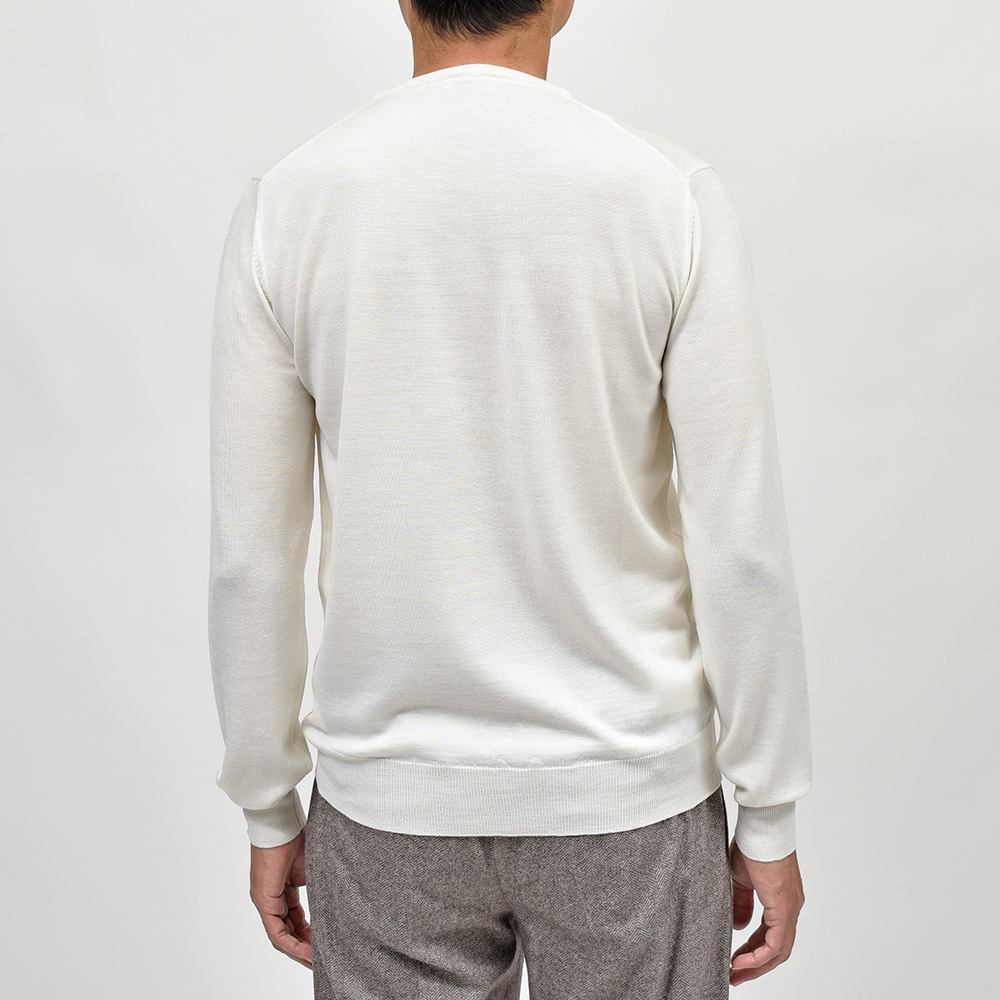 美しい艶感と非常に滑らかなタッチが特徴のエクストラファインメリノウールを使用したハイゲージニット。やや肉感のあるハイゲージですので、インナーは勿論サイズアップして少しゆとりを持って一枚で着ても映える一着となっています。