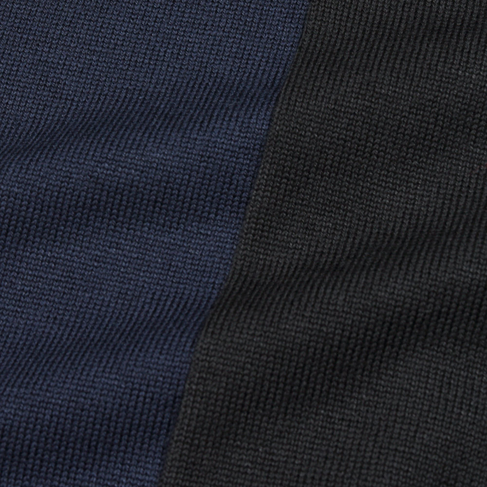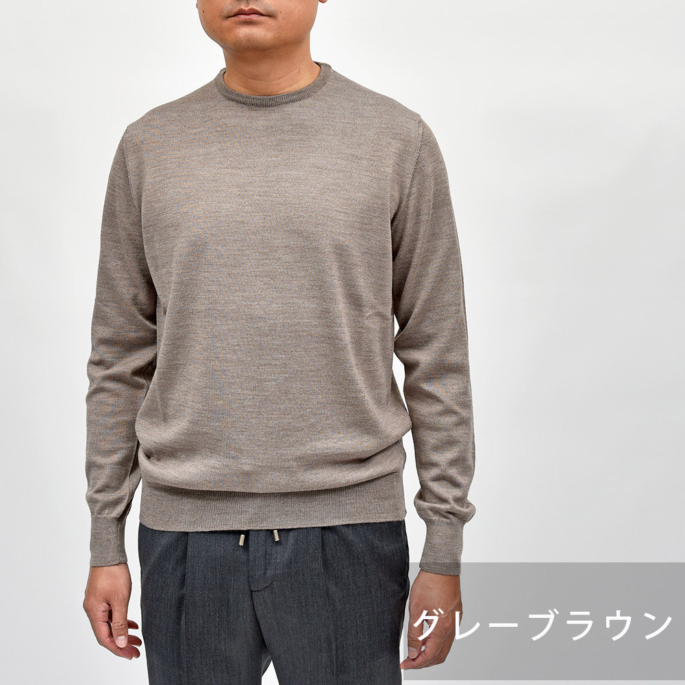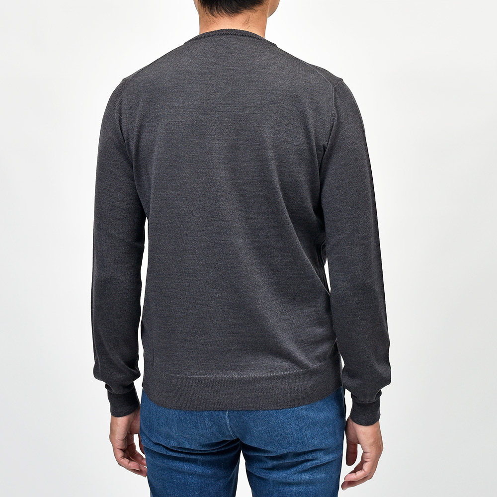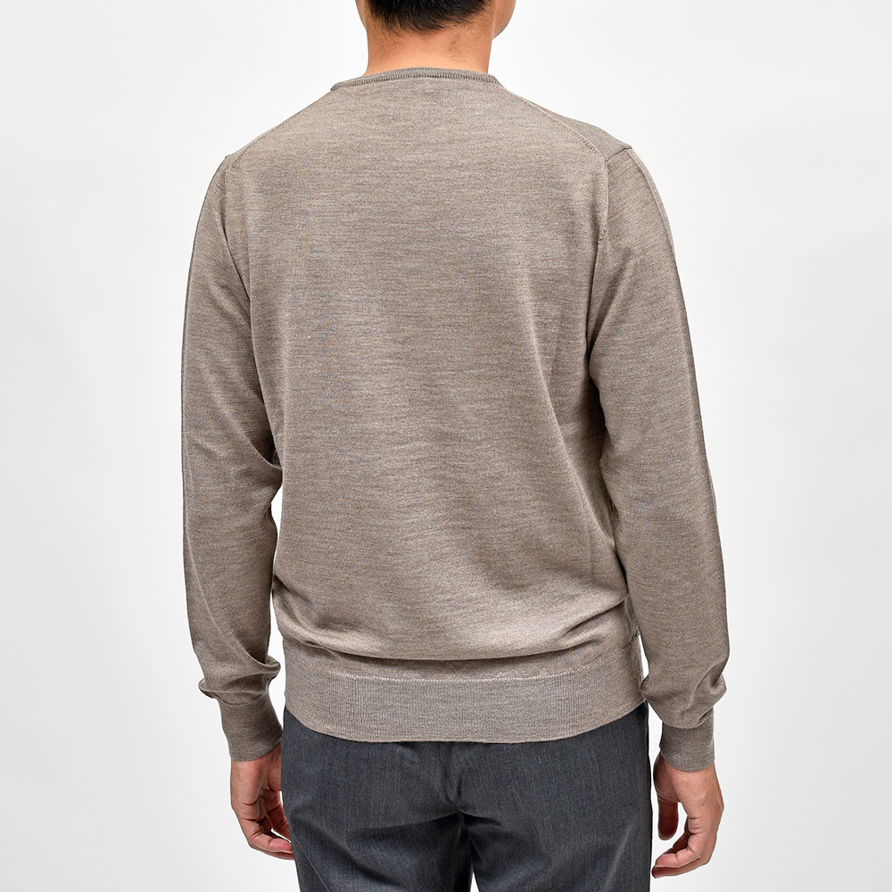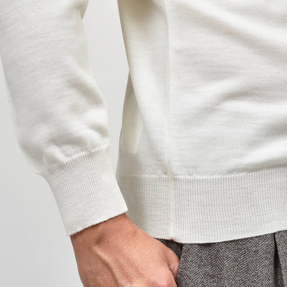 美しい艶感と非常に滑らかなタッチが特徴のエクストラファインメリノウールを使用したハイゲージニット。やや肉感のあるハイゲージですので、インナーは勿論サイズアップして少しゆとりを持って一枚で着ても映える一着となっています。
