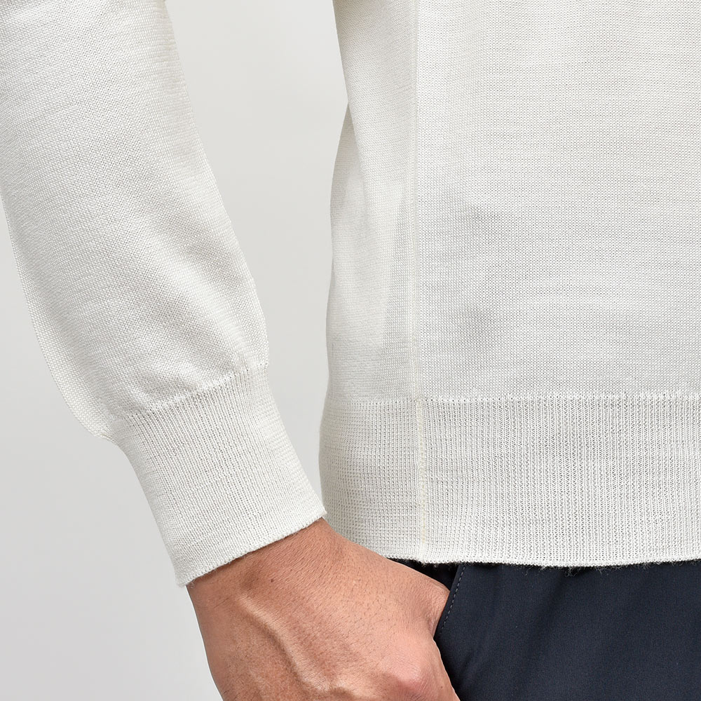 美しい艶感と非常に滑らかなタッチが特徴のエクストラファインメリノウールを使用したハイゲージニット。やや肉感のあるハイゲージですので、インナーは勿論サイズアップして少しゆとりを持って一枚で着ても映える一着となっています。