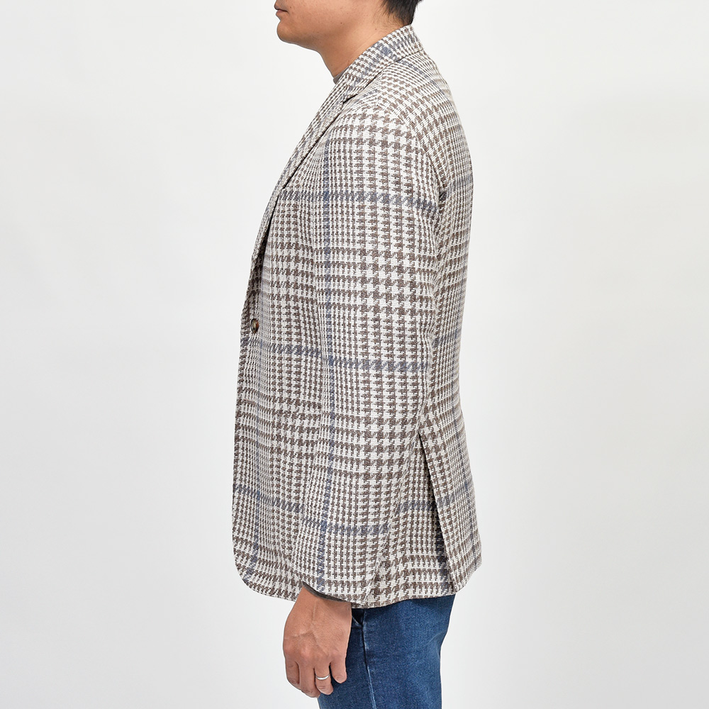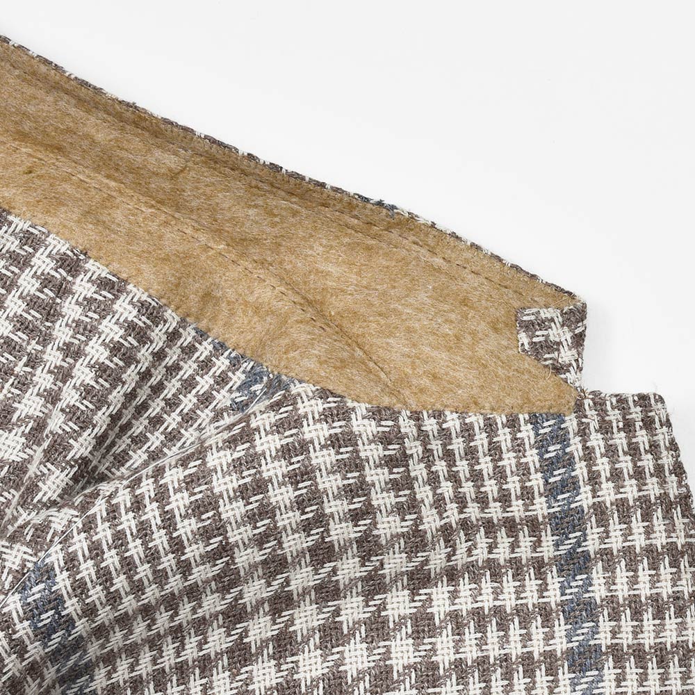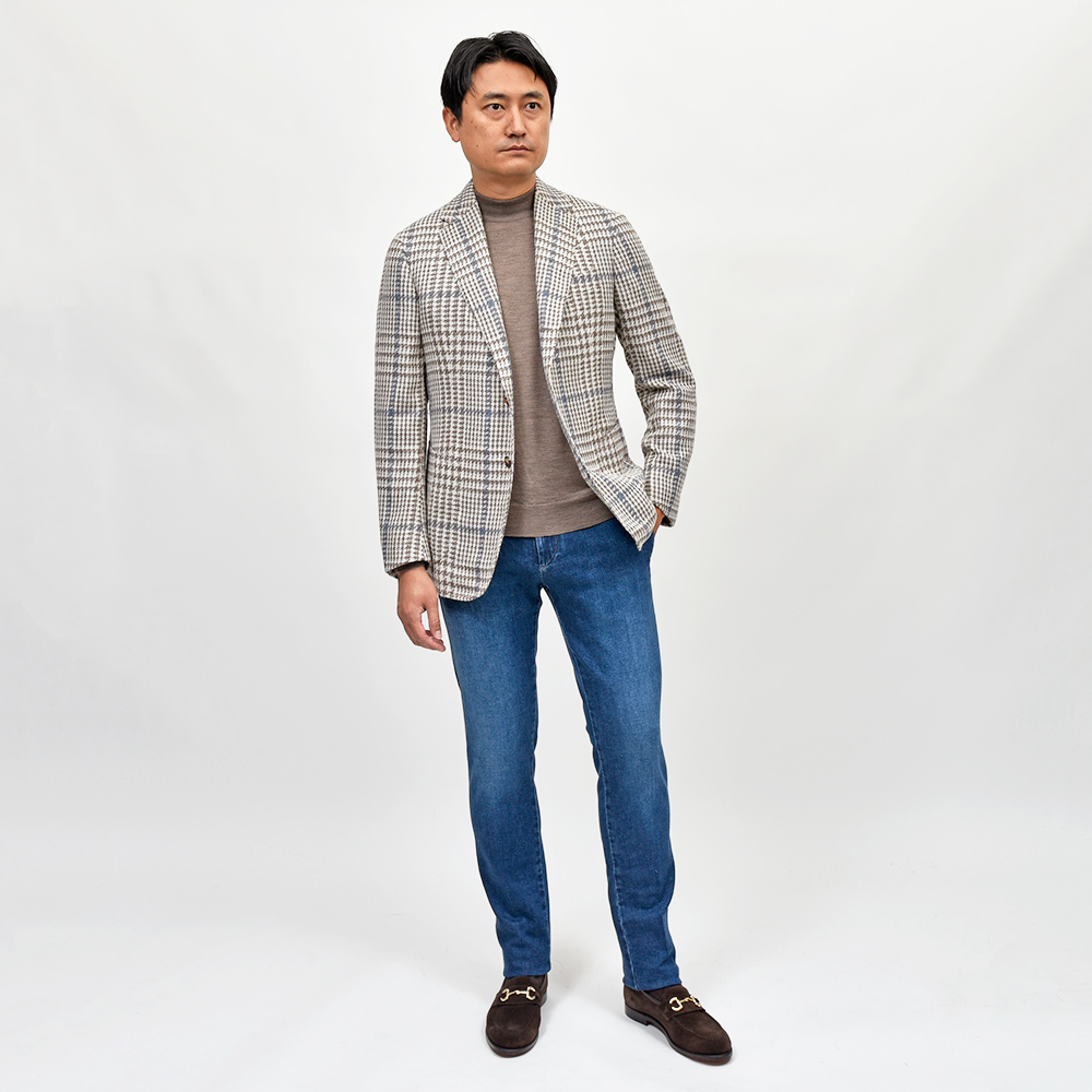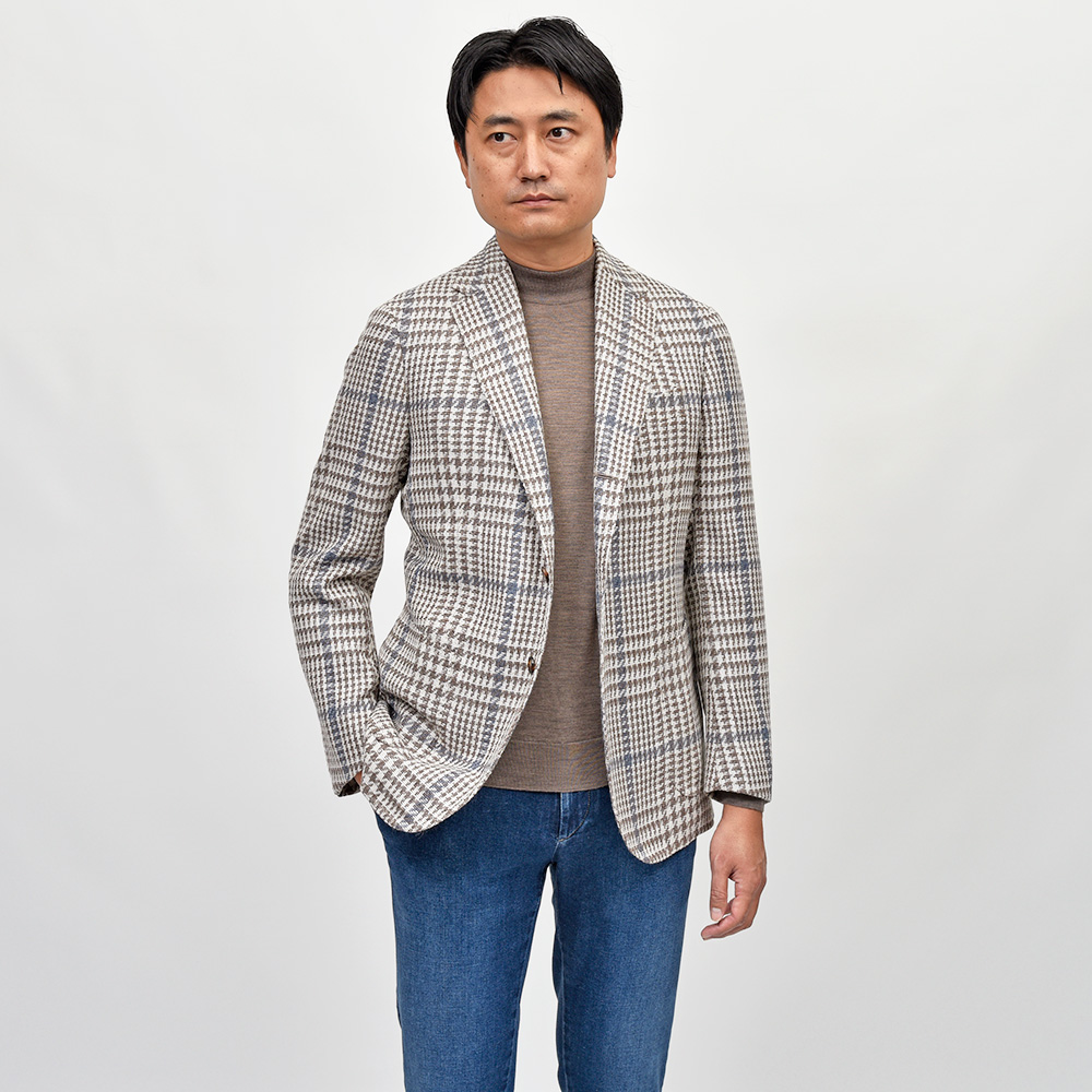 ツイード調の見た目ですが、目付け280gと秋冬素材では非常に軽いウエイトのグレンチェック。起毛感はありながらも目付けが軽いため、昨今の気候が加味された一着となっています。またこちらは、イタリアを代表する生地メーカー“FERLA(フェルラ)”にSTILE LATINOが別注したエクスクルーシブファブリックになります。ホフホワイト×グレーベージュのグレンチェックに、STILE LATINOらしいダークブルーのウインドウペーンが何とも言えない色気を香らせています。