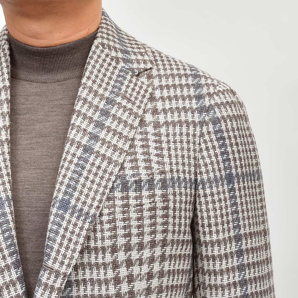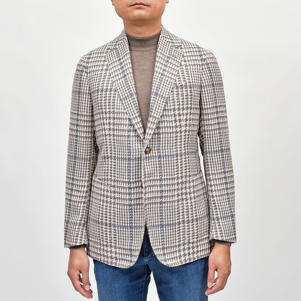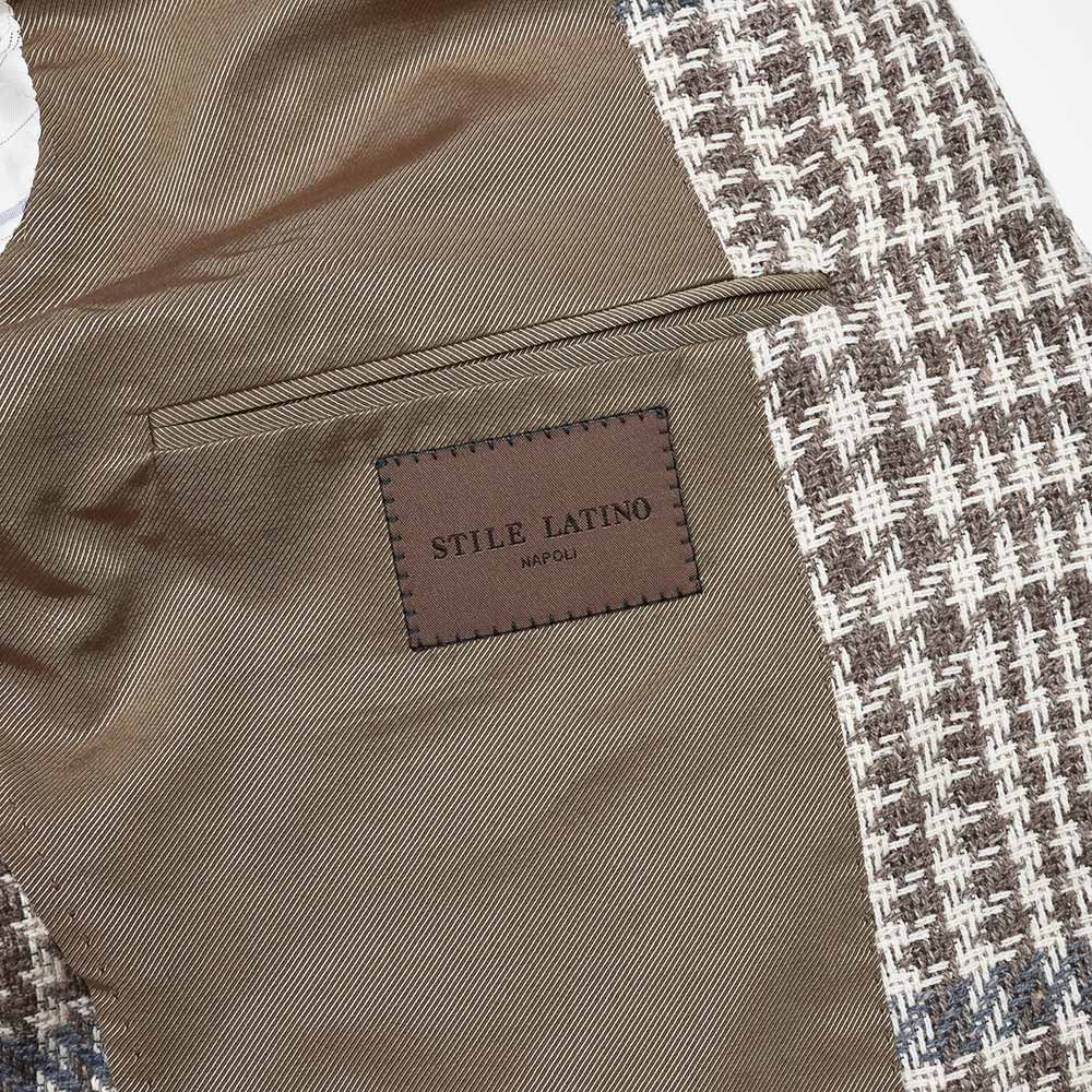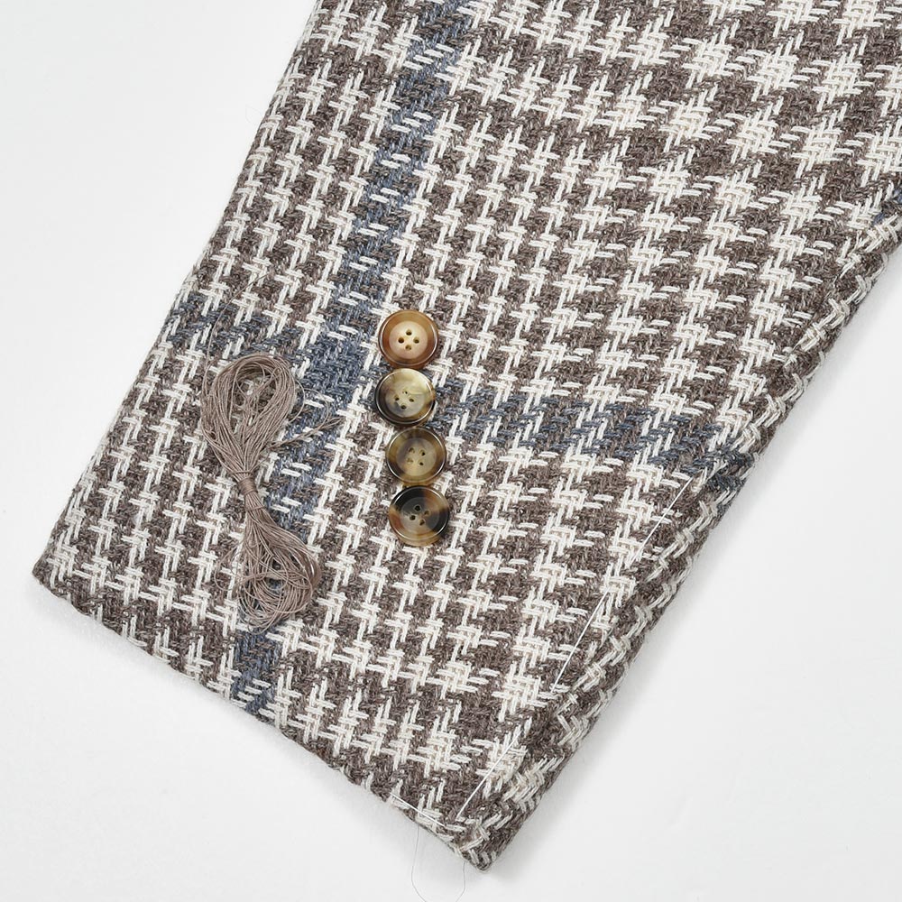 ツイード調の見た目ですが、目付け280gと秋冬素材では非常に軽いウエイトのグレンチェック。起毛感はありながらも目付けが軽いため、昨今の気候が加味された一着となっています。またこちらは、イタリアを代表する生地メーカー“FERLA(フェルラ)”にSTILE LATINOが別注したエクスクルーシブファブリックになります。ホフホワイト×グレーベージュのグレンチェックに、STILE LATINOらしいダークブルーのウインドウペーンが何とも言えない色気を香らせています。