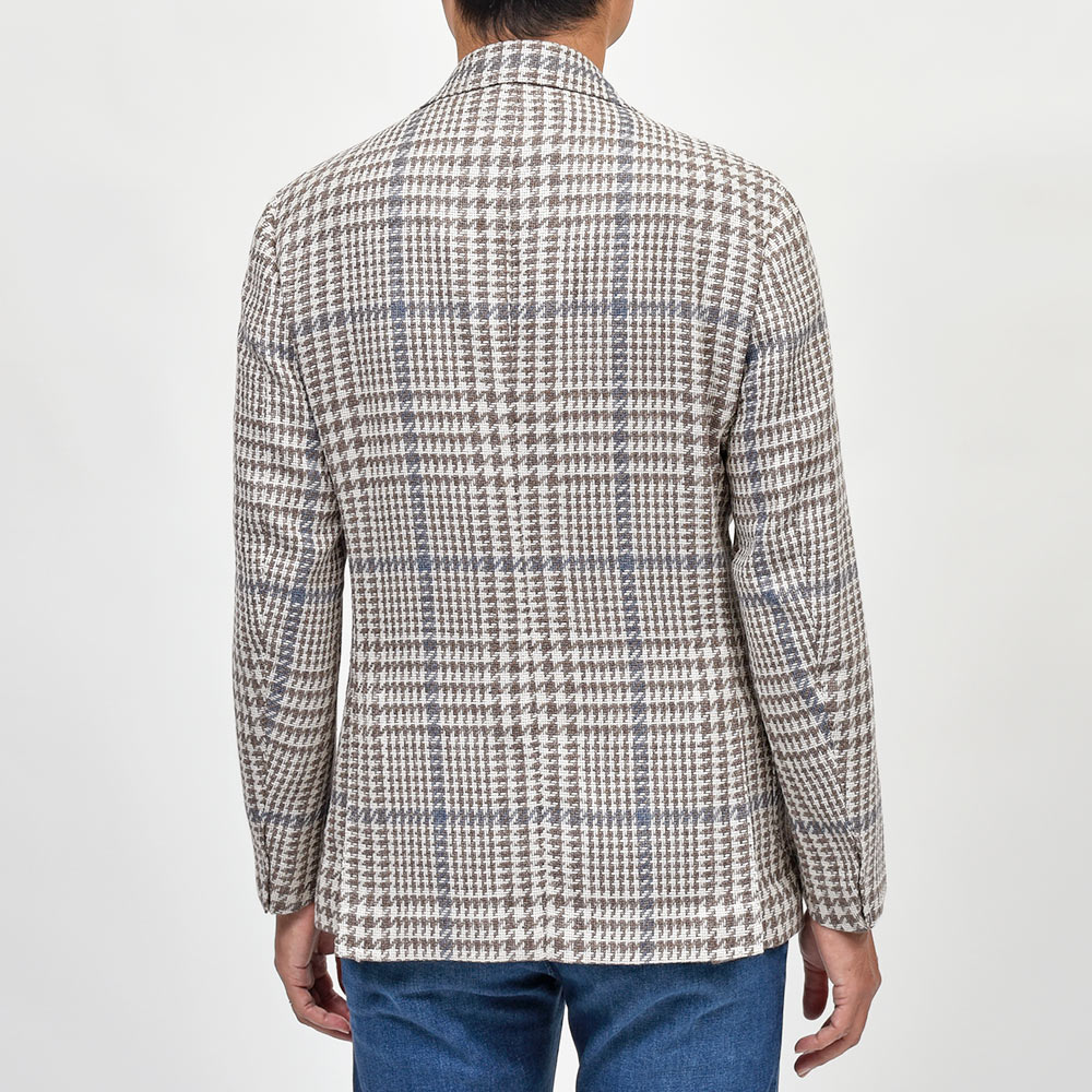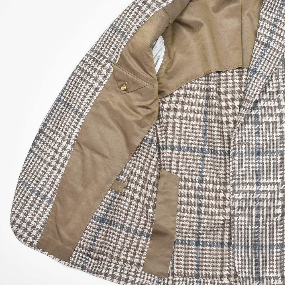 サイズ48がジャストサイズです。肩周りから胸にかけてピッタリフィットしているのに楽に着用できています。ボディは、タイトすぎず緩すぎずちょうどいいサイジングです。それでいてスッキリとしています。ベージュ・ブラウン・ブルーの優しいカラー構成のグレンチェックです!
