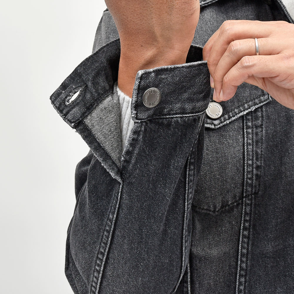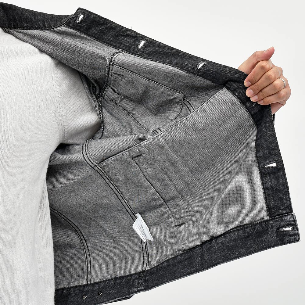 通年で使える薄すぎず厚すぎないオンスのコットン100%を使用したデニム生地は、ややハリ感を持たせつつも程よくしなやかな風合いです。ガンメタリックのボタンと、ウォッシュド加工を施しアタリを付けたエイジングの雰囲気が素晴らしい一着。