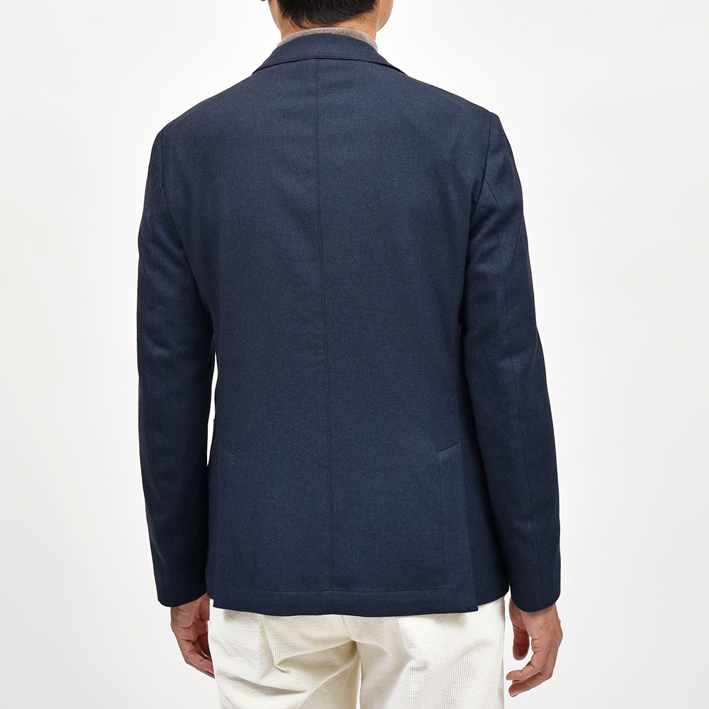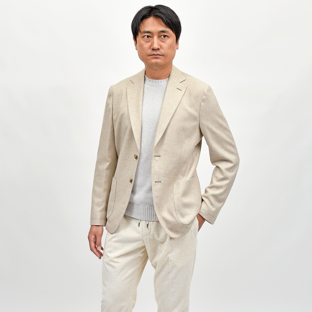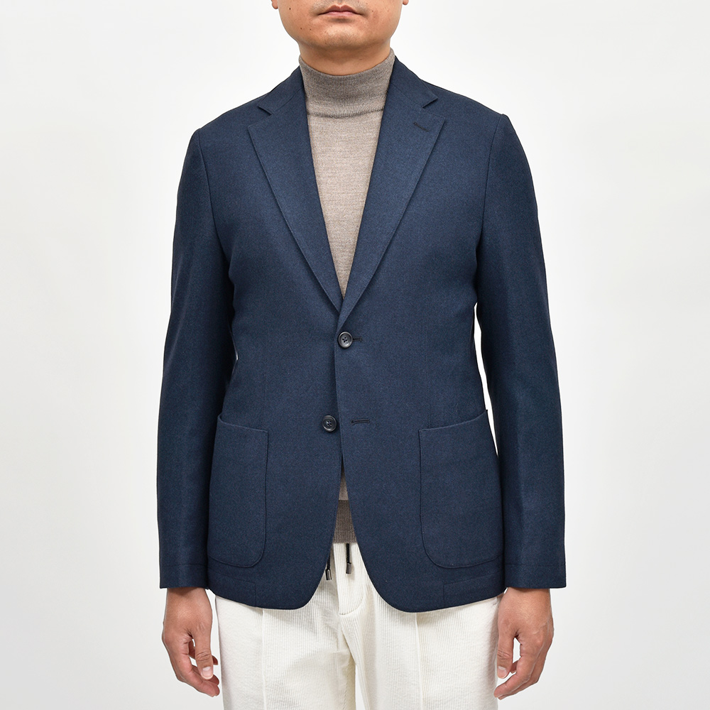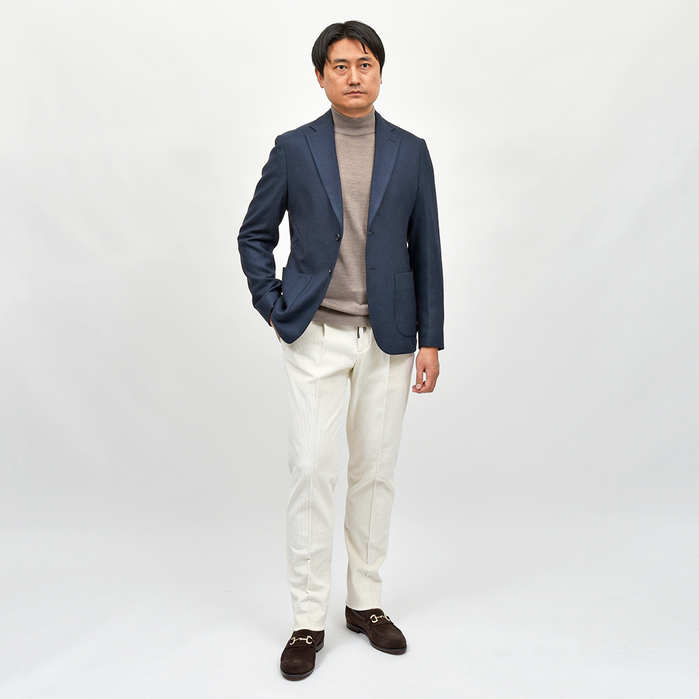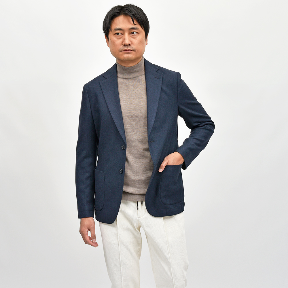 こちらはイタリアのファブリックメーカー“MANTECO(マンテコ)”社製のサキソニーを使用したアンコンジャケット。程よい起毛感に柔らかで上品な艶感がリッチな佇まい。また、ストレッチが効いているためジャストフィットで着てもストレスのない着心地となっています。