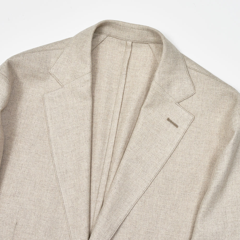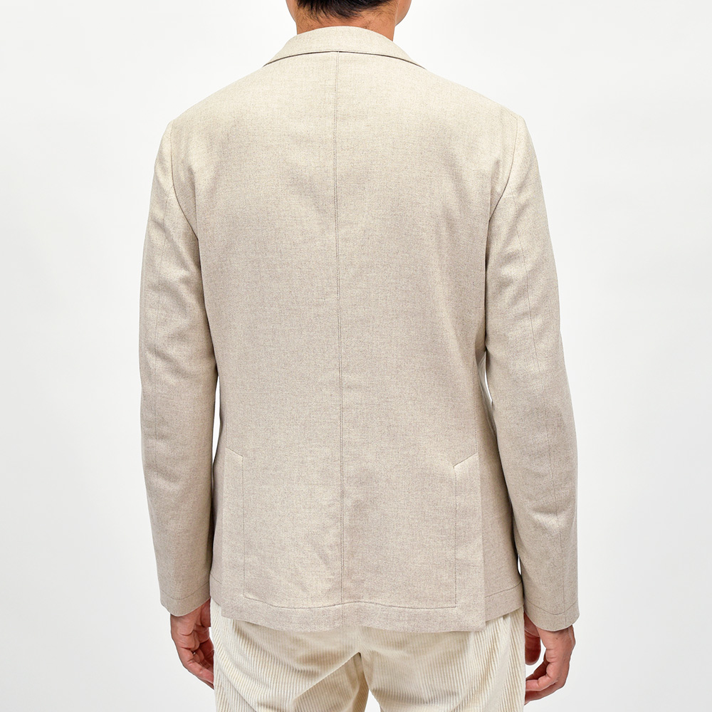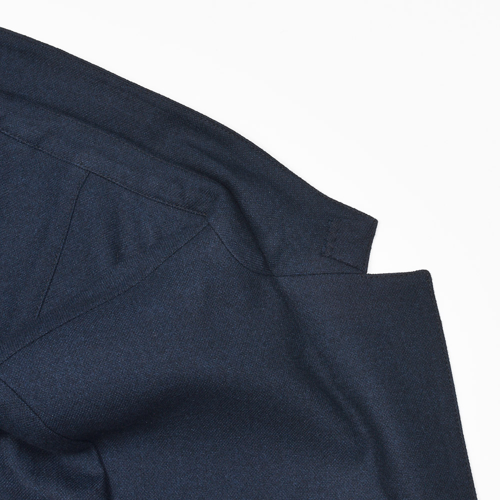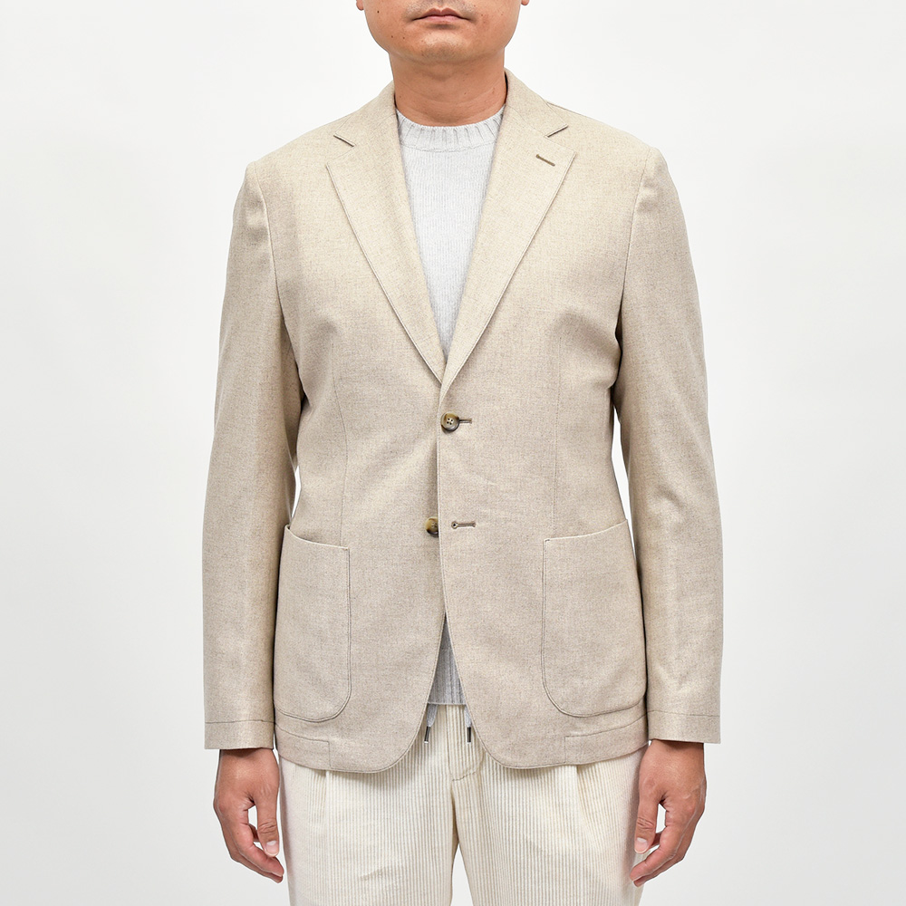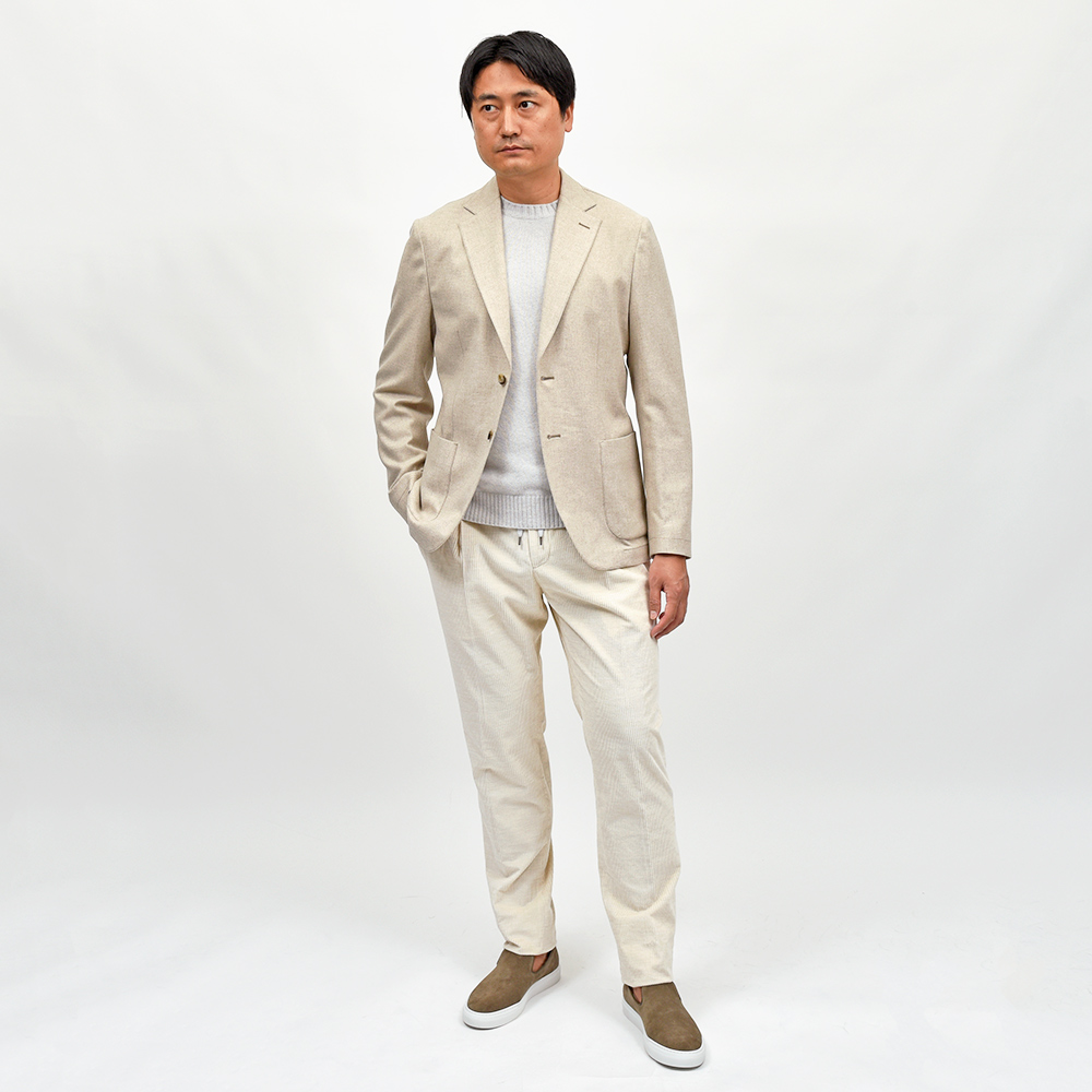 こちらはイタリアのファブリックメーカー“MANTECO(マンテコ)”社製のサキソニーを使用したアンコンジャケット。程よい起毛感に柔らかで上品な艶感がリッチな佇まい。また、ストレッチが効いているためジャストフィットで着てもストレスのない着心地となっています。
