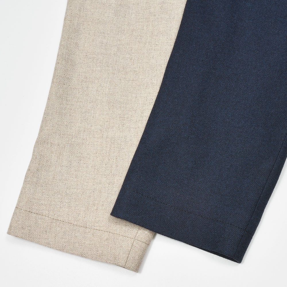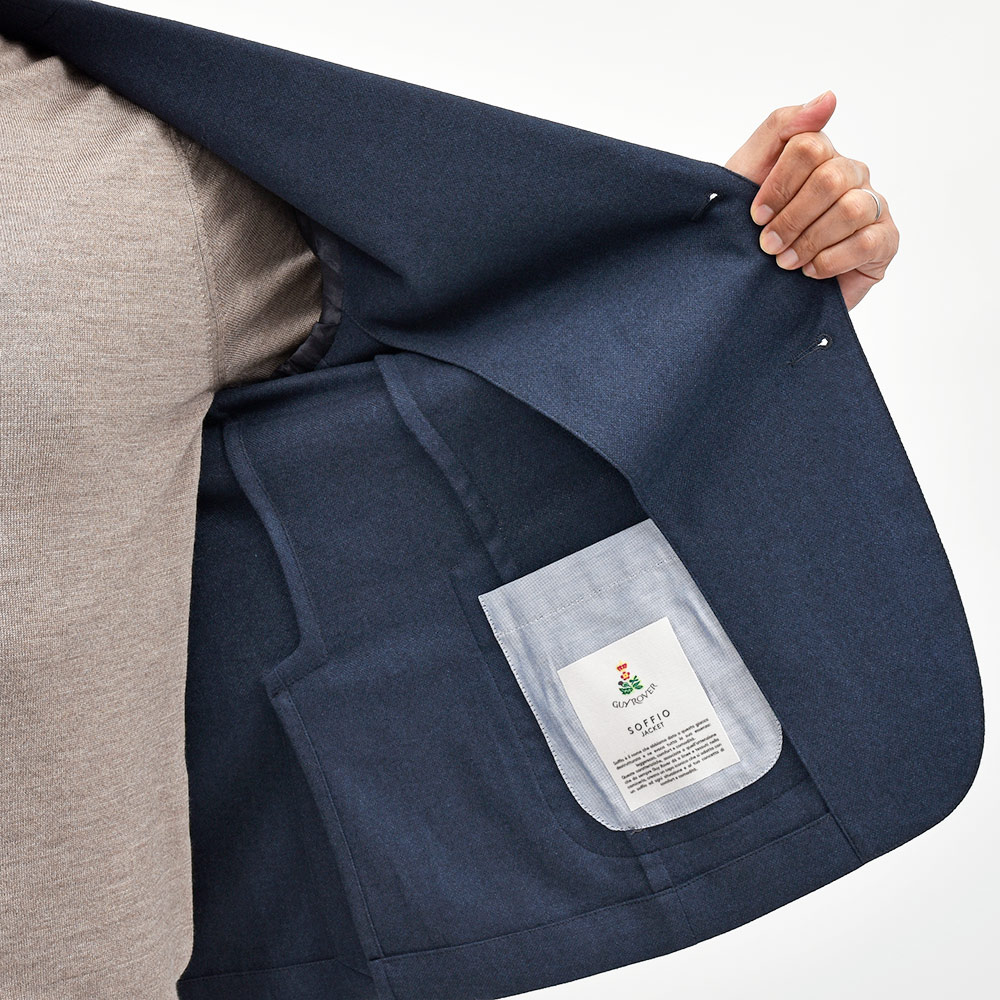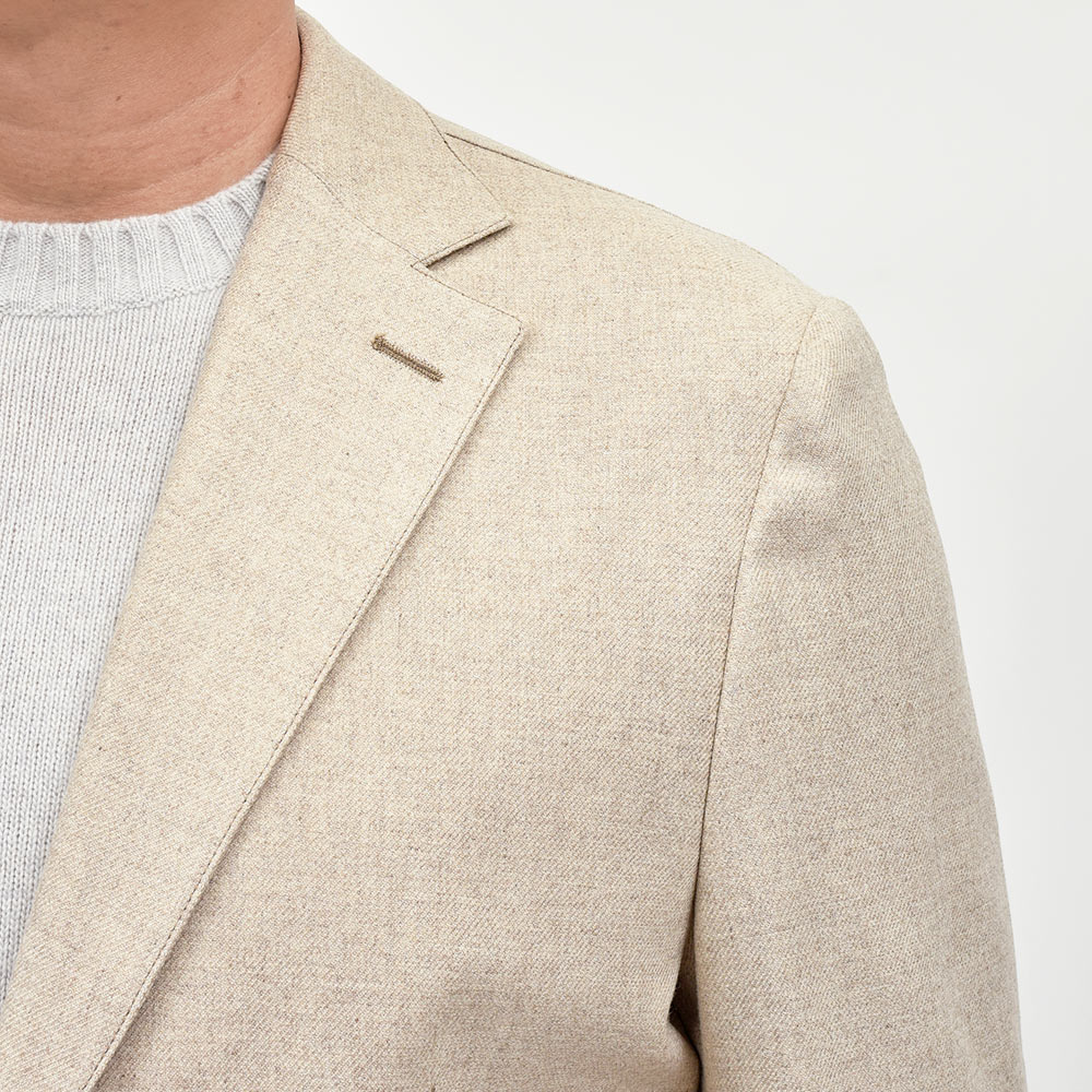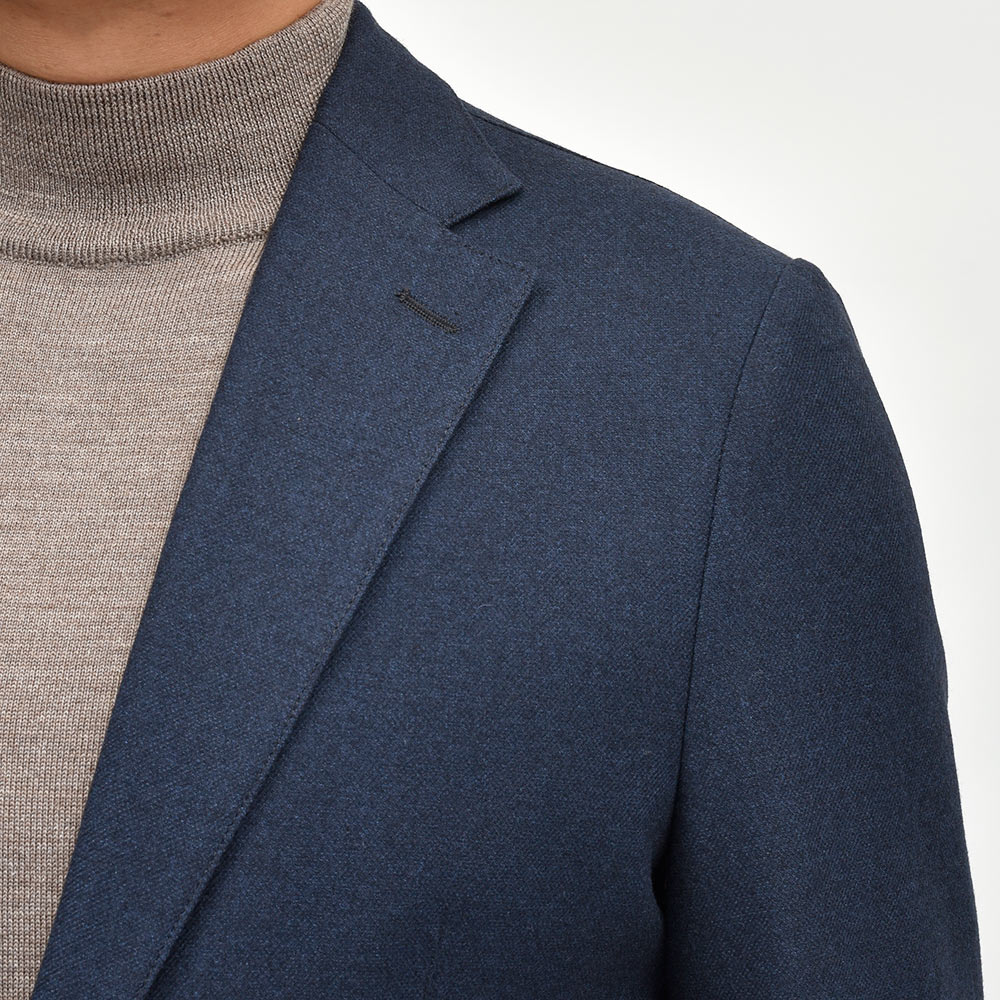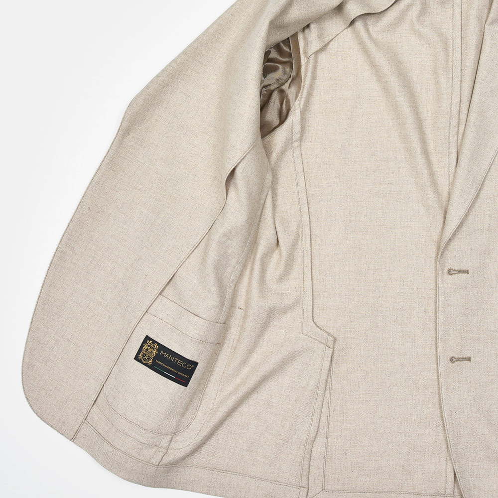 こちらはイタリアのファブリックメーカー“MANTECO(マンテコ)”社製のサキソニーを使用したアンコンジャケット。程よい起毛感に柔らかで上品な艶感がリッチな佇まい。また、ストレッチが効いているためジャストフィットで着てもストレスのない着心地となっています。