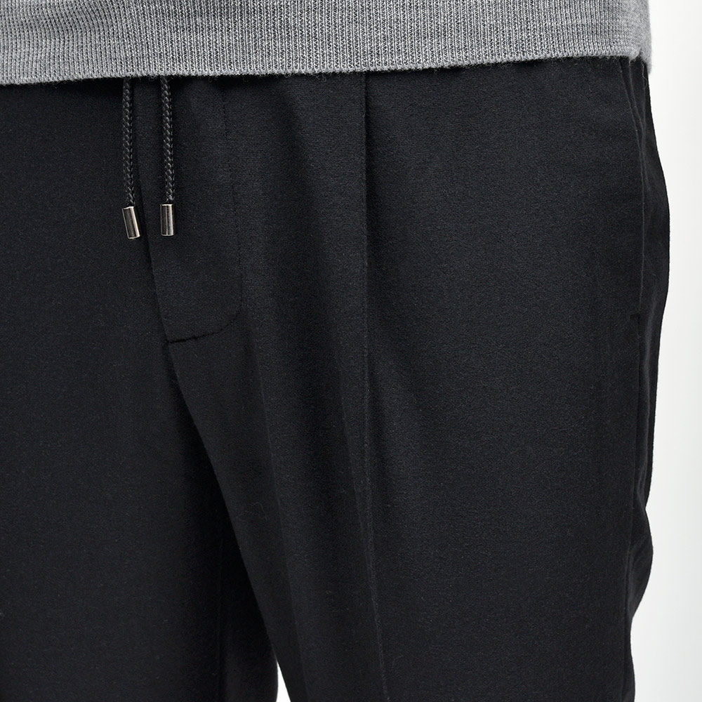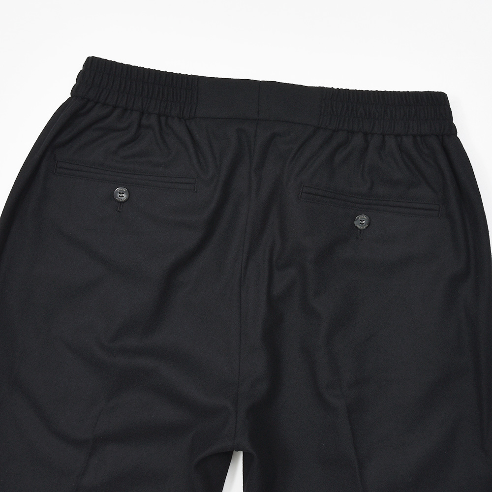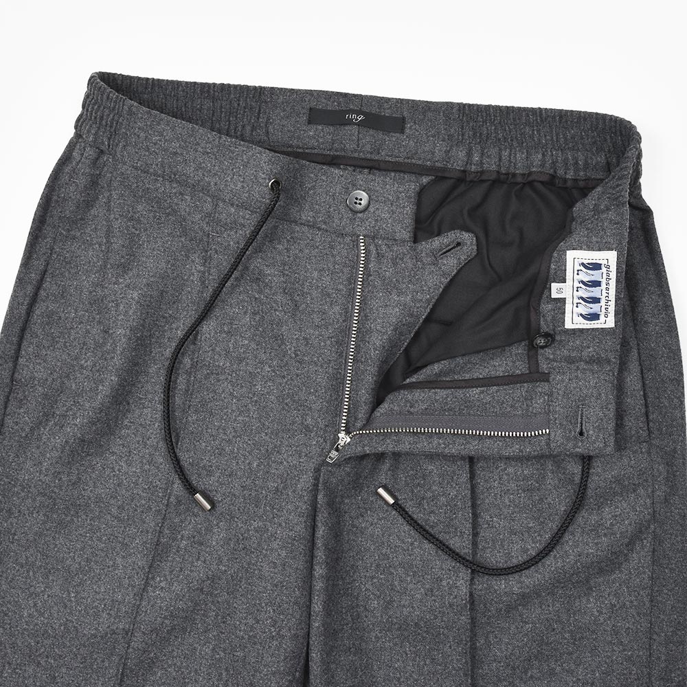 MASACCIO(マサッチョ)をベースに別注を行い、今なおヒットし続けるモンスターアイテム(当社比)、“ring(通称リングッチョ)”。こちらは別注第二弾となる、“RIB ring(リブリング)”になります。“ring(通称リングッチョ)”をベースとしたこちらは、ラグジュアリーな雰囲気が漂うイントレチャートのドローコードや、1プリーツとMASACCIOの代名詞である永久クリースはそのままに、裾をリブ仕様に仕上げました。また、マーベルト部分は“TIZIANO(ティッツィアーノ)”のベルトループなしのシャーリング仕様を採用したハイブリットな一品となっています。