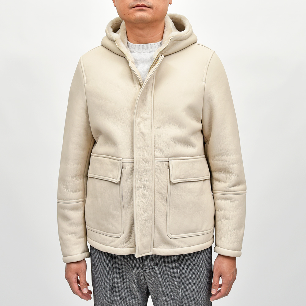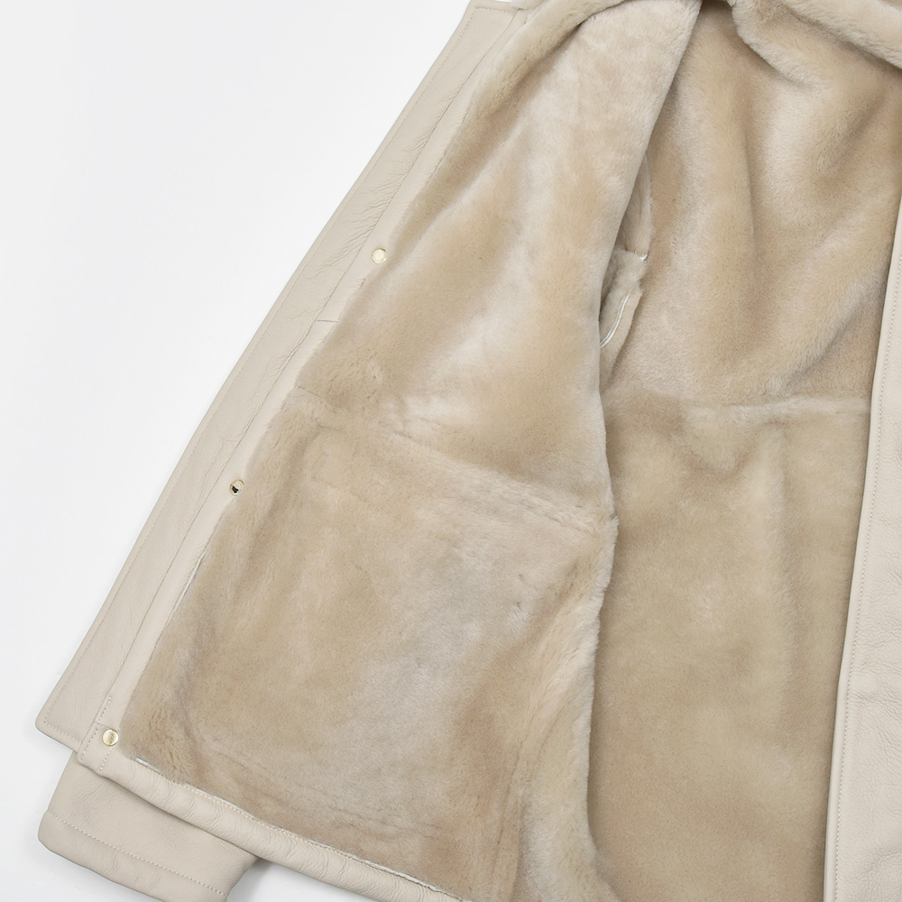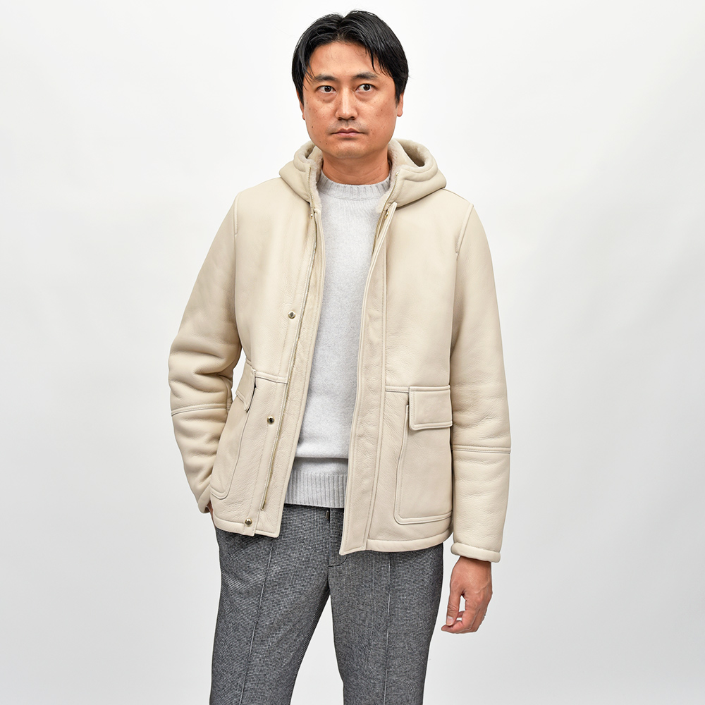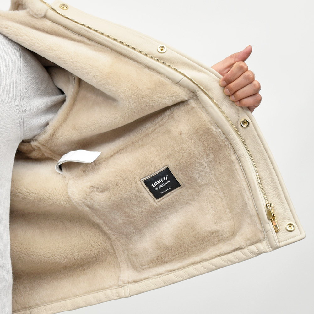 通常ラグジュアリーブランドで使用されているクオリティのレザーを、限りある着数分だけオーダーできる“SPレザー”シリーズ。こちらはEMMETI社では通常取り扱っていない、ハイグレードなムートン素材になります。柔らかくもっちりとした革の風合いに、毛足の短いストレートヘアーを使用したラグジュアリーな雰囲気。さらに上質なムートン素材ですので軽く非常に着やすい重量となっています。