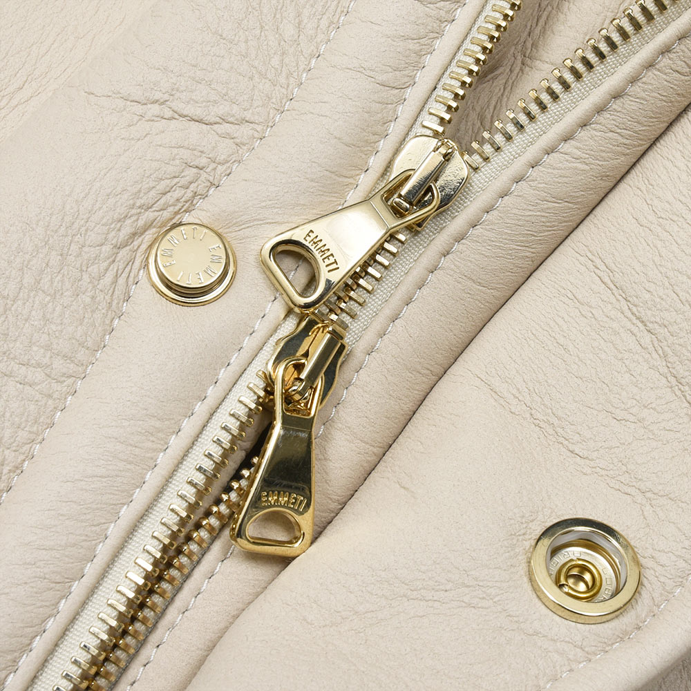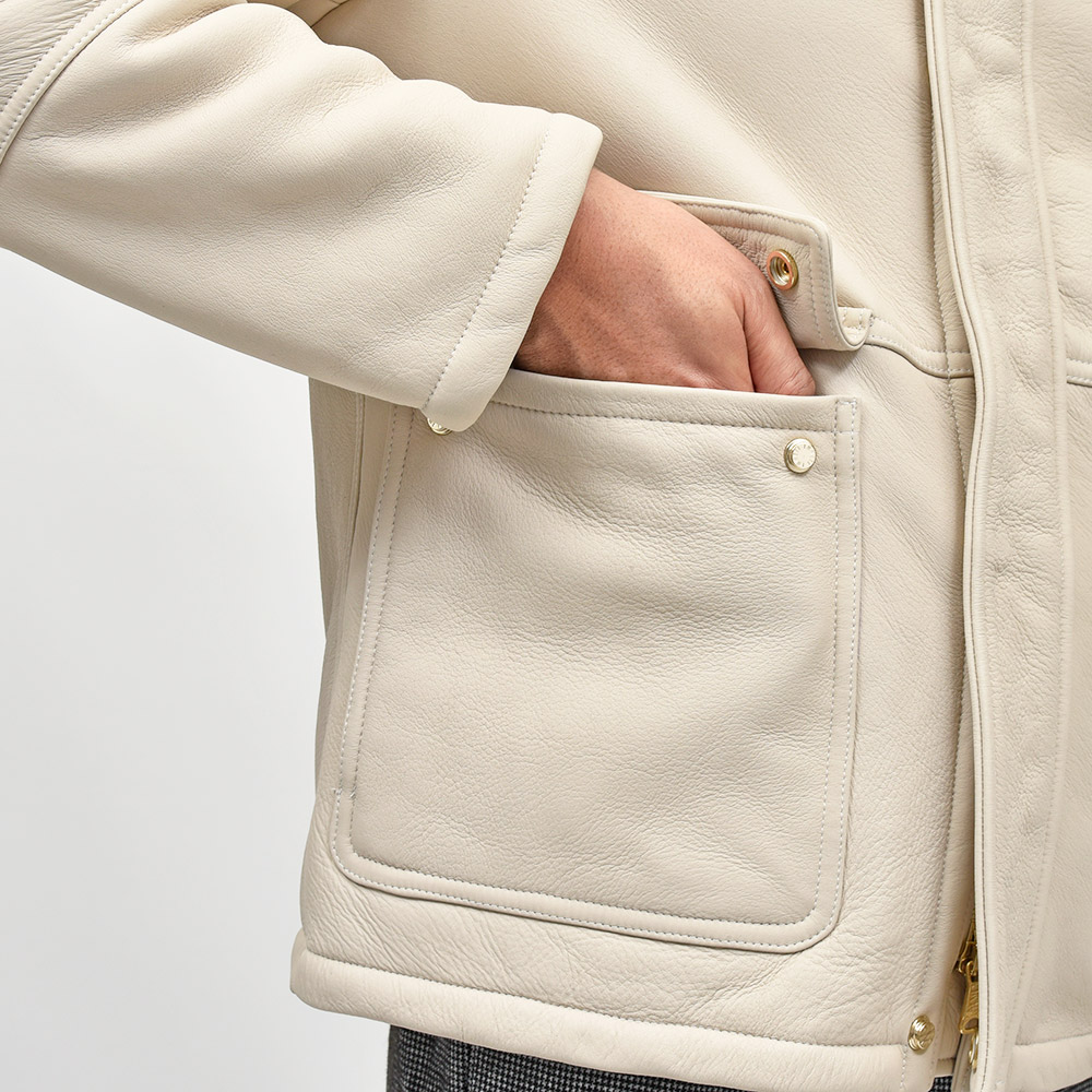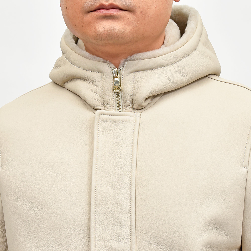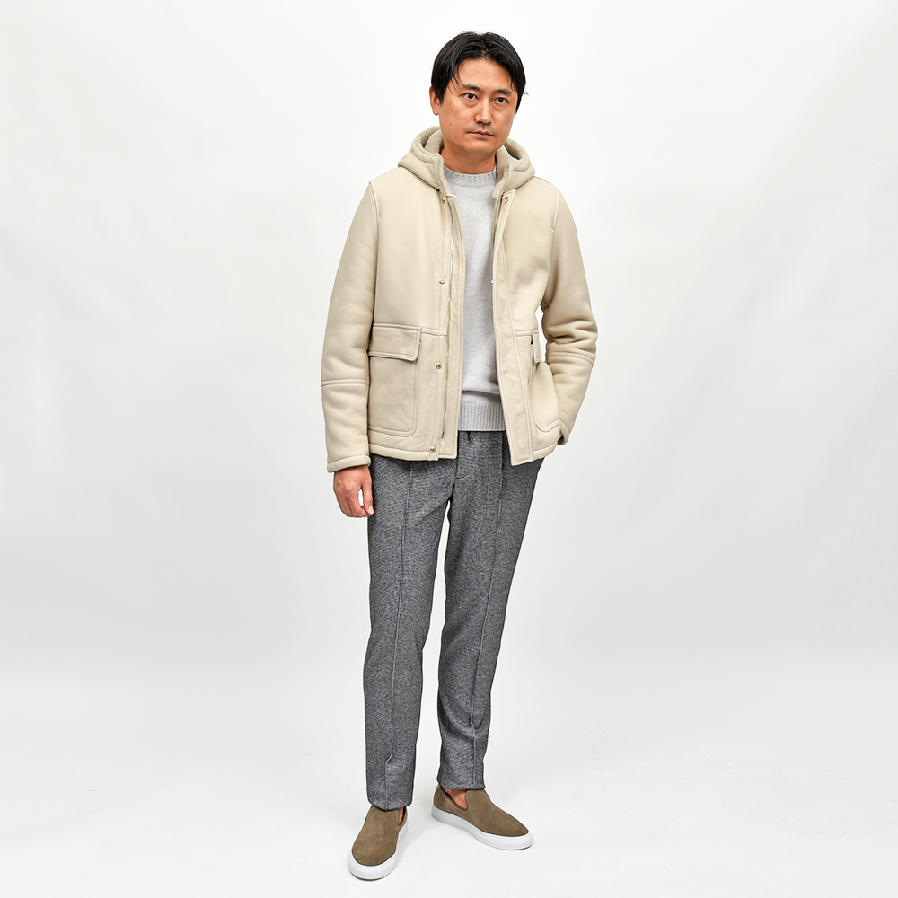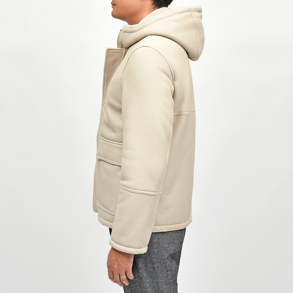 通常ラグジュアリーブランドで使用されているクオリティのレザーを、限りある着数分だけオーダーできる“SPレザー”シリーズ。こちらはEMMETI社では通常取り扱っていない、ハイグレードなムートン素材になります。柔らかくもっちりとした革の風合いに、毛足の短いストレートヘアーを使用したラグジュアリーな雰囲気。さらに上質なムートン素材ですので軽く非常に着やすい重量となっています。