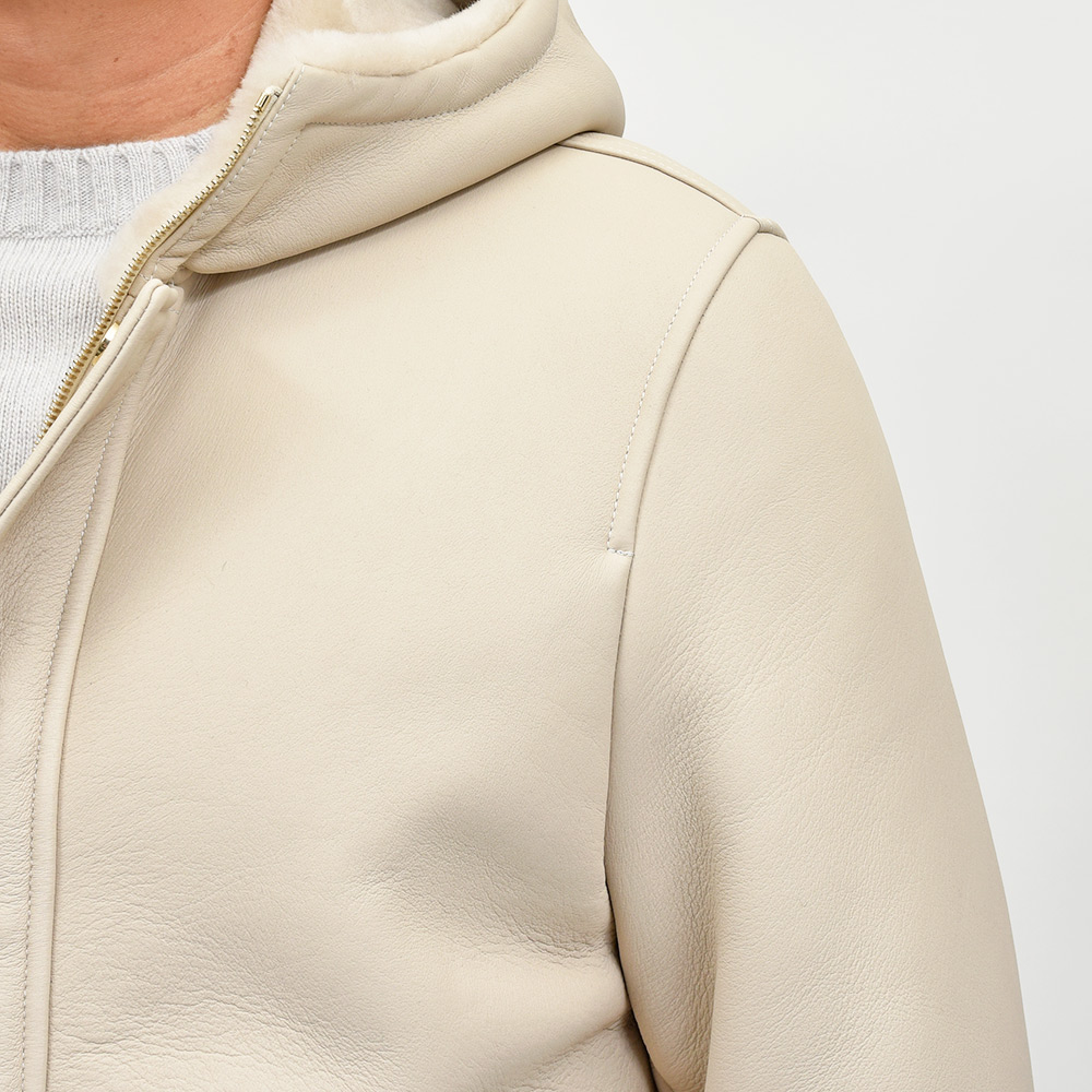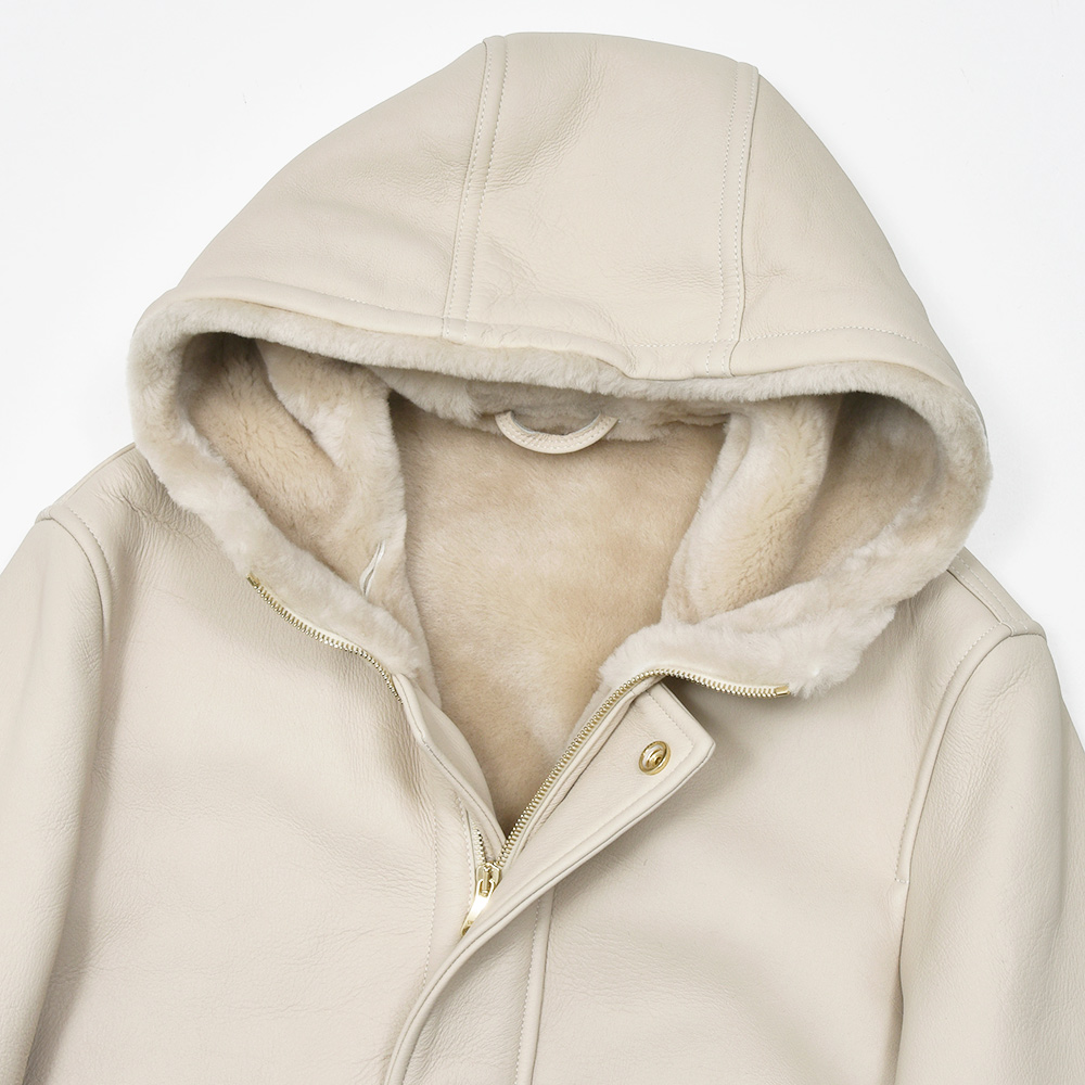 EMMETIのムートンブルゾンでは定番モデルである"WALLAS(ウォラス)"。前立ての比翼や、フロントの大きなフラップポケット、一体型のフードといった少しスポーティーなデザインが特徴です。ラグジュアリーな雰囲気を持つムートン素材だからこそ、タウンユースでサラッと羽織るには打って付けな一着。また、ジップはアイボリーと馴染みやすいゴールドカラーとなっています。