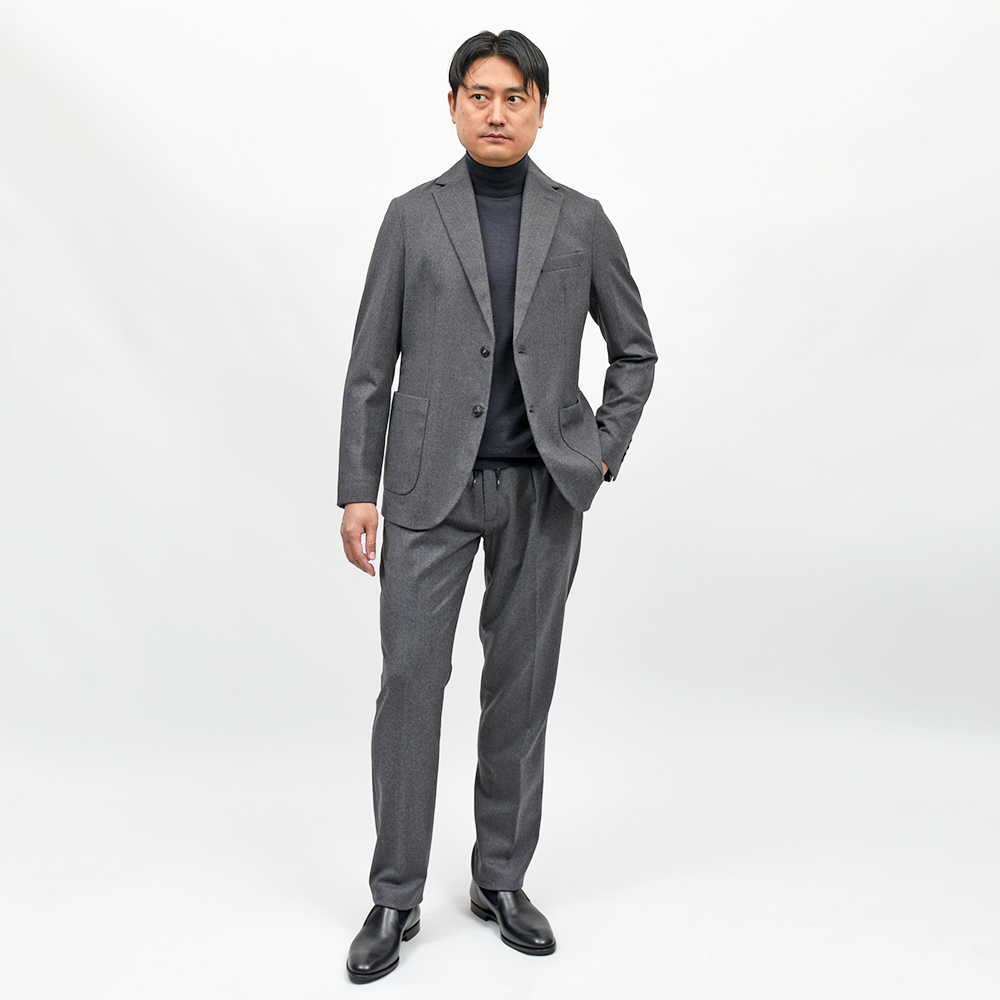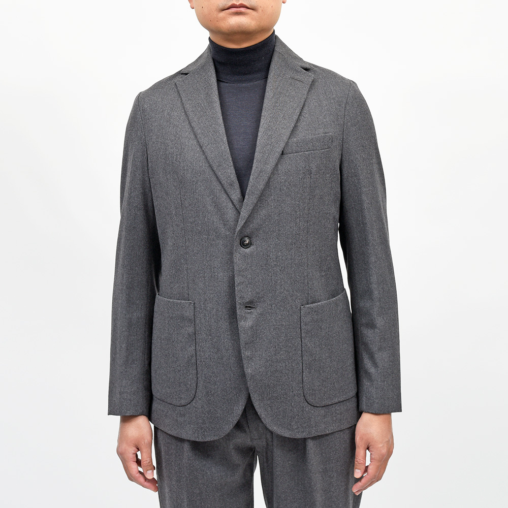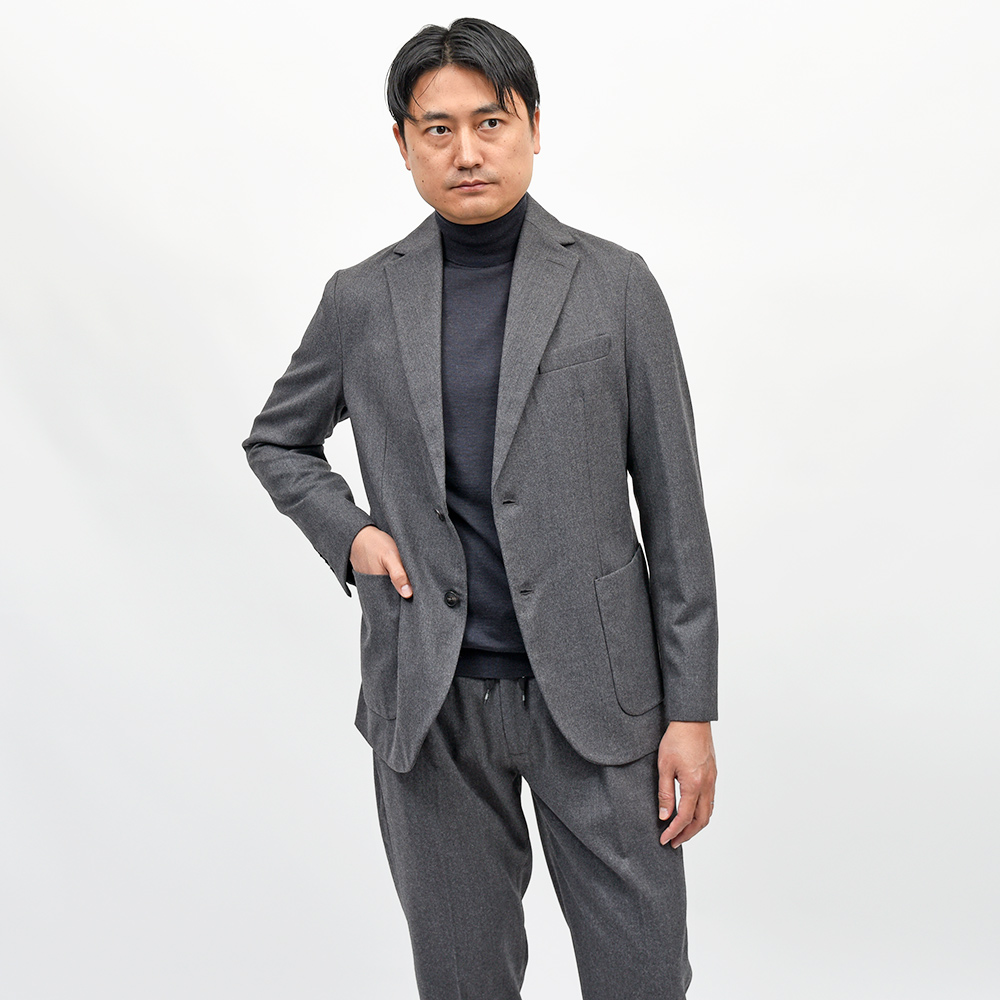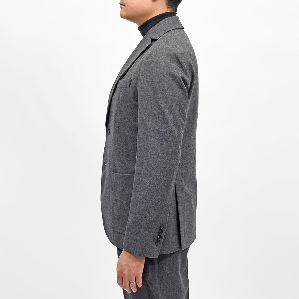 ヴァージンウールを使用した、滑らかで柔らかな質感が上品な雰囲気を纏わせてくれるライトフランネル。ストレッチ性があるため、見た目のイメージとは裏腹な快適な着用感を持っています。生地感もライトなため軽やかな着心地で、かつ秋口から春先まで長い期間着用できる一着となっています。
