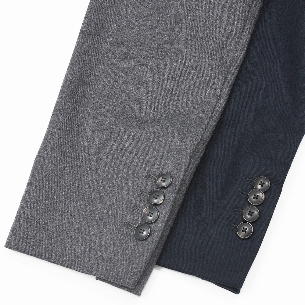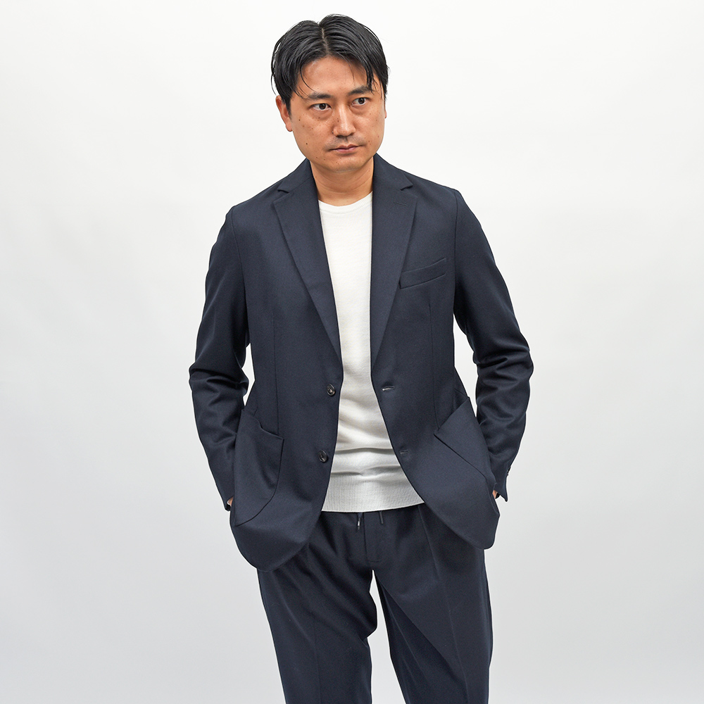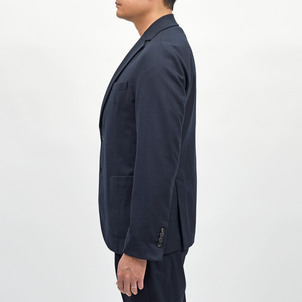 こちらは程よくタイトなシルエットに、フロントの2つボタンがジュアルなジャケットやセットアップとして非常に有能な働きをしてくれる定番モデルになります。