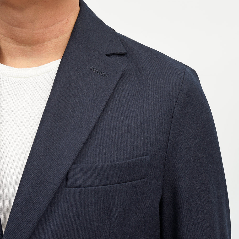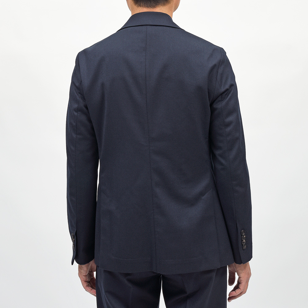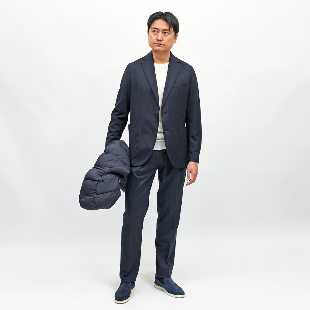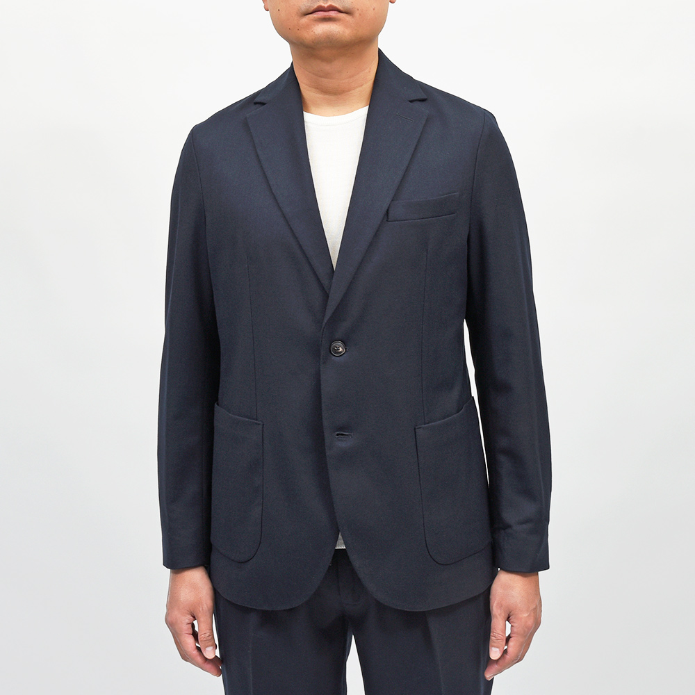 こちらは程よくタイトなシルエットに、フロントの2つボタンがジュアルなジャケットやセットアップとして非常に有能な働きをしてくれる定番モデルになります。
