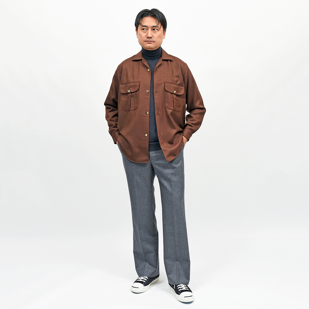 こちらは、シャツジャケットモデルの“GERARDO”。フロントの大きな胸ポケットはフラップになっておりCPOジャケットのような雰囲気が漂います。しかし、襟はオープンカラーにすることで抜け感が生まれ、サラッと羽織りやすい仕立に。フィットはややゆとりを持たせているため、太めのパンツとの相性が良く時代に合わせたサイズ感となっています。