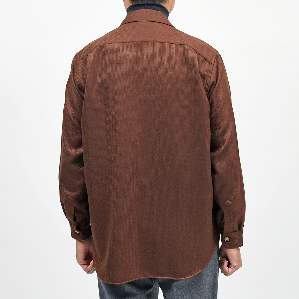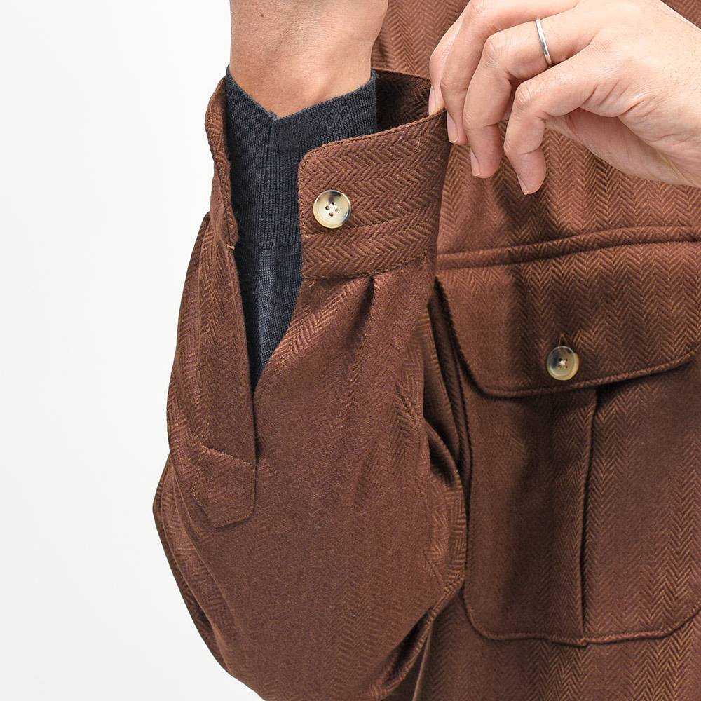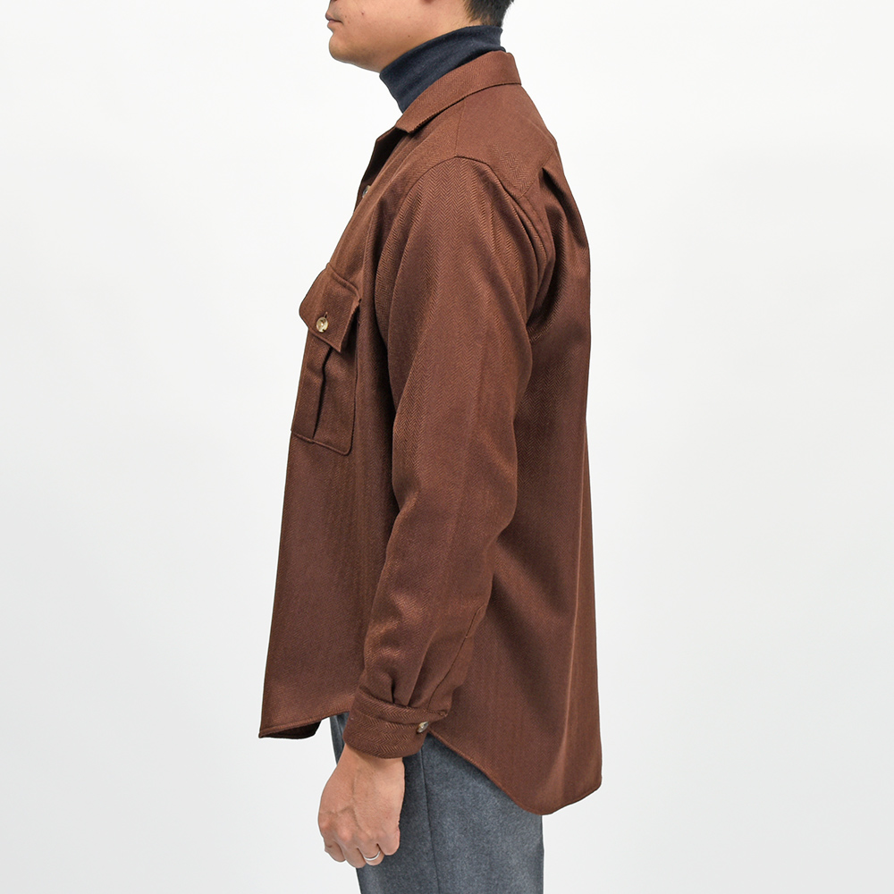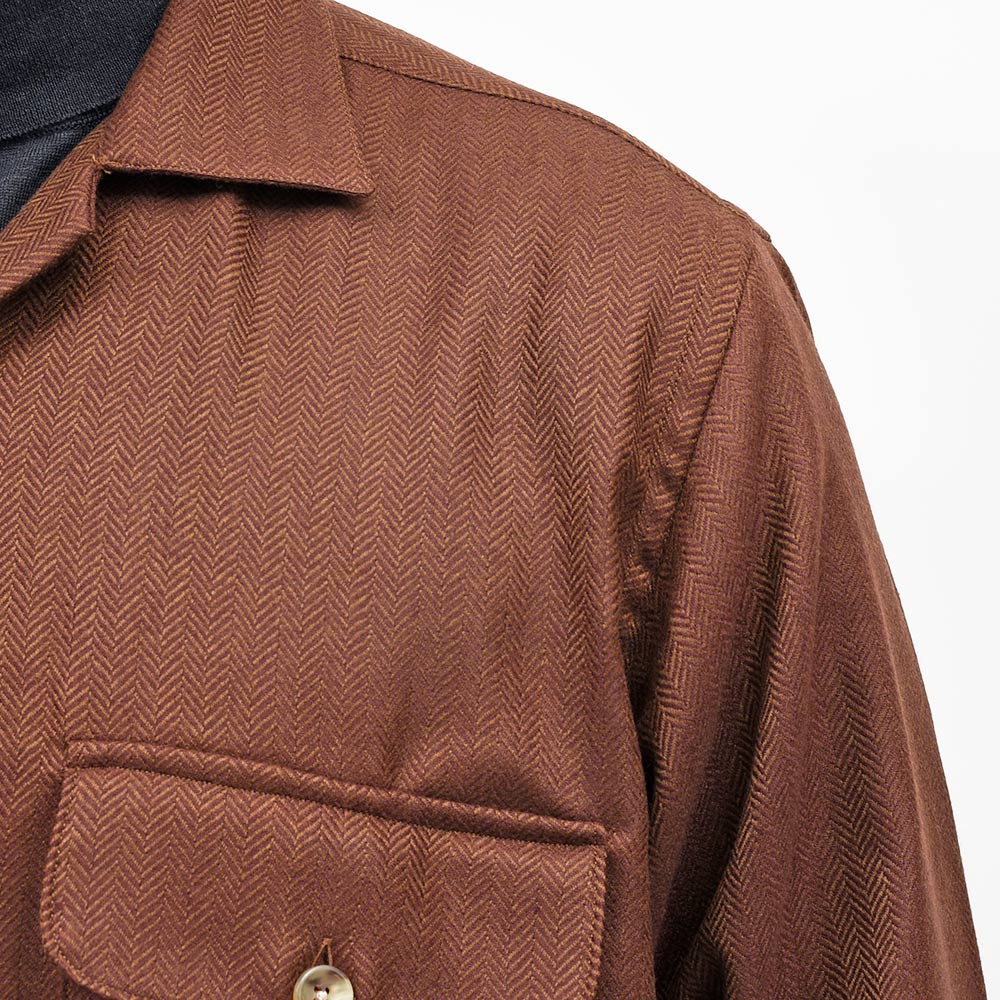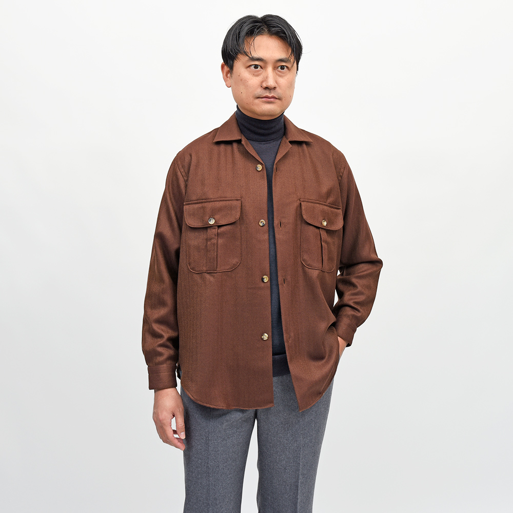 美しいな光沢感を持つ柔らかで滑らかな、薄手のフランネルを使用したシャツジャケット。上質な生地を使用しているため、ワークなデザインのシャツジャケットであっても上品に見え、デニムやチノパンのみならずウールスラックスなどとの相性も抜群。また、同色系統のカラーを使用したヘリンボーンがモダンな佇まいを生んでいます。端境期にはアウターとして、本格的な冬にはシャツインナーとしても活躍する一品です。