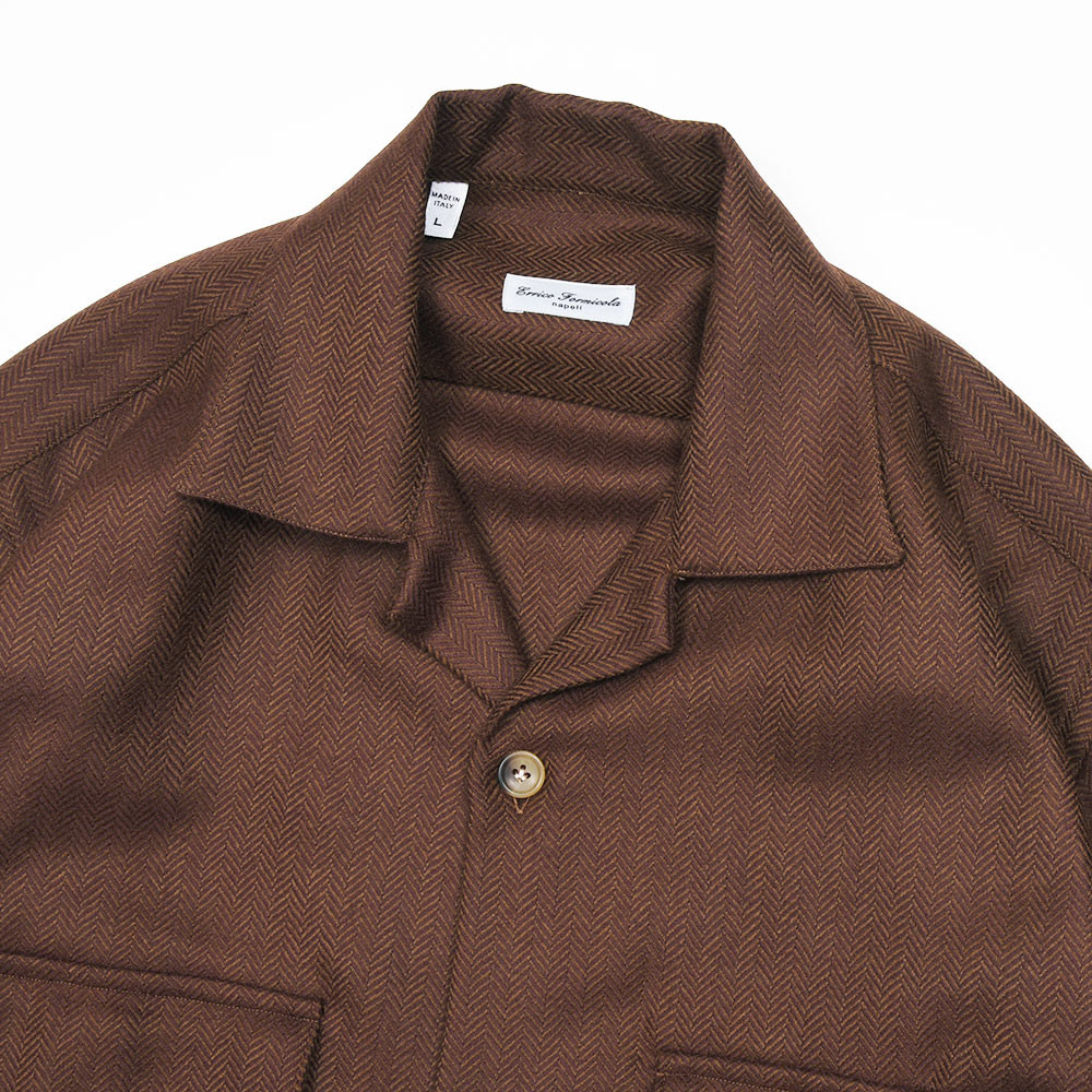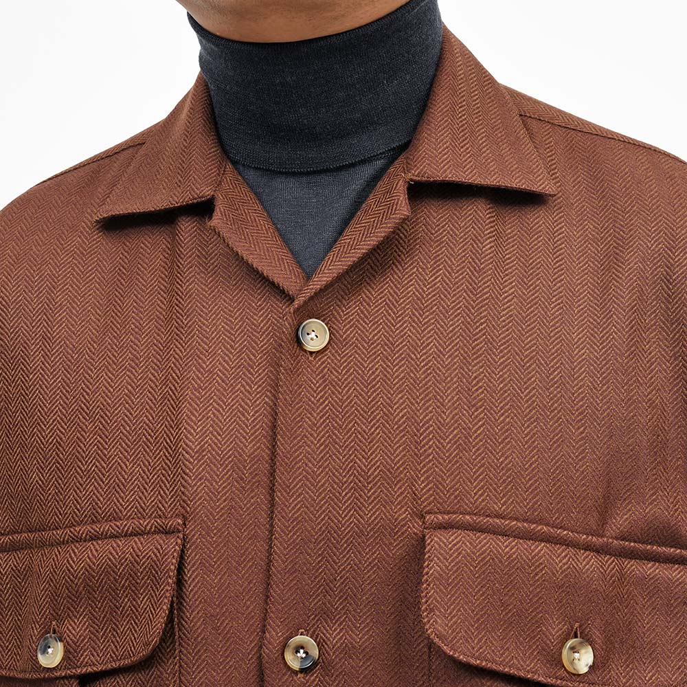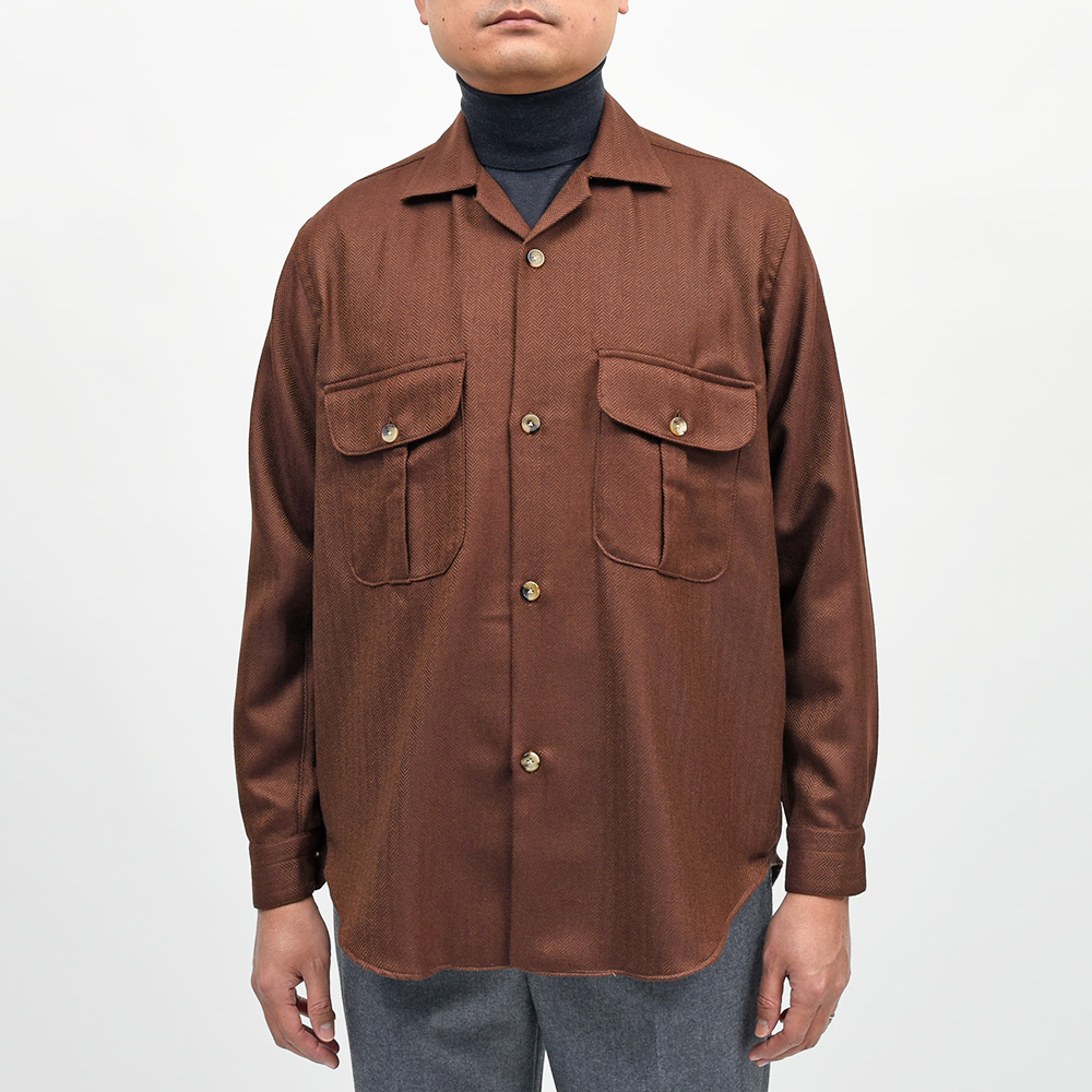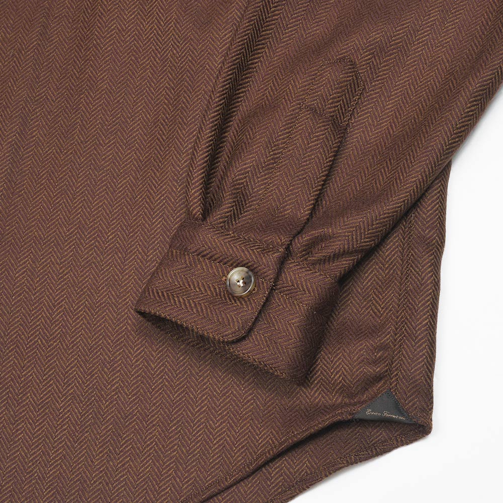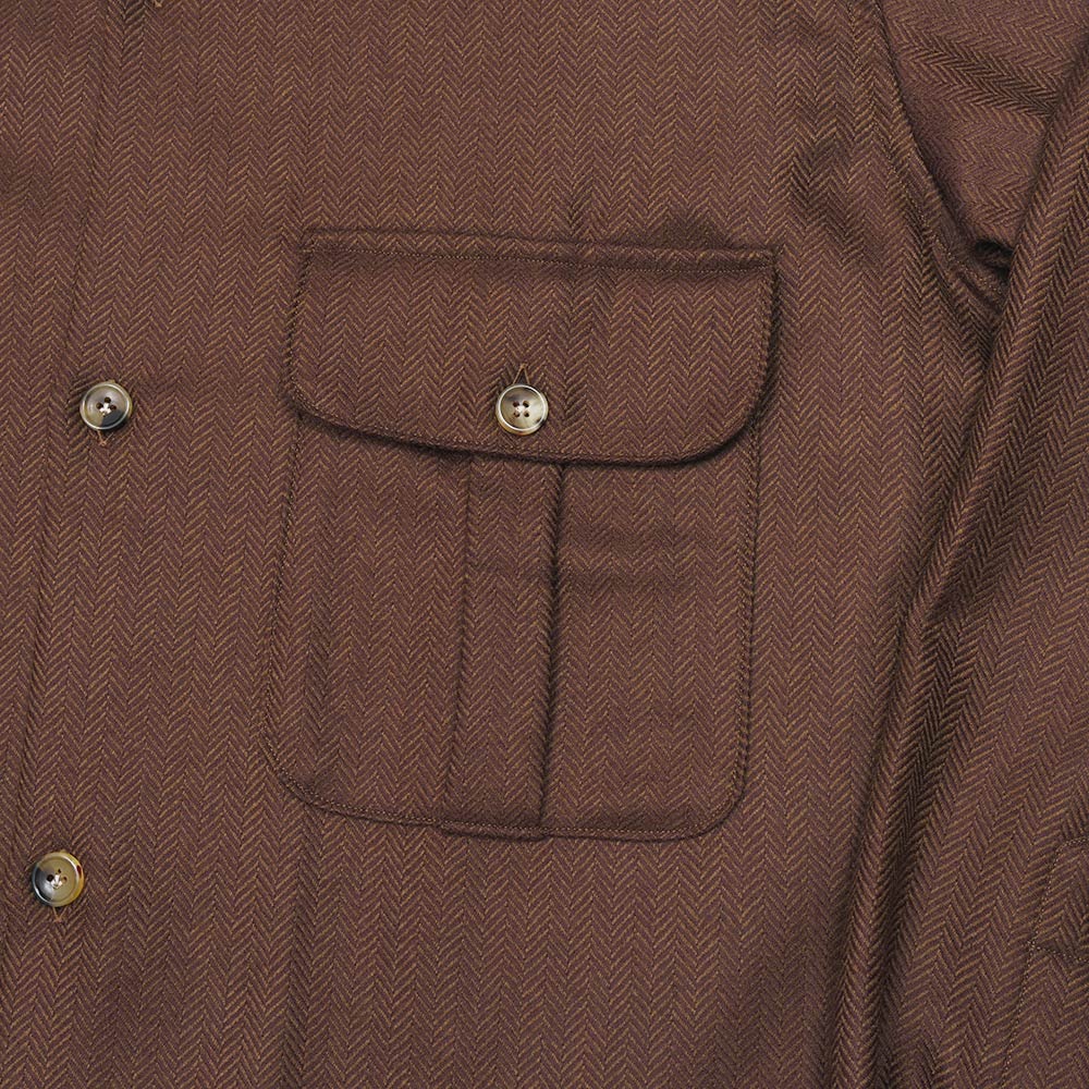 美しいな光沢感を持つ柔らかで滑らかな、薄手のフランネルを使用したシャツジャケット。上質な生地を使用しているため、ワークなデザインのシャツジャケットであっても上品に見え、デニムやチノパンのみならずウールスラックスなどとの相性も抜群。また、同色系統のカラーを使用したヘリンボーンがモダンな佇まいを生んでいます。端境期にはアウターとして、本格的な冬にはシャツインナーとしても活躍する一品です。