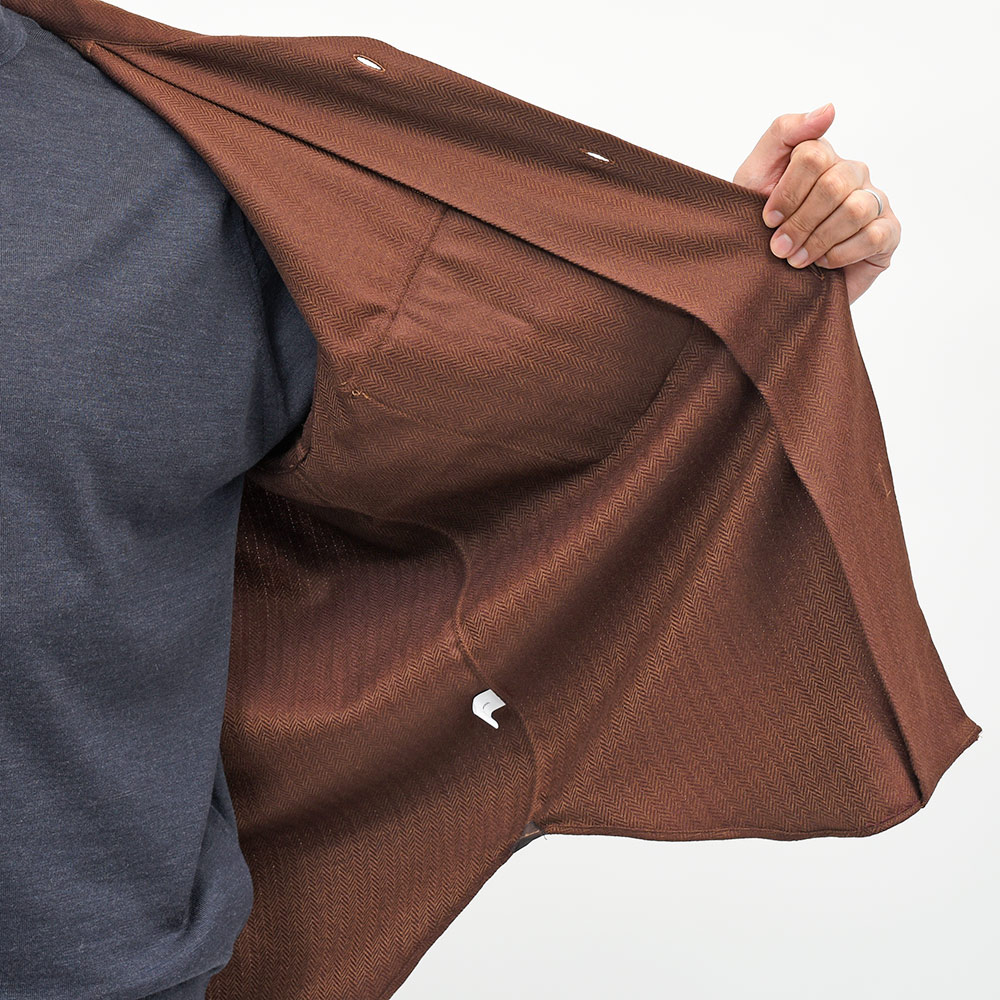 赤みのあるダークブラウンとカーキで構成されたヘリンボーンは、なんとも言えない魅力的な存在感を持っています。
