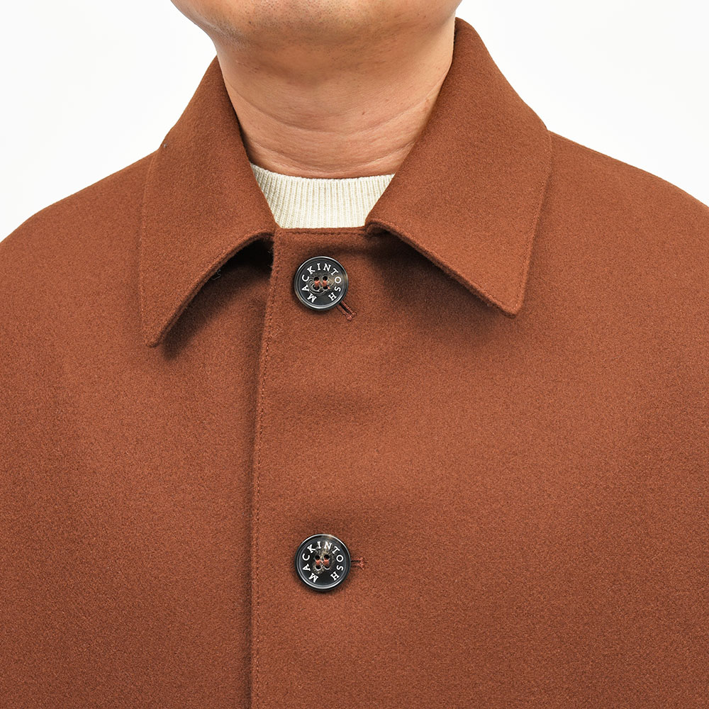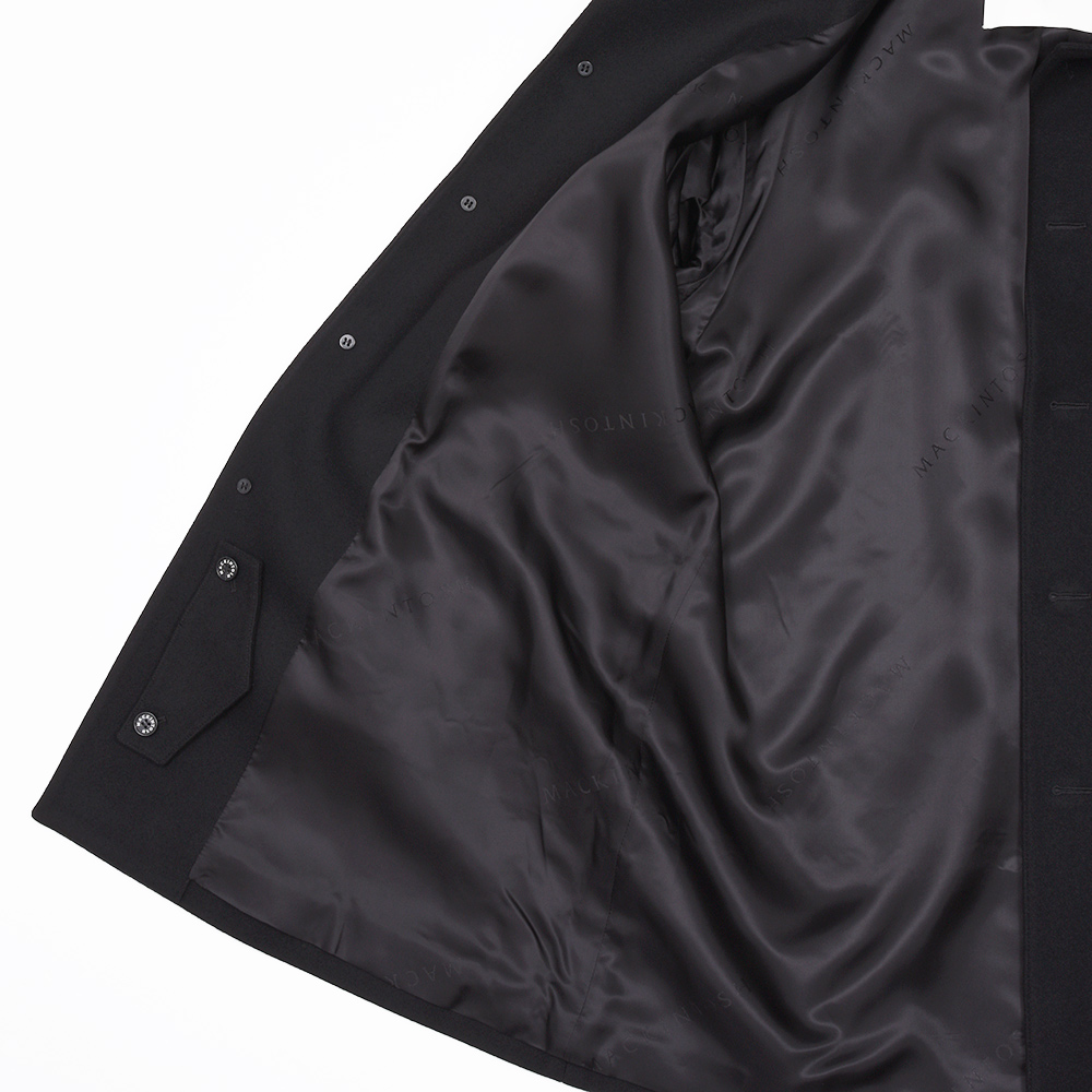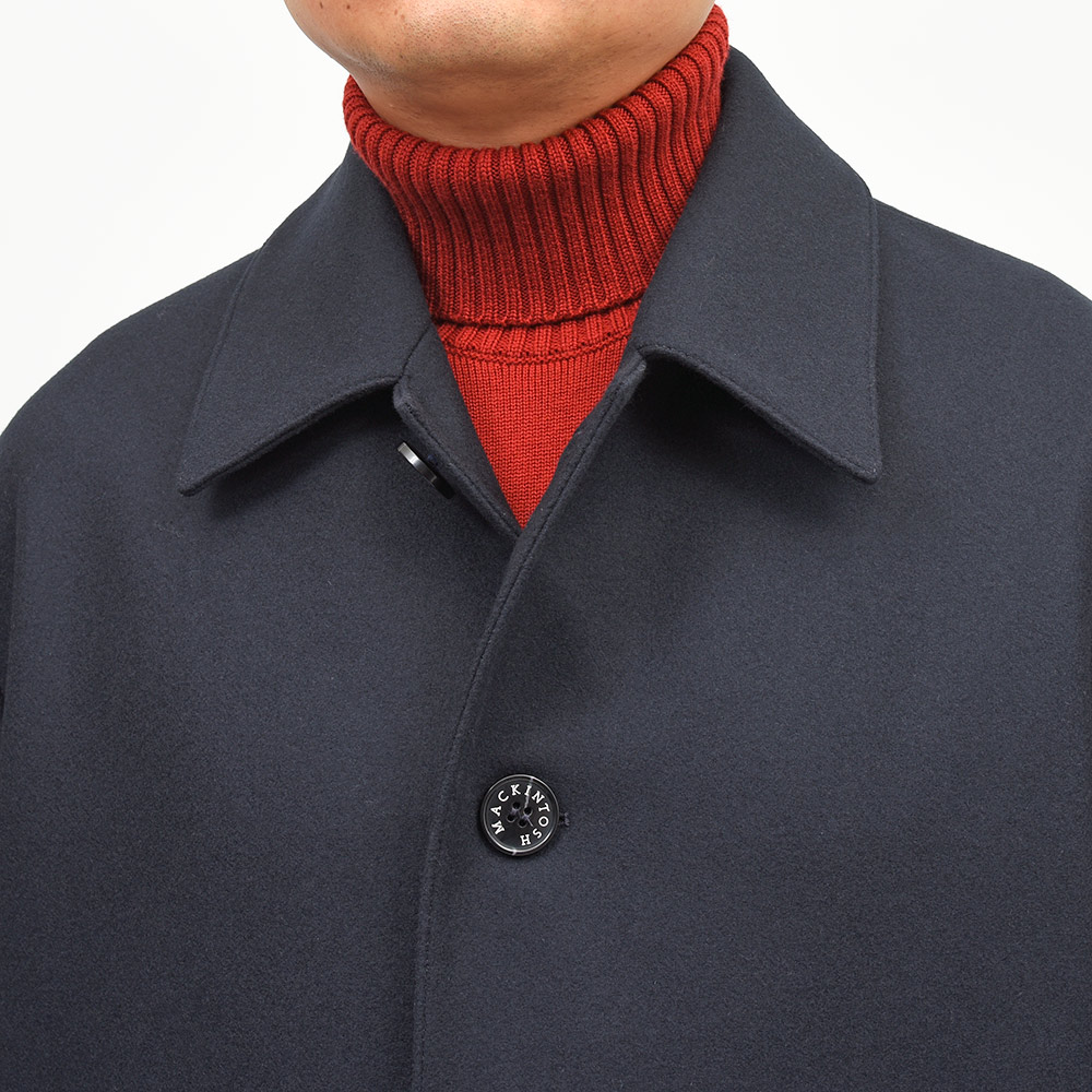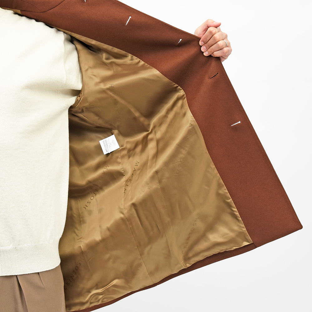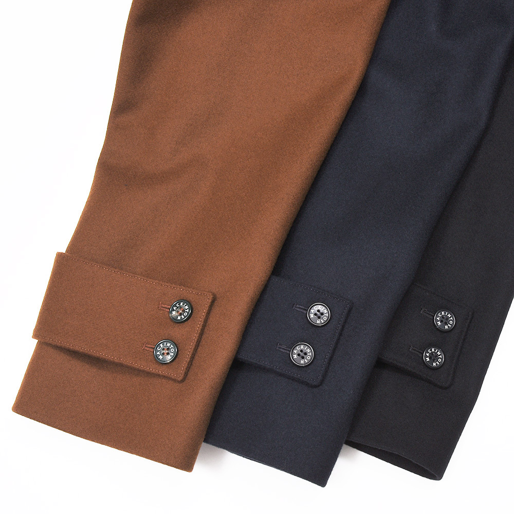 柔らかな質感としなやかな風合いを持つ、MACKINTOSHでは定番のウールメルトンを使用。バランスの取れた適度なウエイトのメルトンは、一般的なメルトンよりも軽く、用尺の多いコートであっても重量を感じずに軽やかに着られるよう仕上げられています。