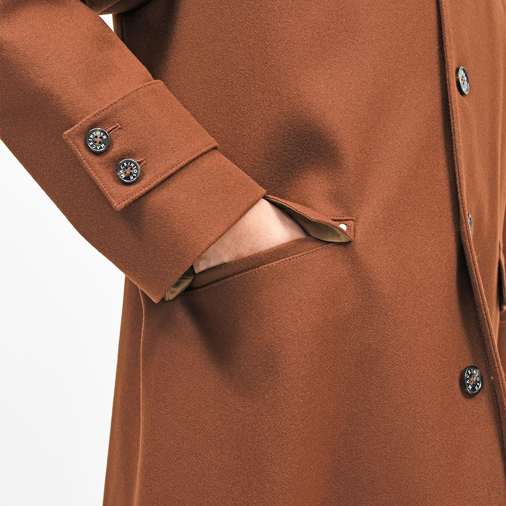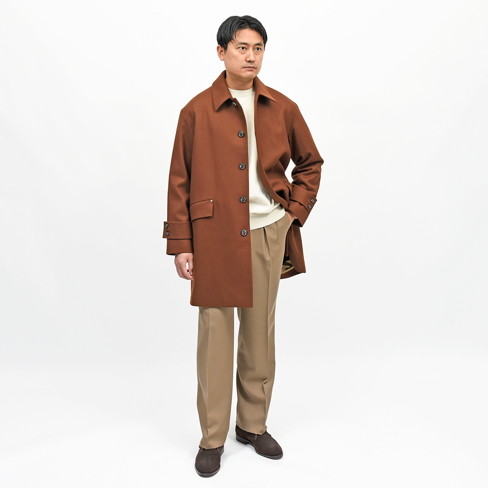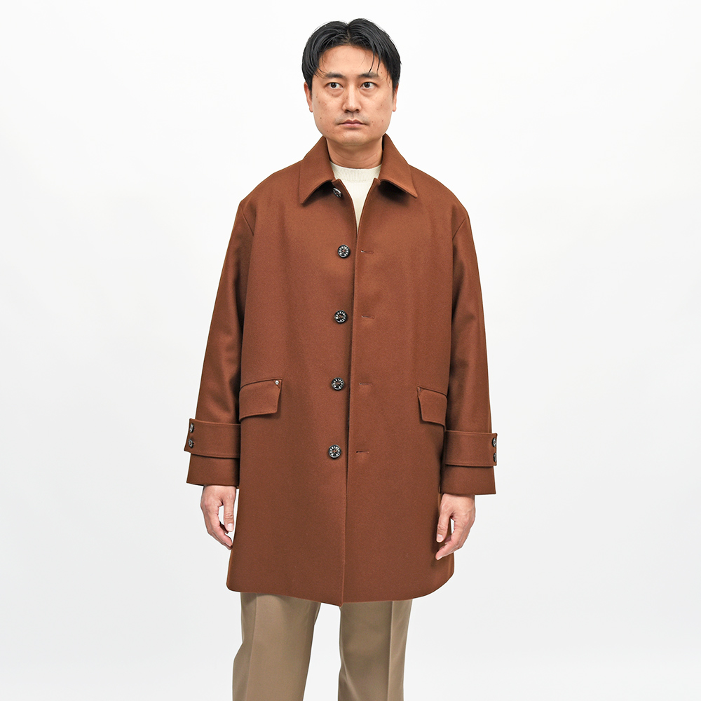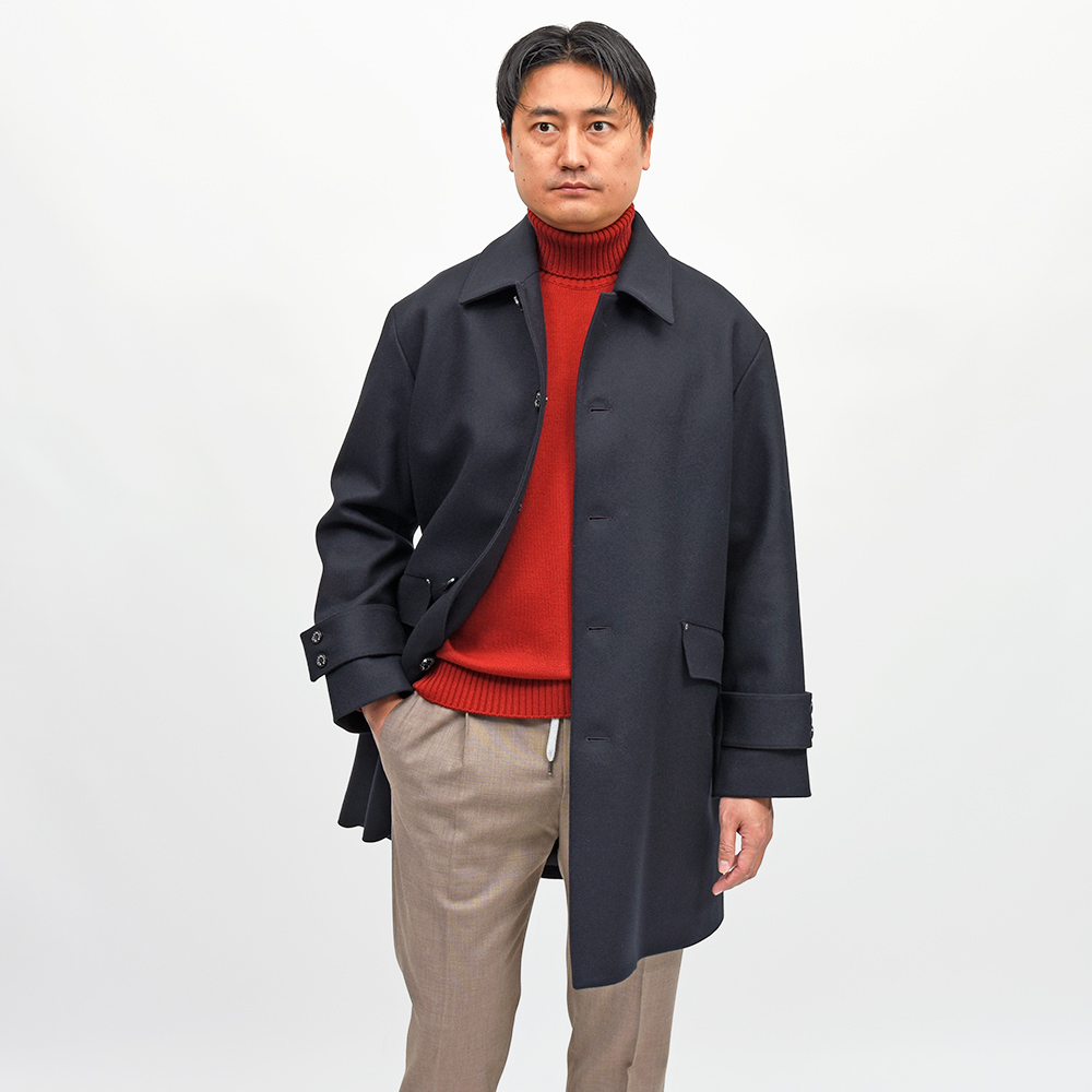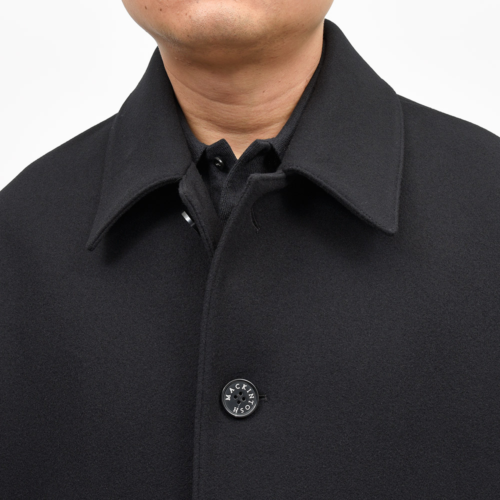 柔らかな質感としなやかな風合いを持つ、MACKINTOSHでは定番のウールメルトンを使用。バランスの取れた適度なウエイトのメルトンは、一般的なメルトンよりも軽く、用尺の多いコートであっても重量を感じずに軽やかに着られるよう仕上げられています。