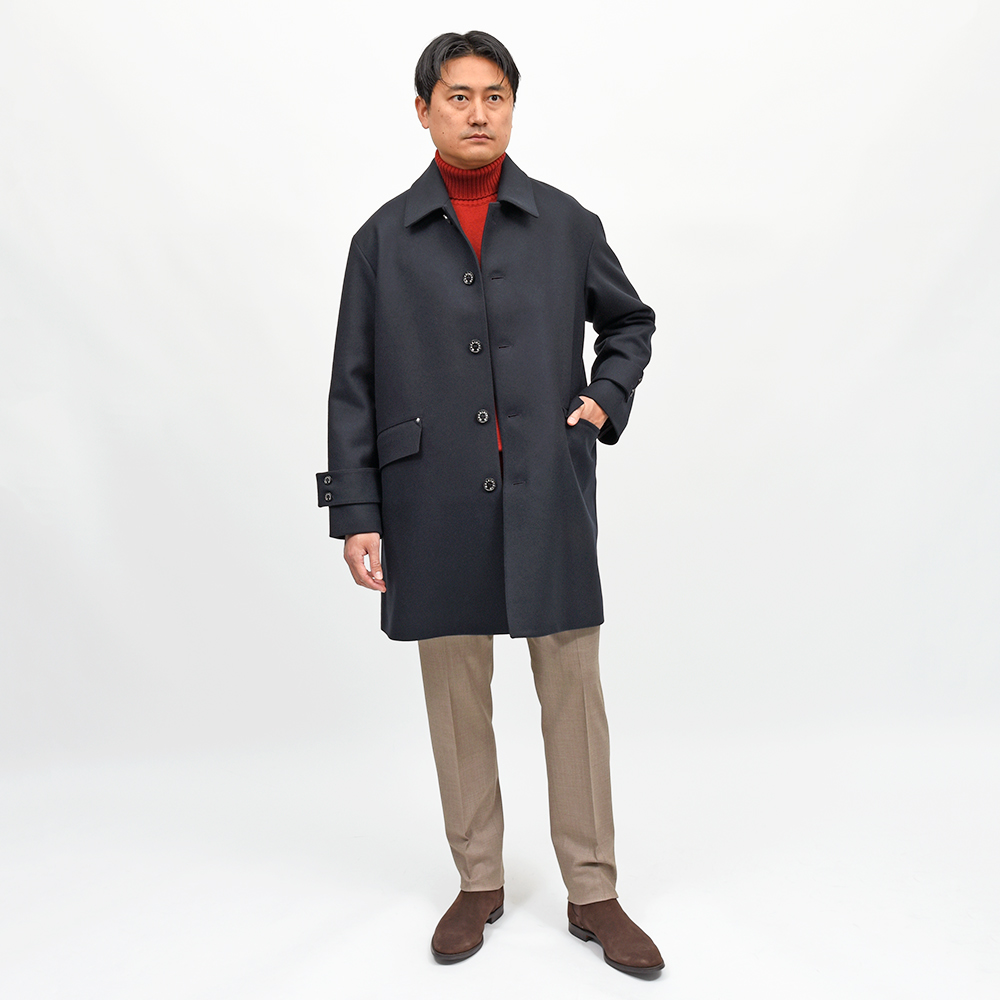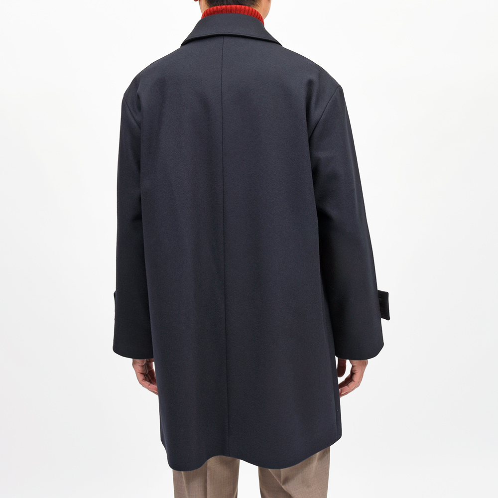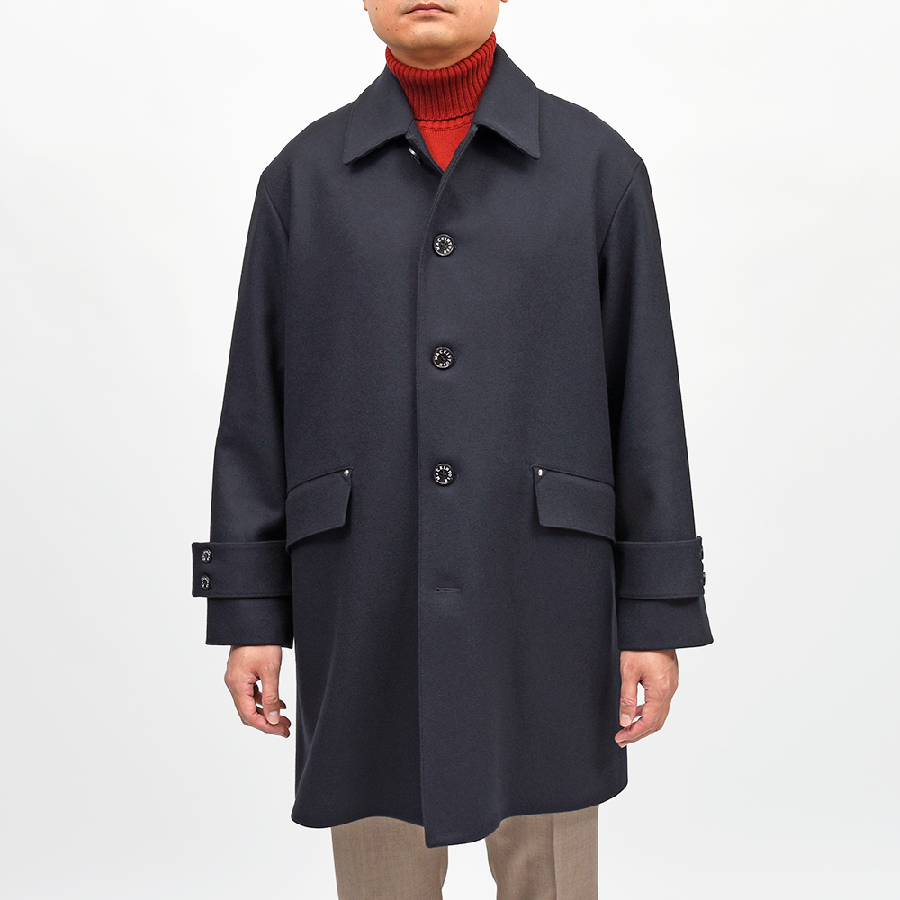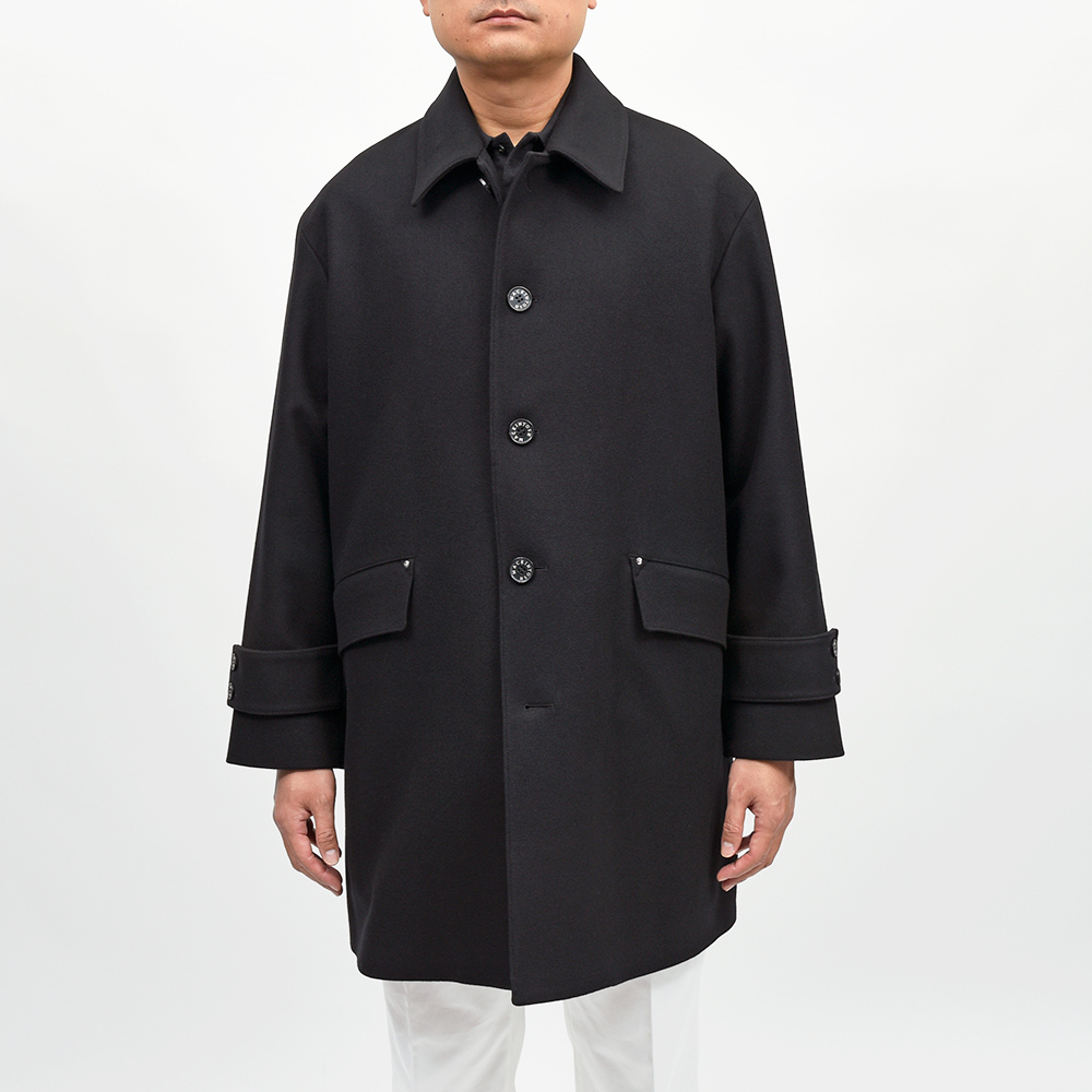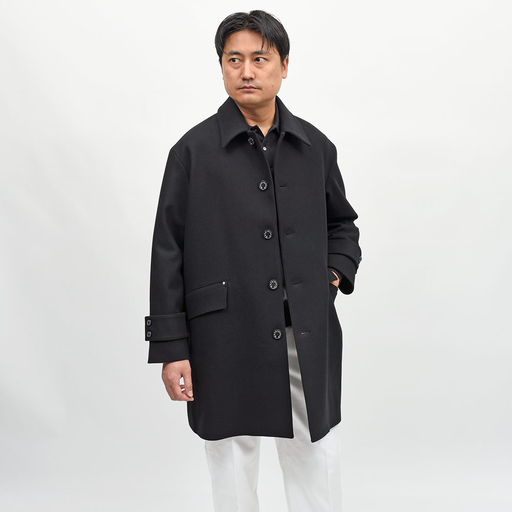 柔らかな質感としなやかな風合いを持つ、MACKINTOSHでは定番のウールメルトンを使用。バランスの取れた適度なウエイトのメルトンは、一般的なメルトンよりも軽く、用尺の多いコートであっても重量を感じずに軽やかに着られるよう仕上げられています。