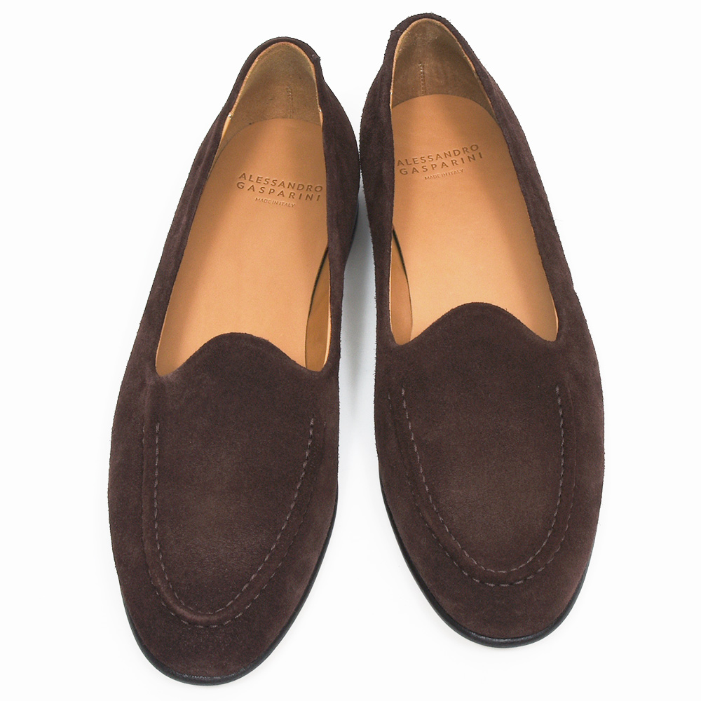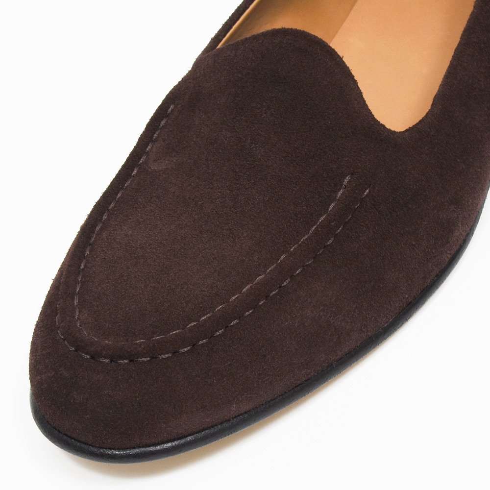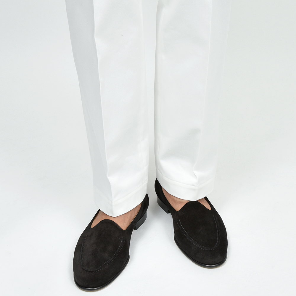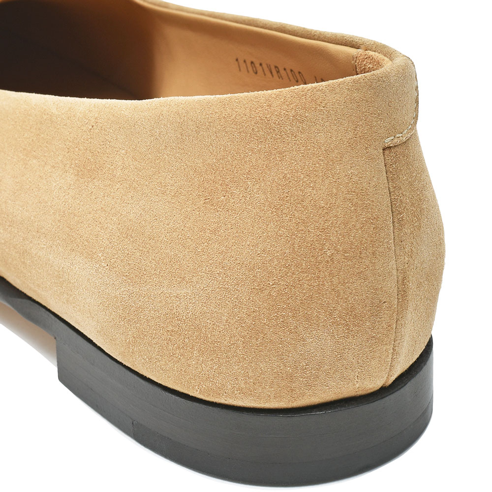 80年代のクラシックなローファーにインスピレーションを得たモデル“MOCASSO LOAFER”。セメント製法を用いることで丸みを帯び、足の甲の部分を露出させたスッキリとしたデザインが特徴です。独特な湾曲した履き口は足入れを滑らかにし、歩行中に踵をホールドする硬いヒールカウンターと、ヒールグリップにスエード素材を使用することで踵が抜けにくく非常に歩きやすい作り。また、アッパーの隠れた補強剤や、つま先に入れた柔らかいパフ、インソールレザーにはパッド入りのフットベッドといった、日常的に履きやすい快適性が確保されています。