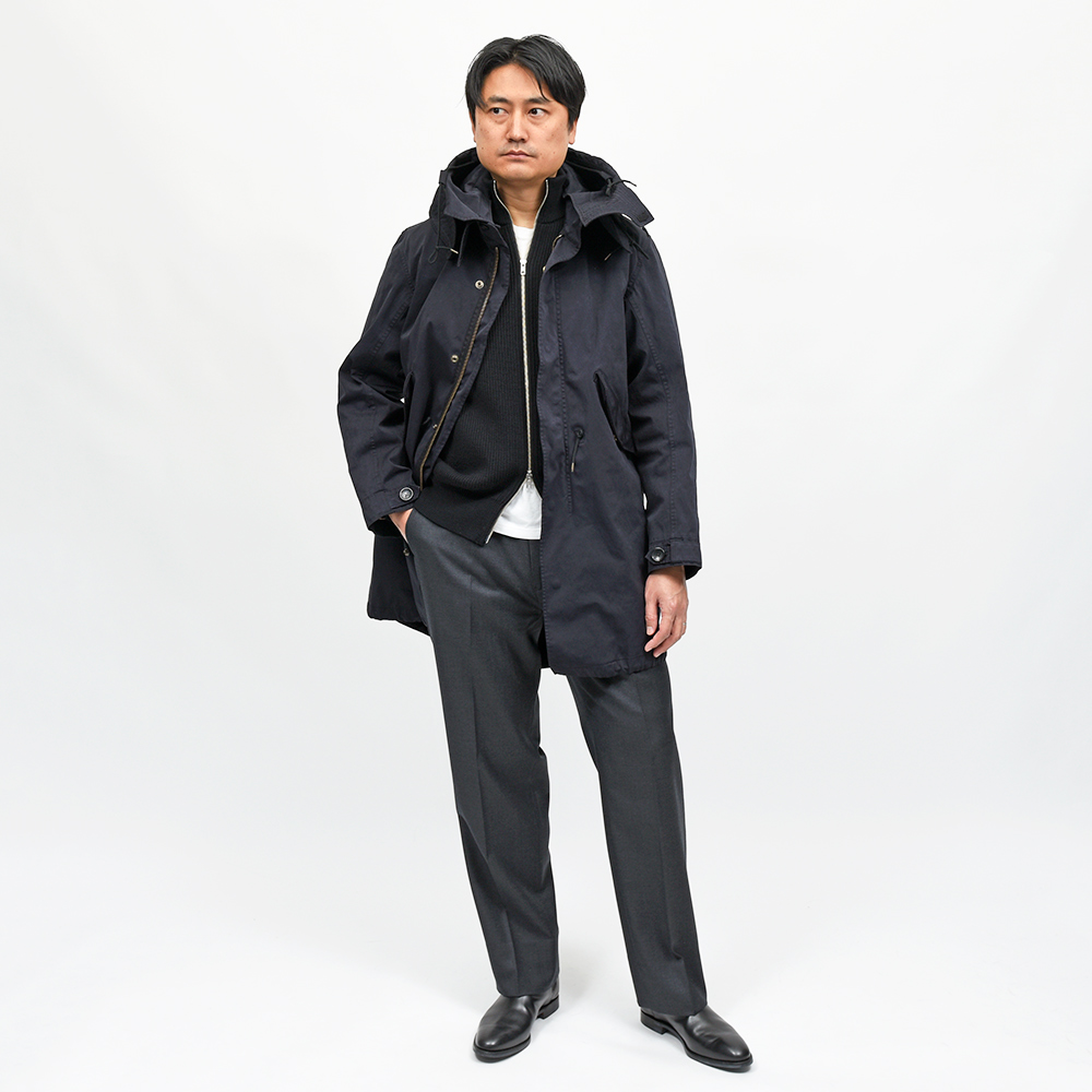 サイズ48でインナーにドライバーズニットを着て、肩早野ドロップしていて身幅にもゆとりのあるシルエットです。ややタイトめならワンサイズ下げたサイズ46でも着用でき、オーバーサイズな印象で着るならサイズ50でも大丈夫そうです。ライナーの取り付けなども考えるとサイズ48がベストです!