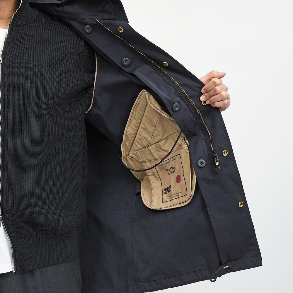 モデル“PARKA”はポールハーヴェイが、ブランドを立ち上げるにあたって一番初めに構想したと言われる定番モデルになります。1950年代にアメリカ軍で採用されていたM51(通称モッズコート)。フードのワイヤーや、襟の補強ステッチといったディティールを忠実に再現しています。フードは着脱可能となっており、また別売りのダウンライナーを取り付けることで冬でも着用可能な仕様となっています。