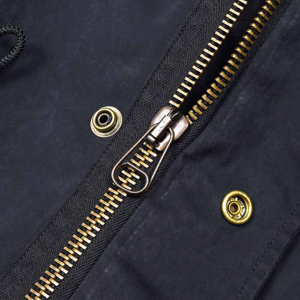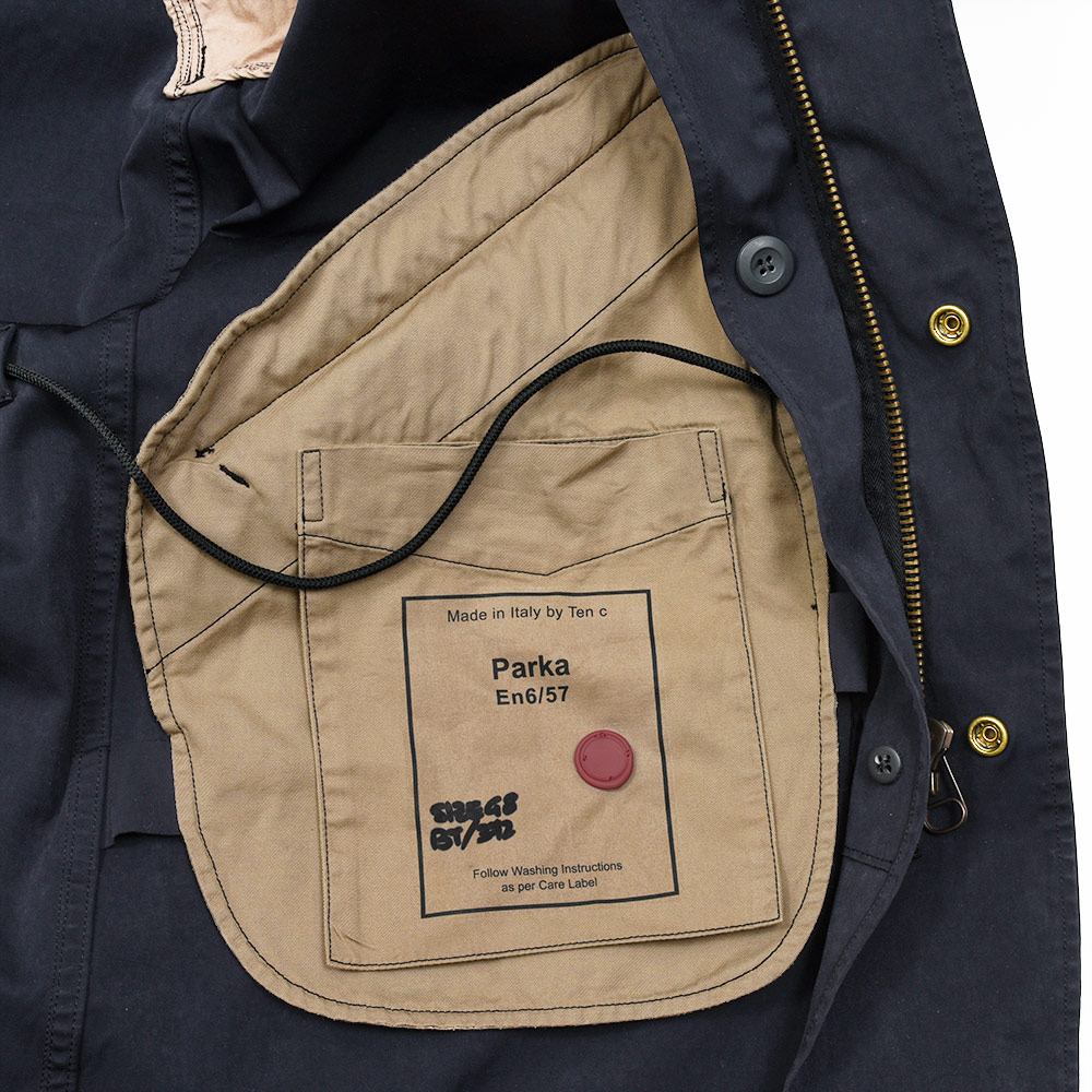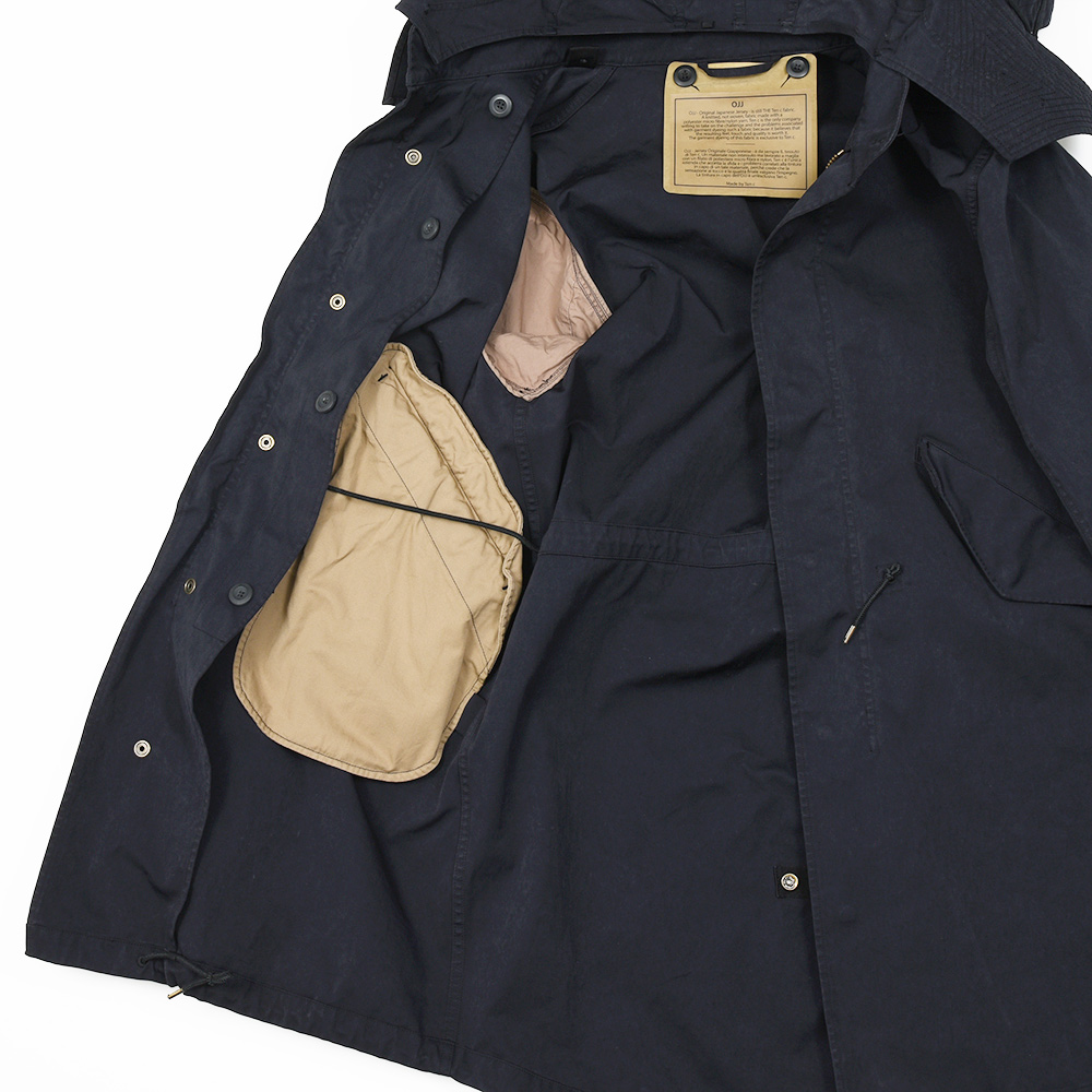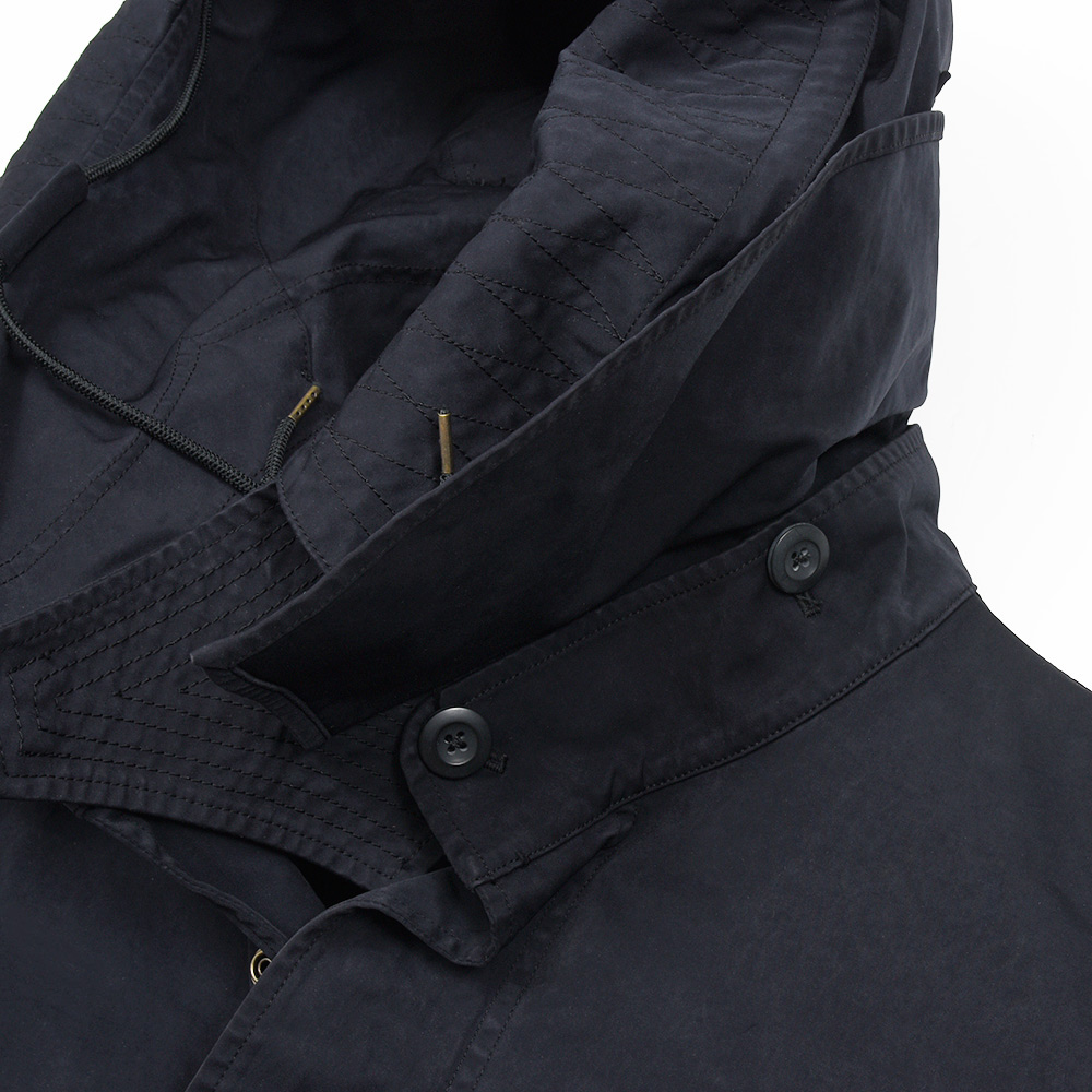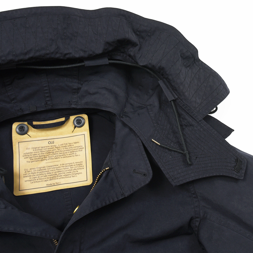 日本の生地メーカー小松精練と共同で開発されたこちらの高密度ナイロンベンタイルミリクロスは、寒さ・風・雨を完全にシャットアウトしながらも通気性のある、通称“OJJ(Original Japanese Jersey)”と呼ばれる超高機能素材。化学繊維でありながらも着込むほどに経年変化が起こり、柔らかく、シームにはパッカリングを起こし、水洗いも可能です。現在ではイタリアの陸軍に正式に採用される程。さらにこちらの生地をイタリアへ持ち込み、イタリアで唯一ナイロン・ポリエステルの混紡生地を製品染めできる工場で製品染めを行う拘りよう。これだけの手間暇をかけることで、正真正銘“一生モノ”と言える一着を作り上げていきます。