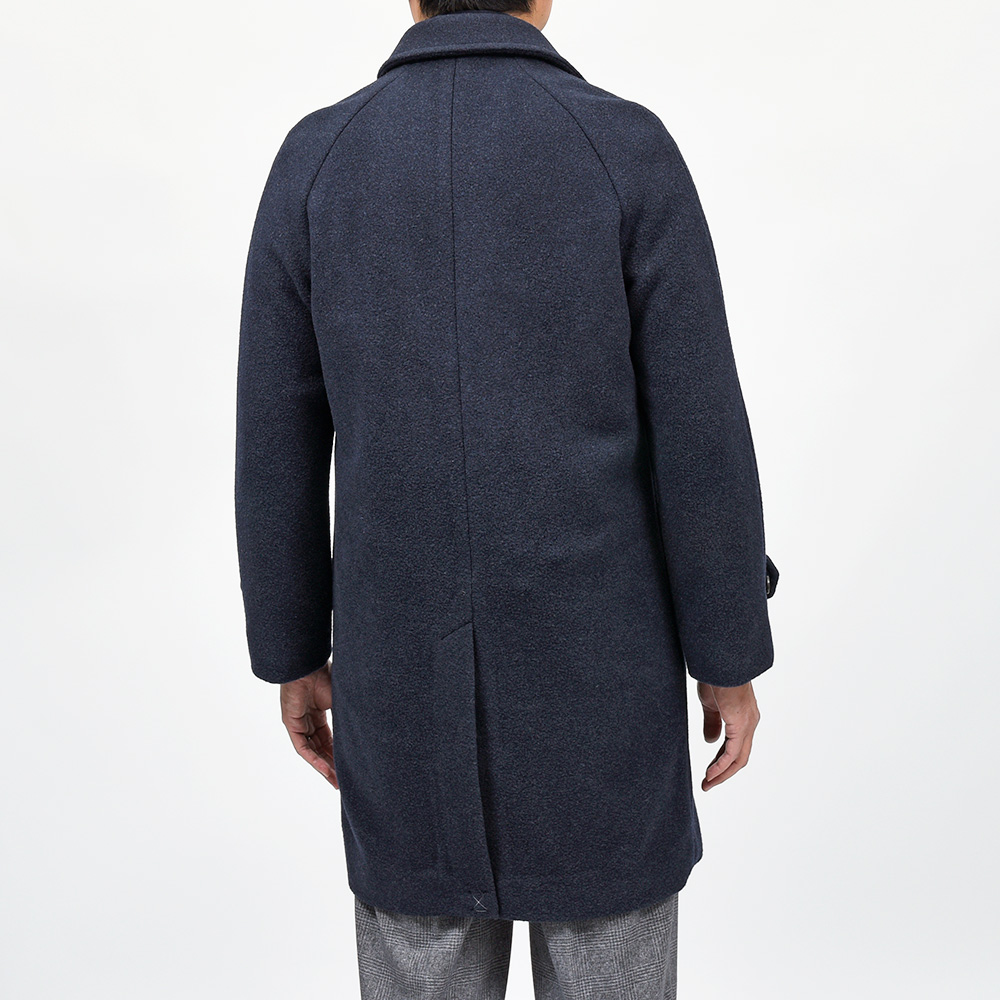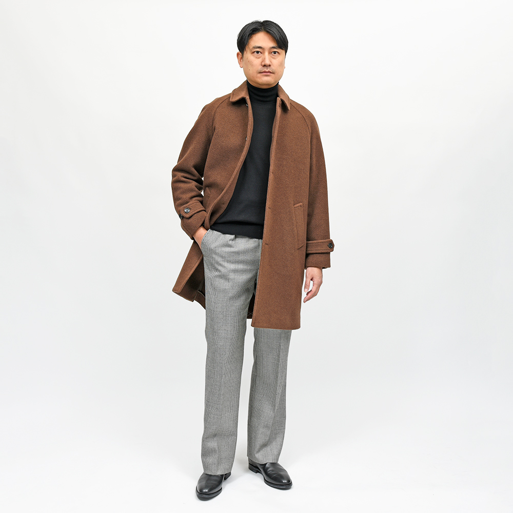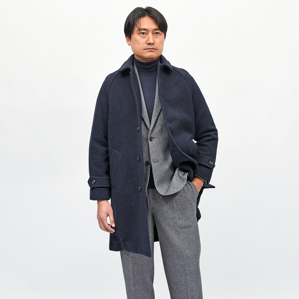 ウールにカシミヤを混紡したリッチな手触りと、凹凸のある生地感がクラス感のある佇まいを生んでいます。