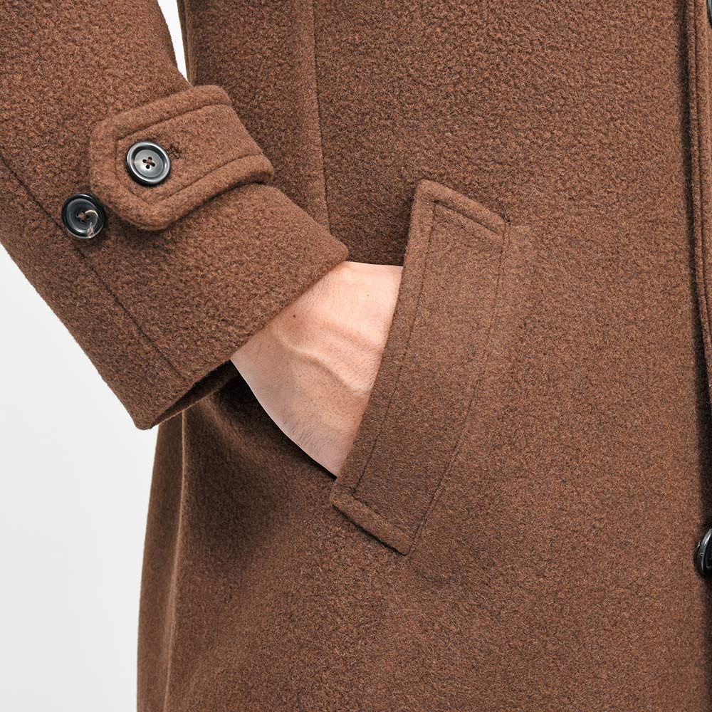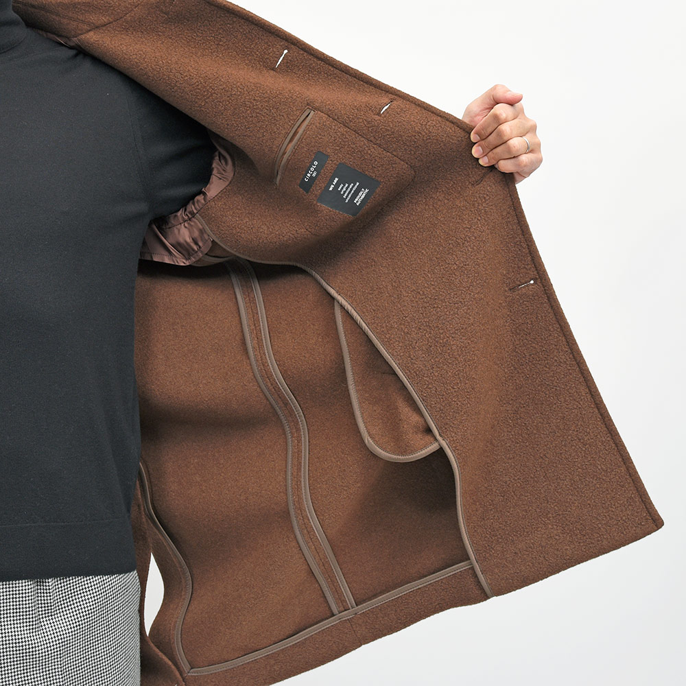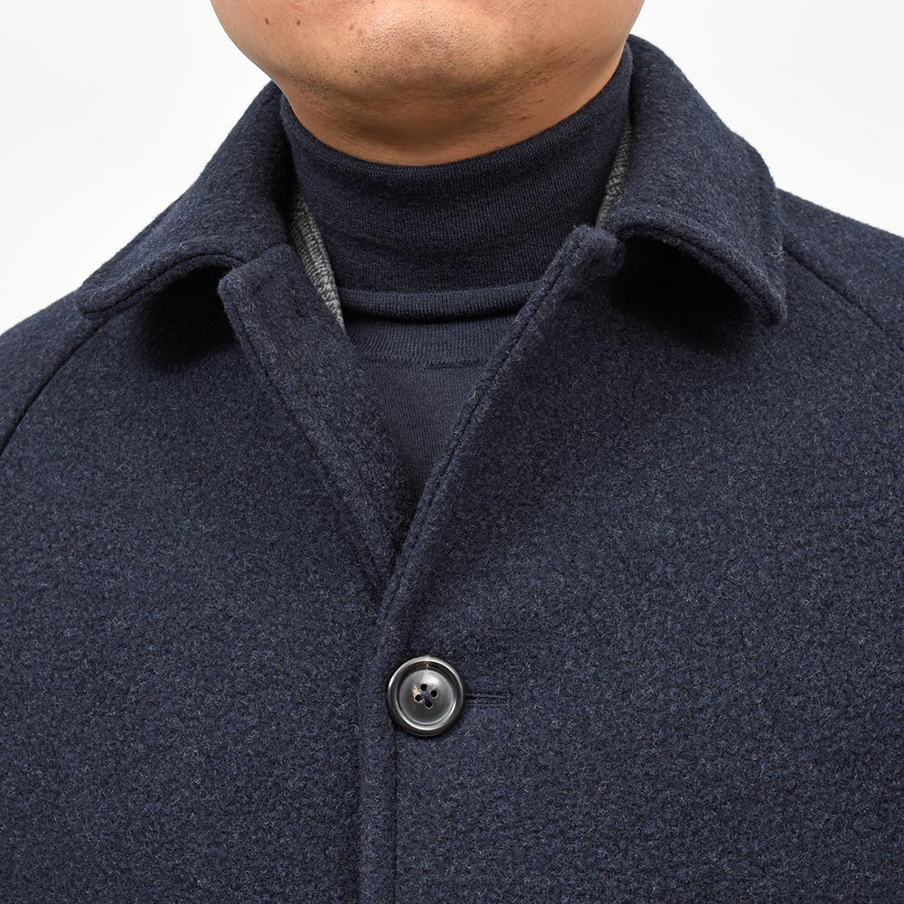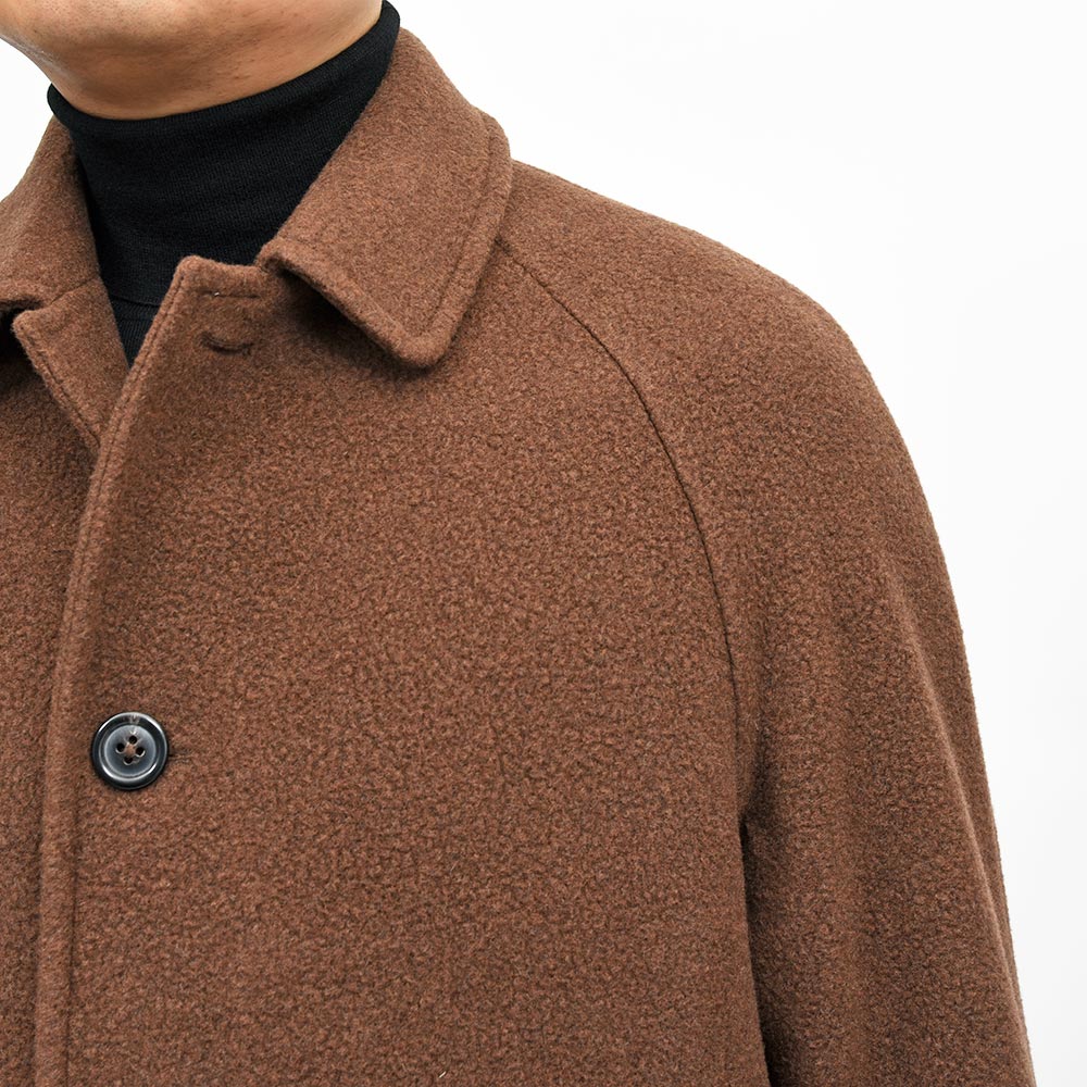 ウールにカシミヤを混紡したリッチな手触りと、凹凸のある生地感がクラス感のある佇まいを生んでいます。