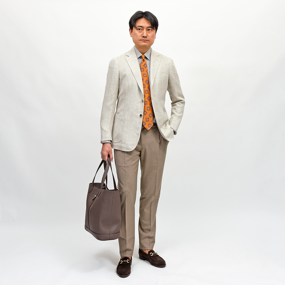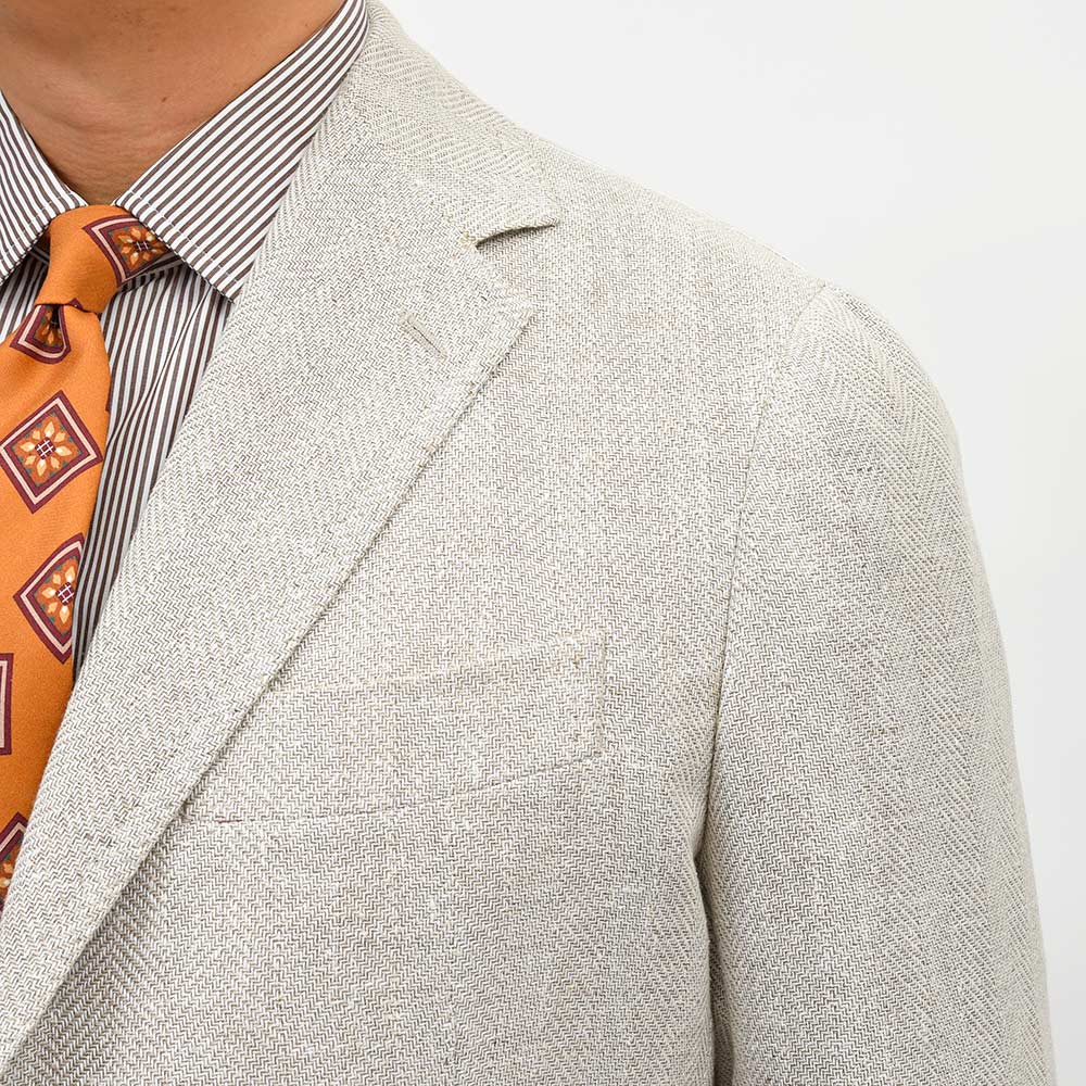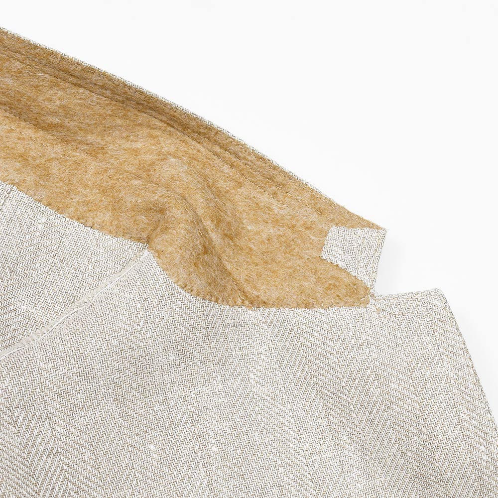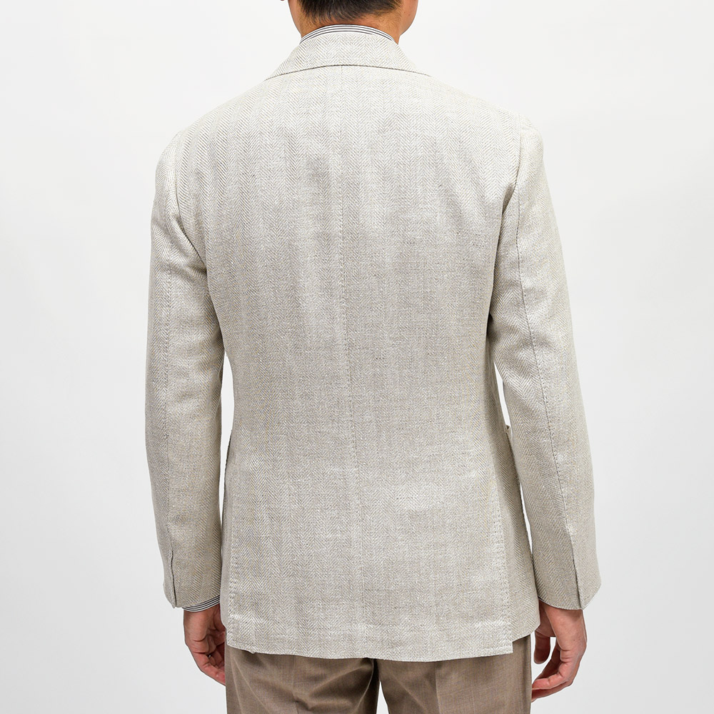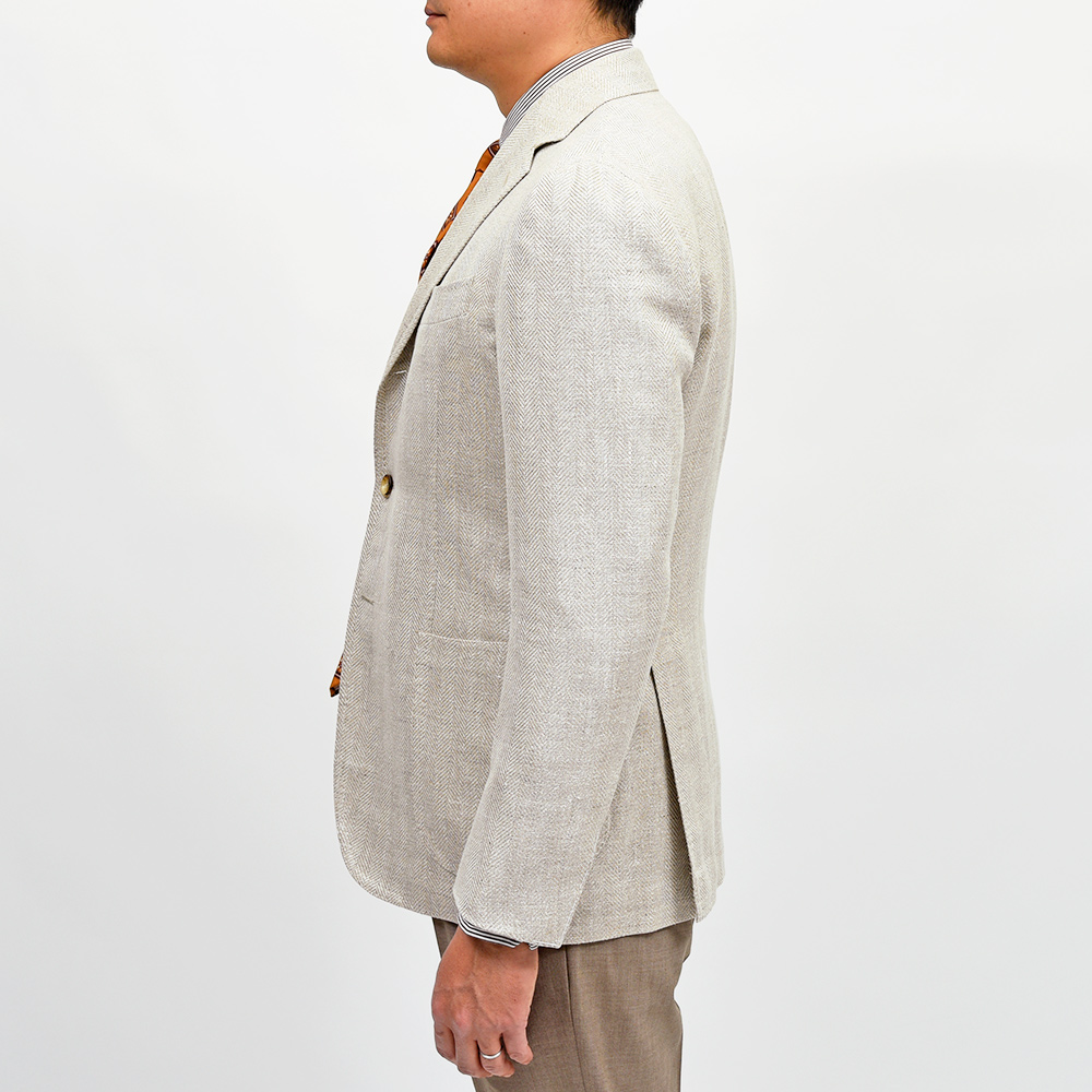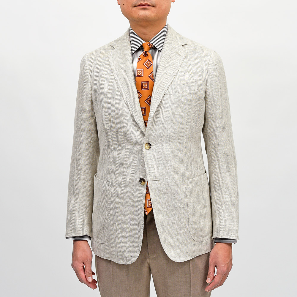 目付け290gのリネン×シルク×ウール×コットン素材を使用したヘリンボーンジャケット。こちらは春夏にピッタリなドライなタッチの質感を持ち、ホワイトやベージュ・グレーベージュをミックスした色使いが、清涼感と奥深さを合わせ持った一着となっています。