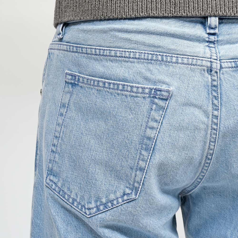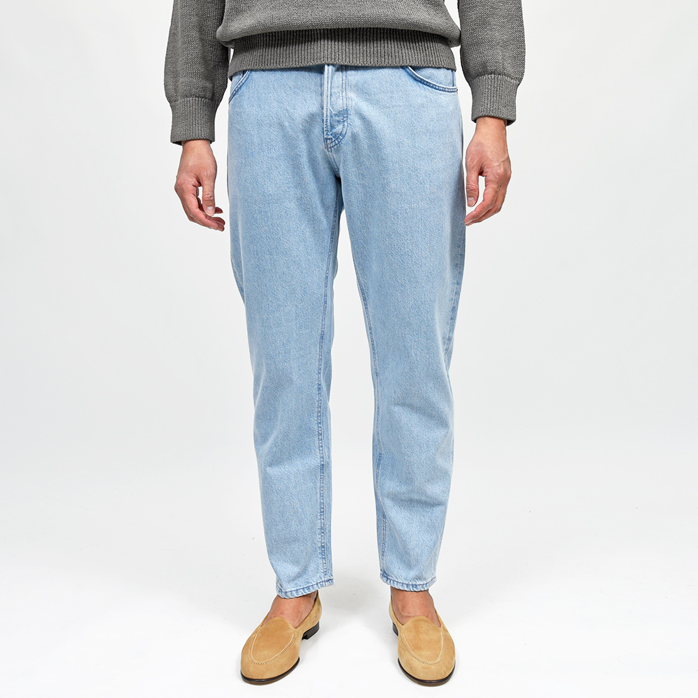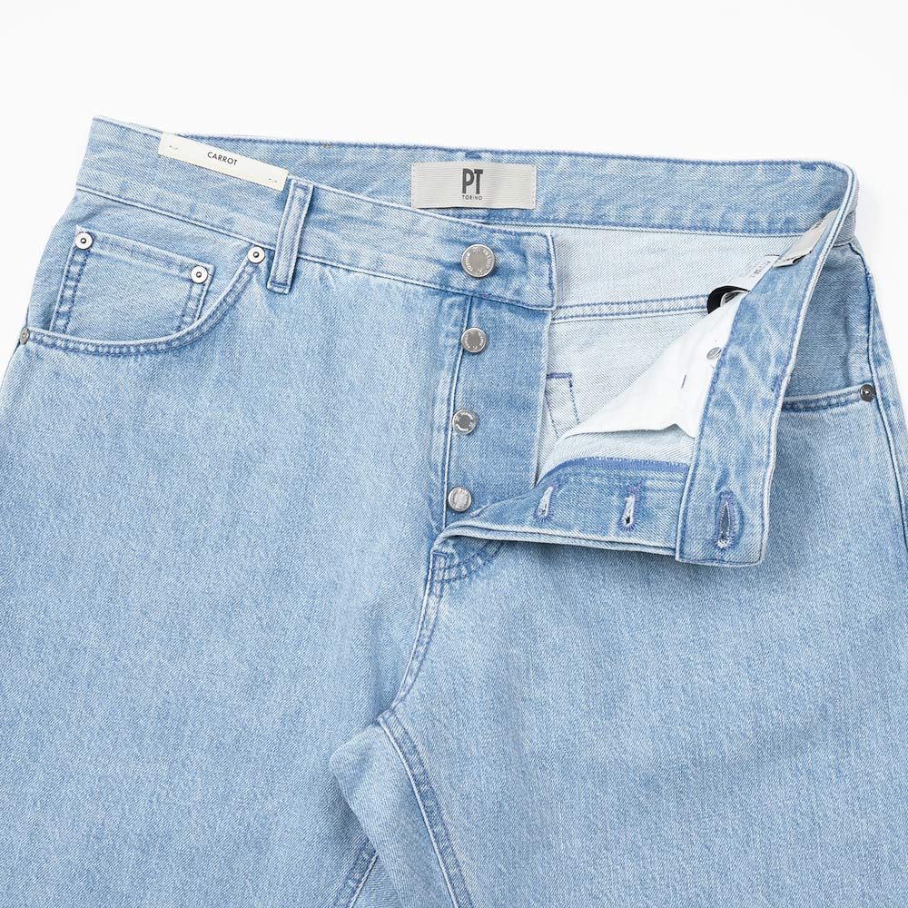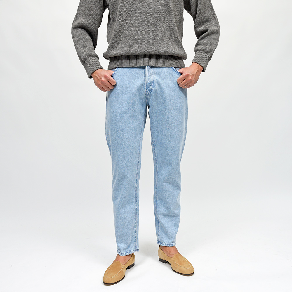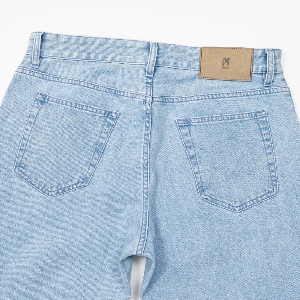 PT TORINO DENIMでは非常に稀なストレッチなしのコットン100%ファブリックを使用したこちらは、緩めのシルエットの入門編として人気を誇る定番モデルの“REBEL”。ブリーチ加工を施したライトなトーンのブルーデニムは、抜け感のあるカジュアルな雰囲気を作り上げます。シルバーのボタン&リベットに、同色系統のブルーのステッチ使いは上品な佇まい。さらに高級感のあるスエードの革パッチが大人の色気を演出してくれます。