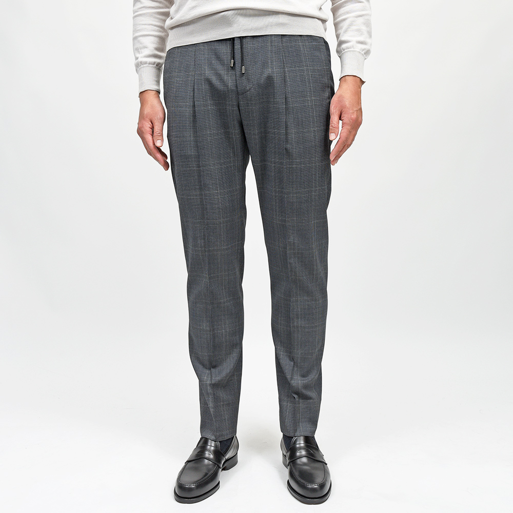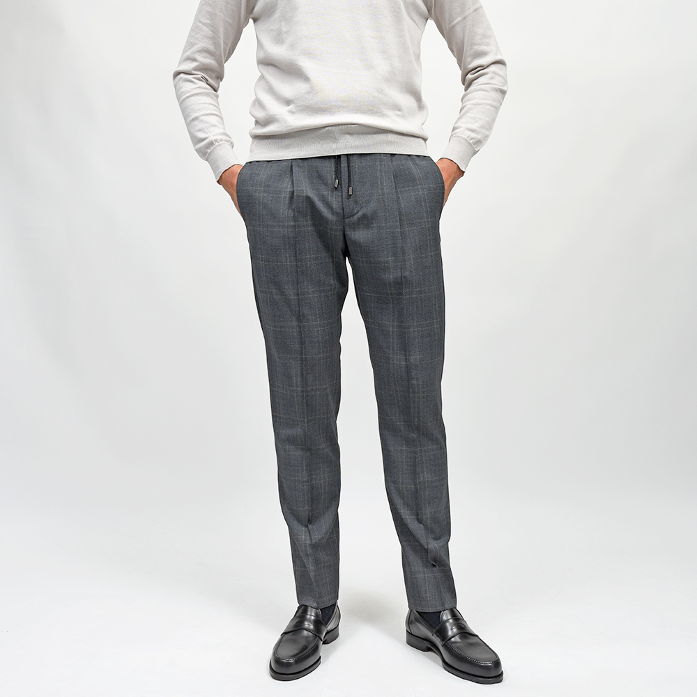 MASACCIOはフロントクリースをステッチで抑えることで、美しいラインがいつまでも続く永遠を約束された特別な一本です。ウエストのサイドにはゴムが入っており、ウエストは4cmほど伸縮してくれるリラックスした穿き心地。ドローコードは内側に隠すことができるため、ベルトを巻くとビジネスにも対応する、リラック顔にもドレス顔にも変化の効く万能なアイテムです。