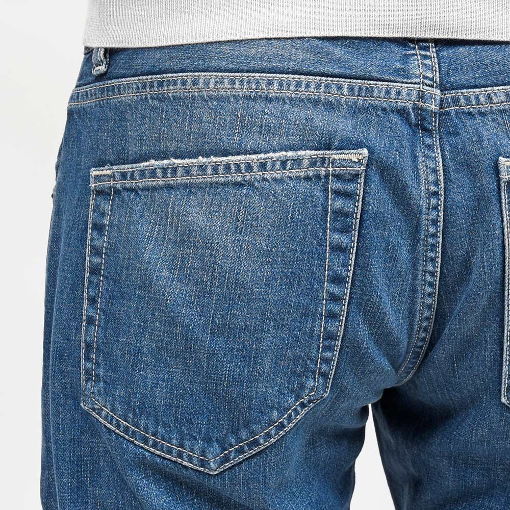 ミディアムな色落ちのインディゴデニムは、程よいアタリ感が使い勝手の良い一本。また、ポリウレタンを混紡していないコットン100%のファブリックを使用していますので、エイジングを楽しめ非常に長い期間着用できます。ガンメタリックのボタン&リベットに、ベージュ色のステッチ、高級感のあるスエードの革パッチが大人の色気を演出してくれます。