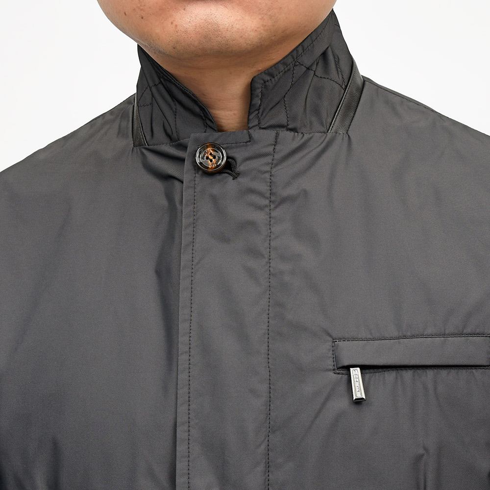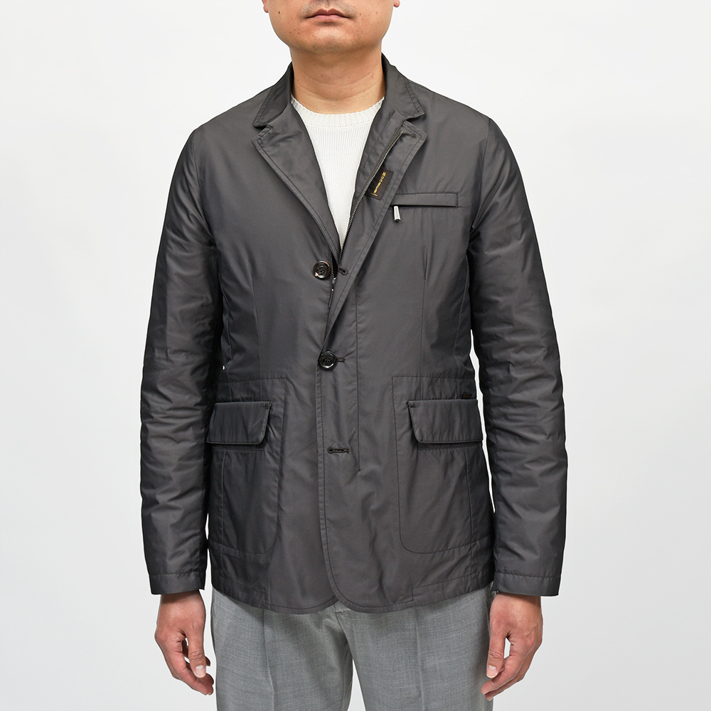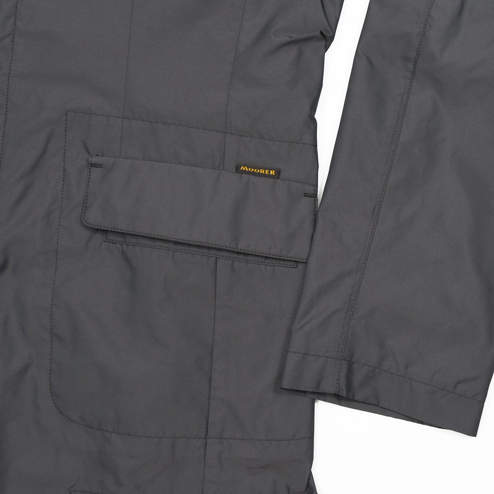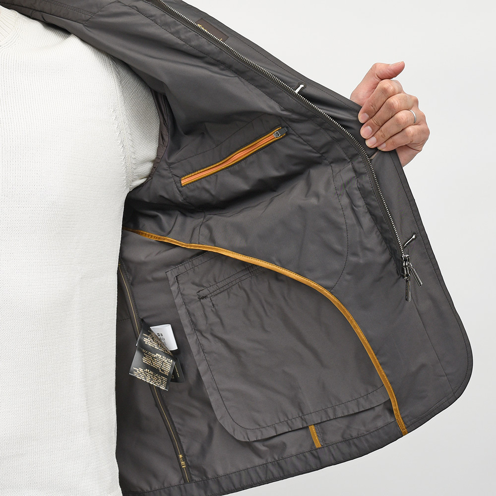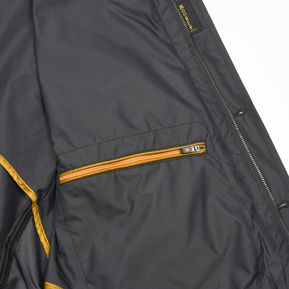 特注のスナップボタン、ファスナーやホーン釦などの拘りに、裏地のナイロン素材の美しさ加えてパイピング処理を施した丁寧な仕上げ。MooRERのアウターに死角はありません。