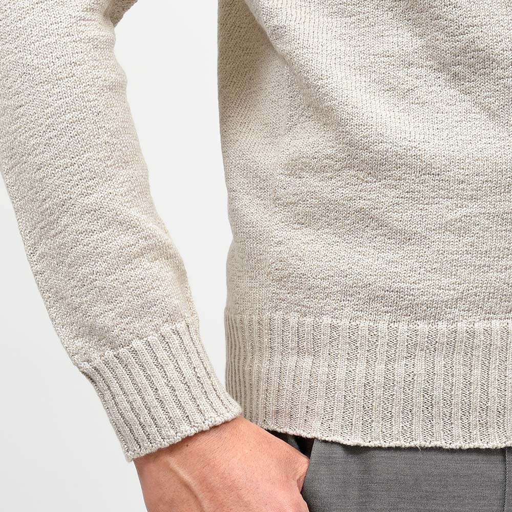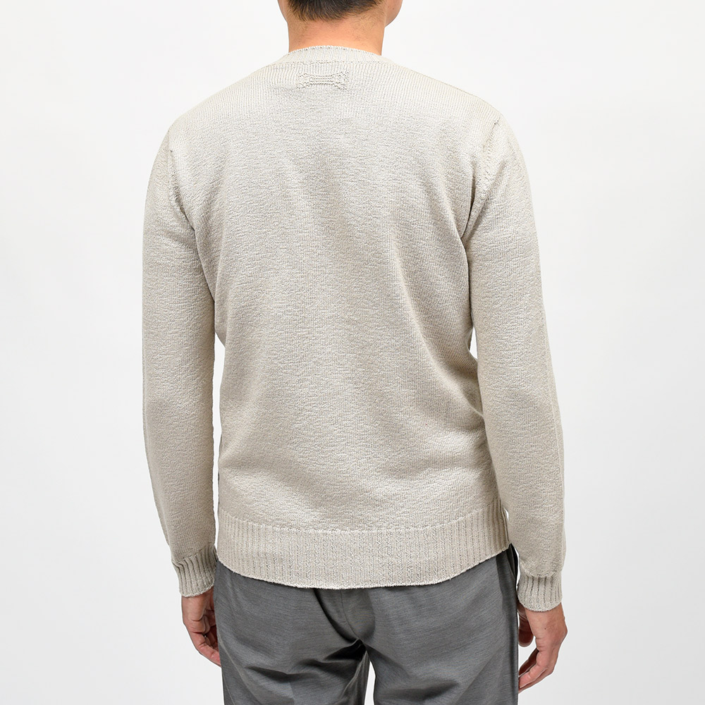 最高級の綿糸を使用したミドルゲージニット。独自の縮れを持ったブークレ調の綿糸は編み上げることで凹凸感が生まれ、それによってふっくらとした表情と、サマーニットとしては秀逸なサラリとした肌触りを両立しています。Drumohrが得意とするホールガーメントによる極上の着心地と合わさることで、この上ない着用感を味わうことができます。