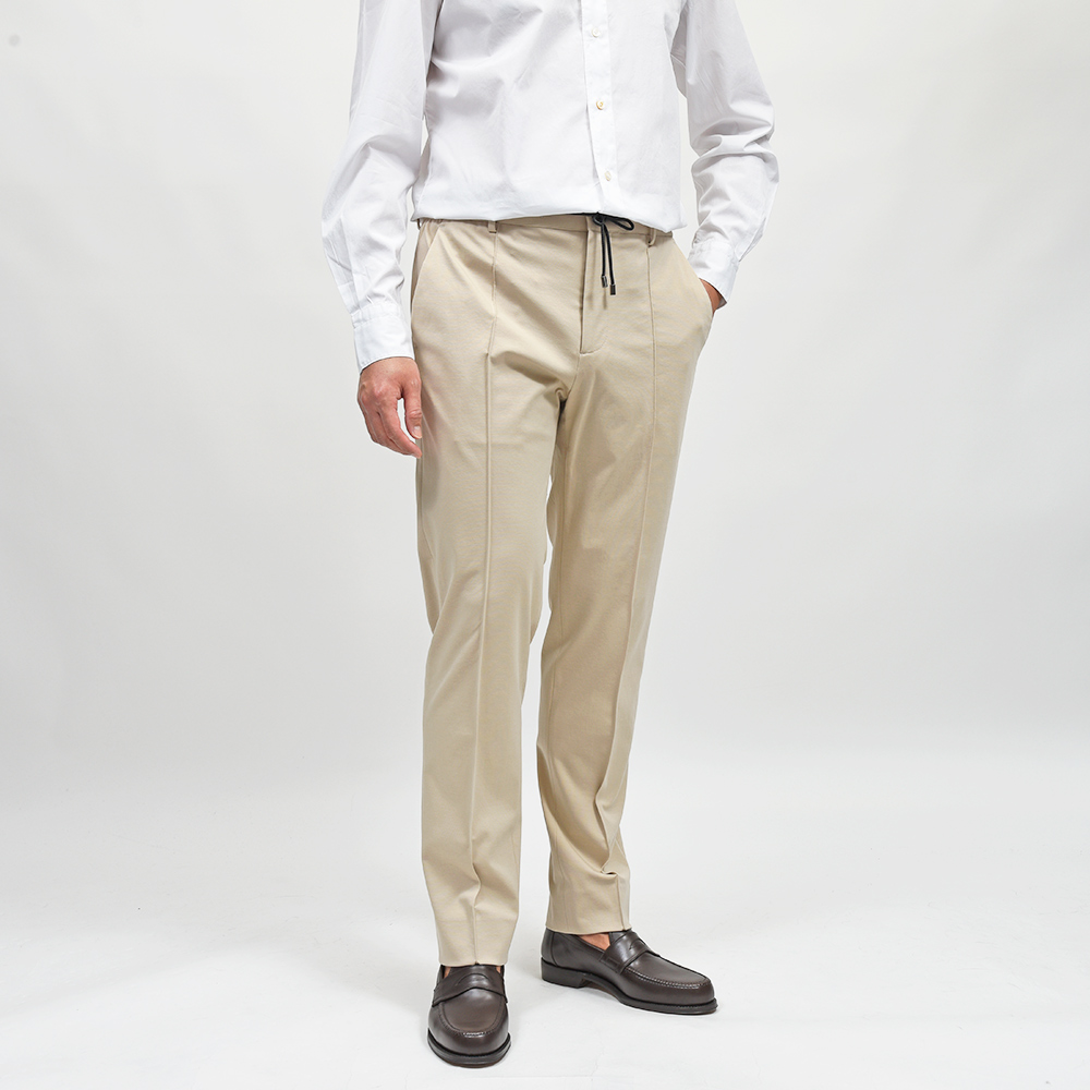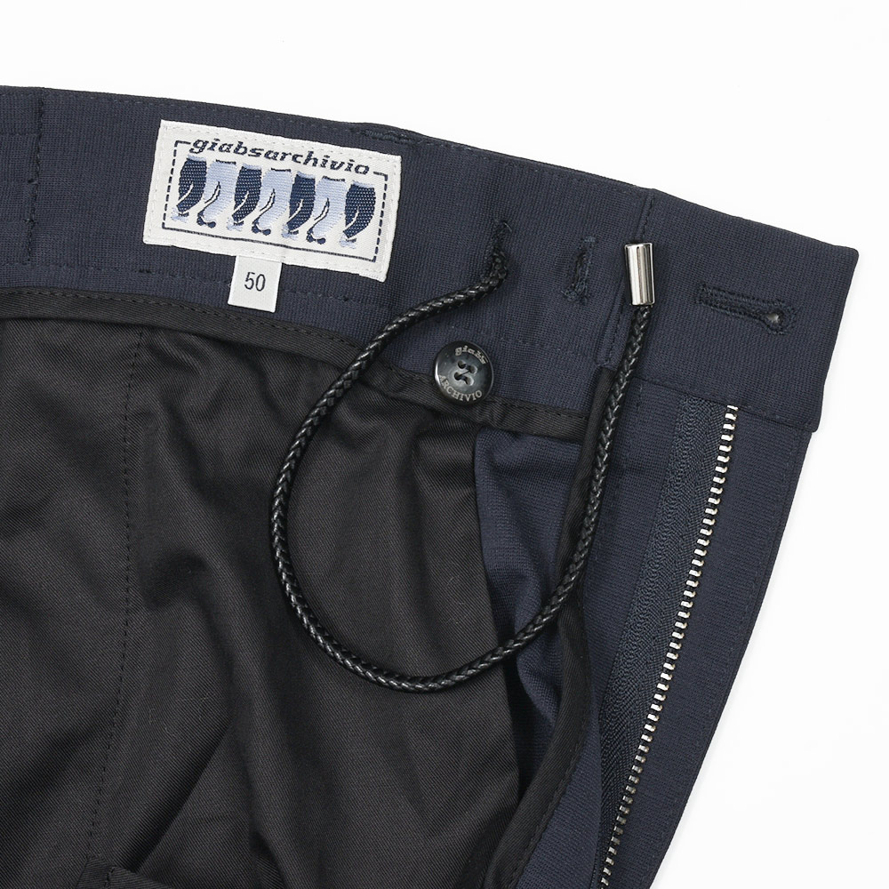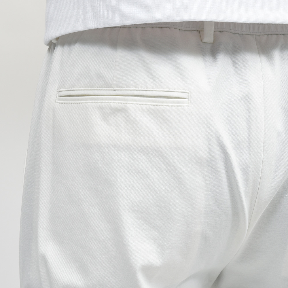 MASACCIO/3GはMASACCIOの特徴である永久クリースや、内側に隠せるドローコードなどのディティールを継承しつつも、現代的なフィッティングに再解釈したモデルになります。こちらの別注モデルでは、通常ウエストのサイドのみに施されたゴムを、後半身がシャーリング仕様となりより高い伸縮性を持たせています。